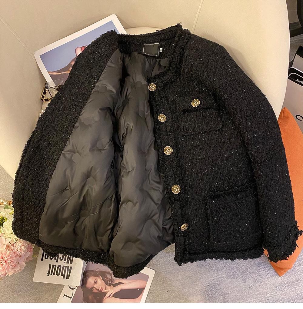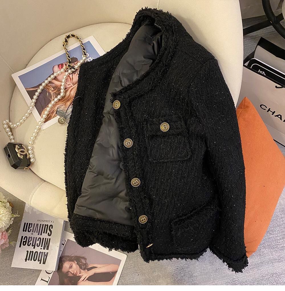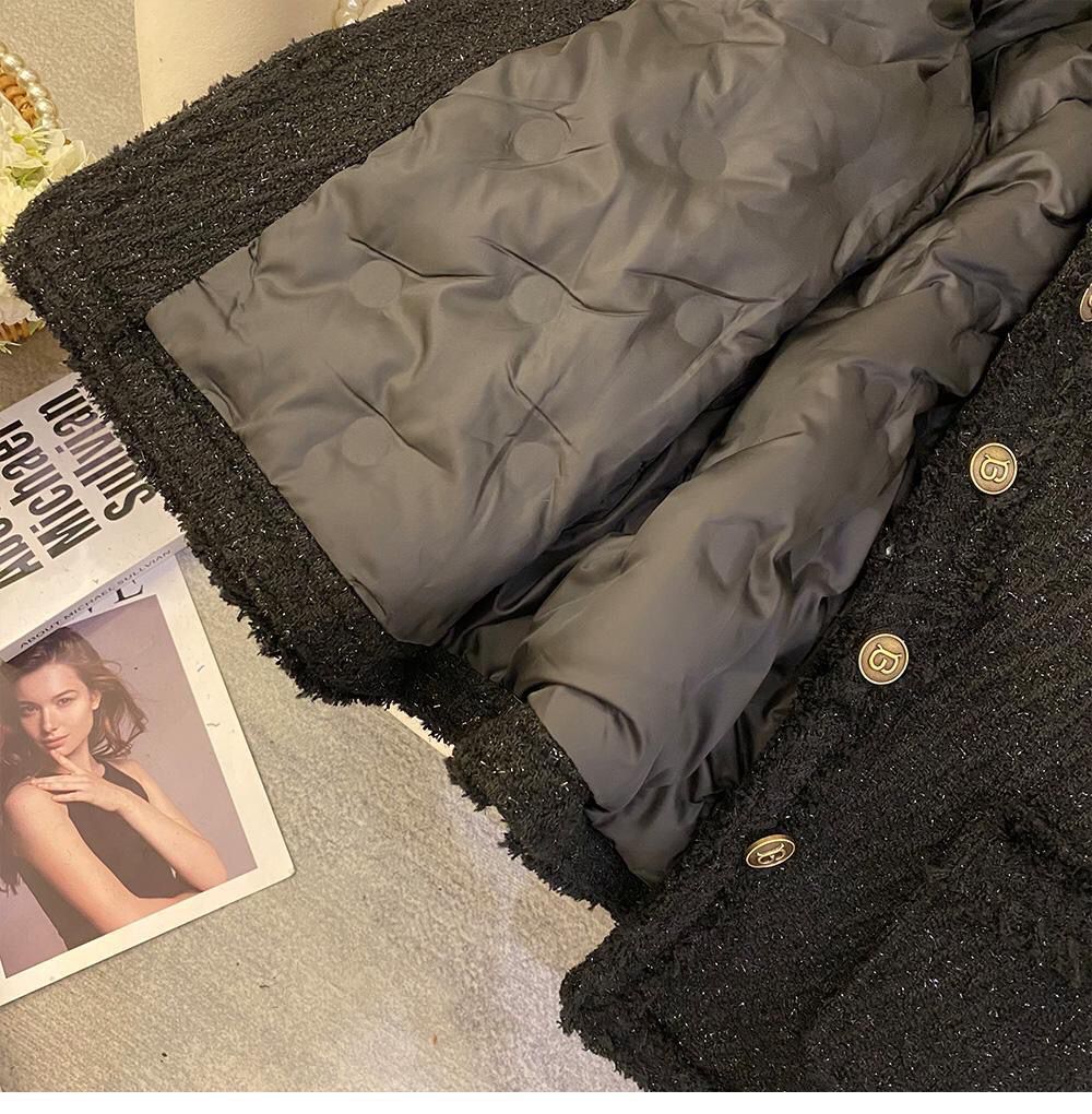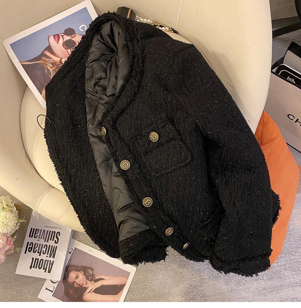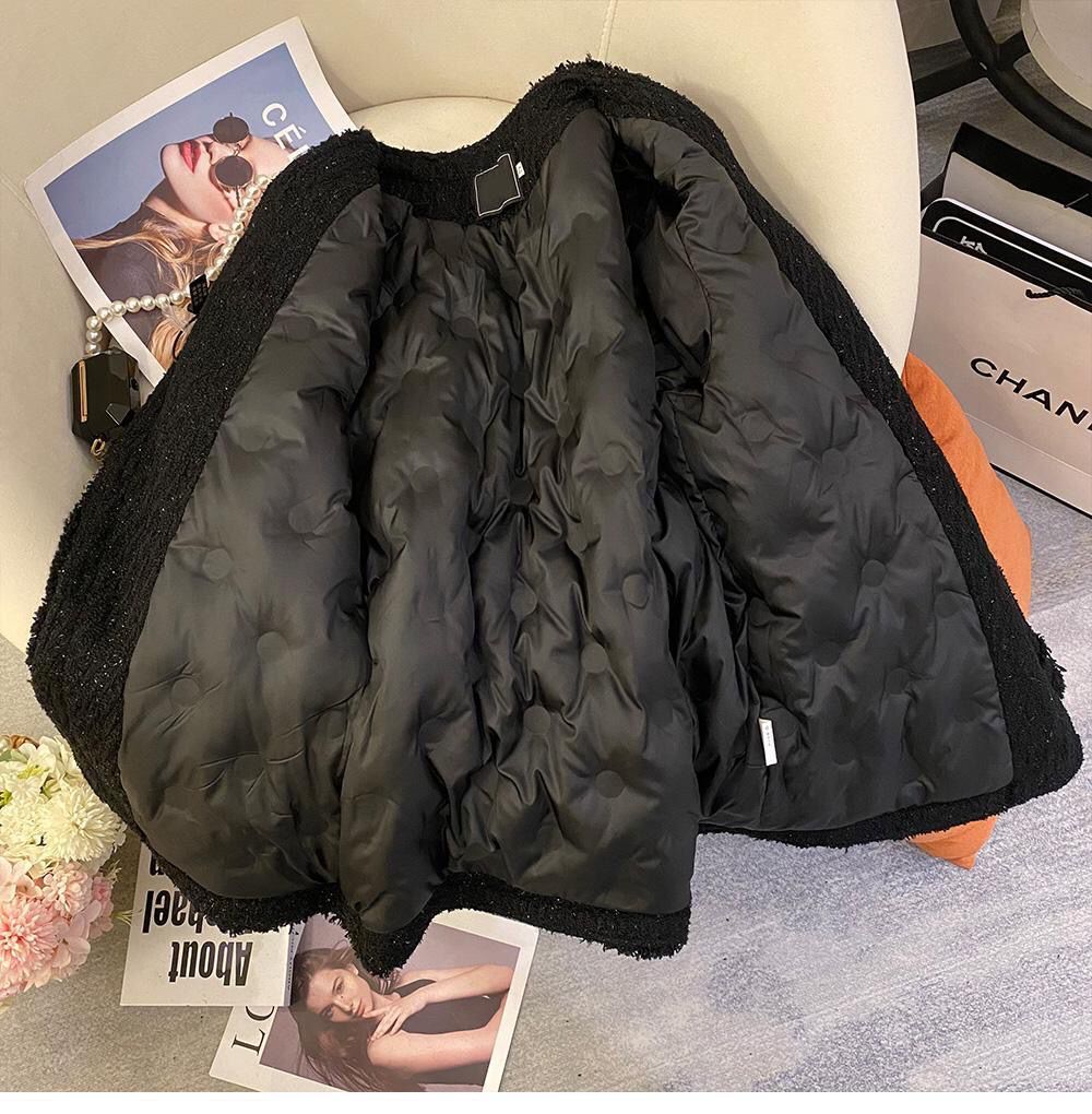블랙 우아한 샤넬 스타일 다운 재킷 여성 겨울 2023 새로운 고급 프랑스 술 밝은 실크 라이너 재킷스토어 가기