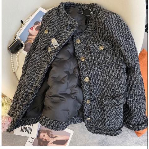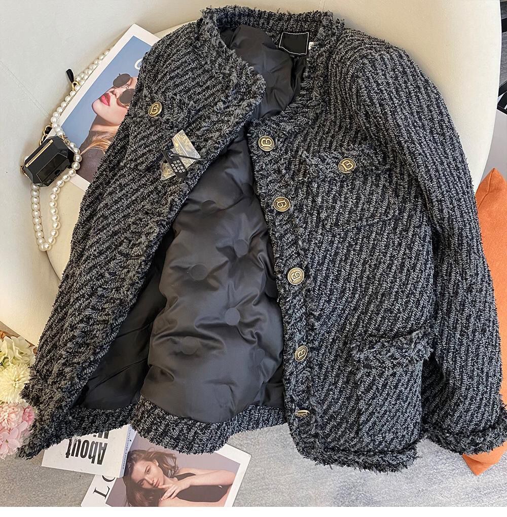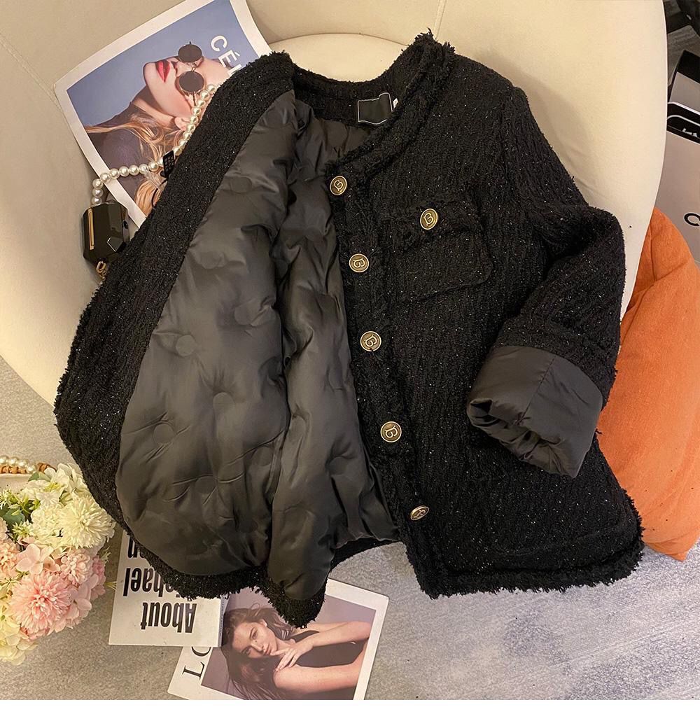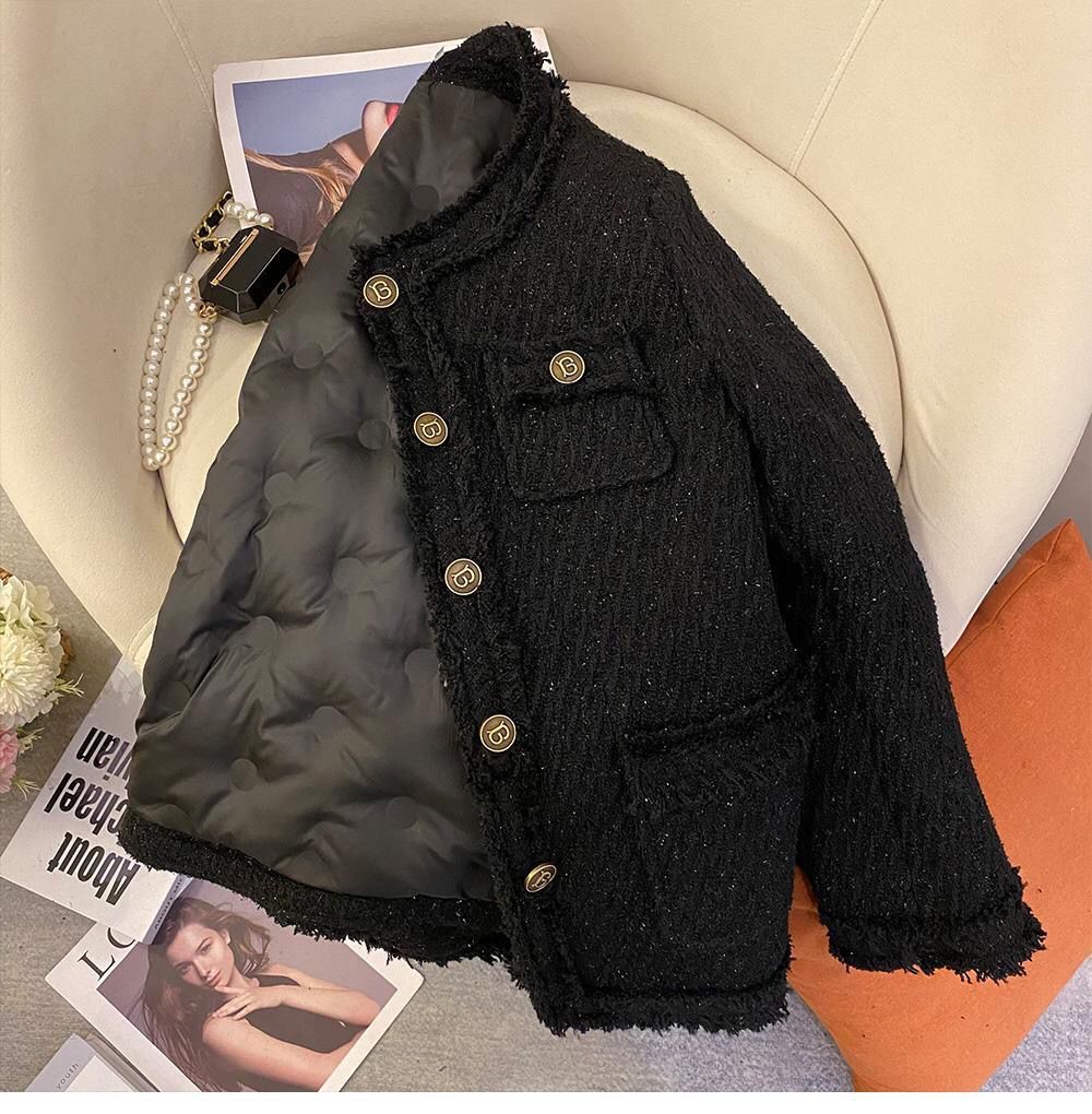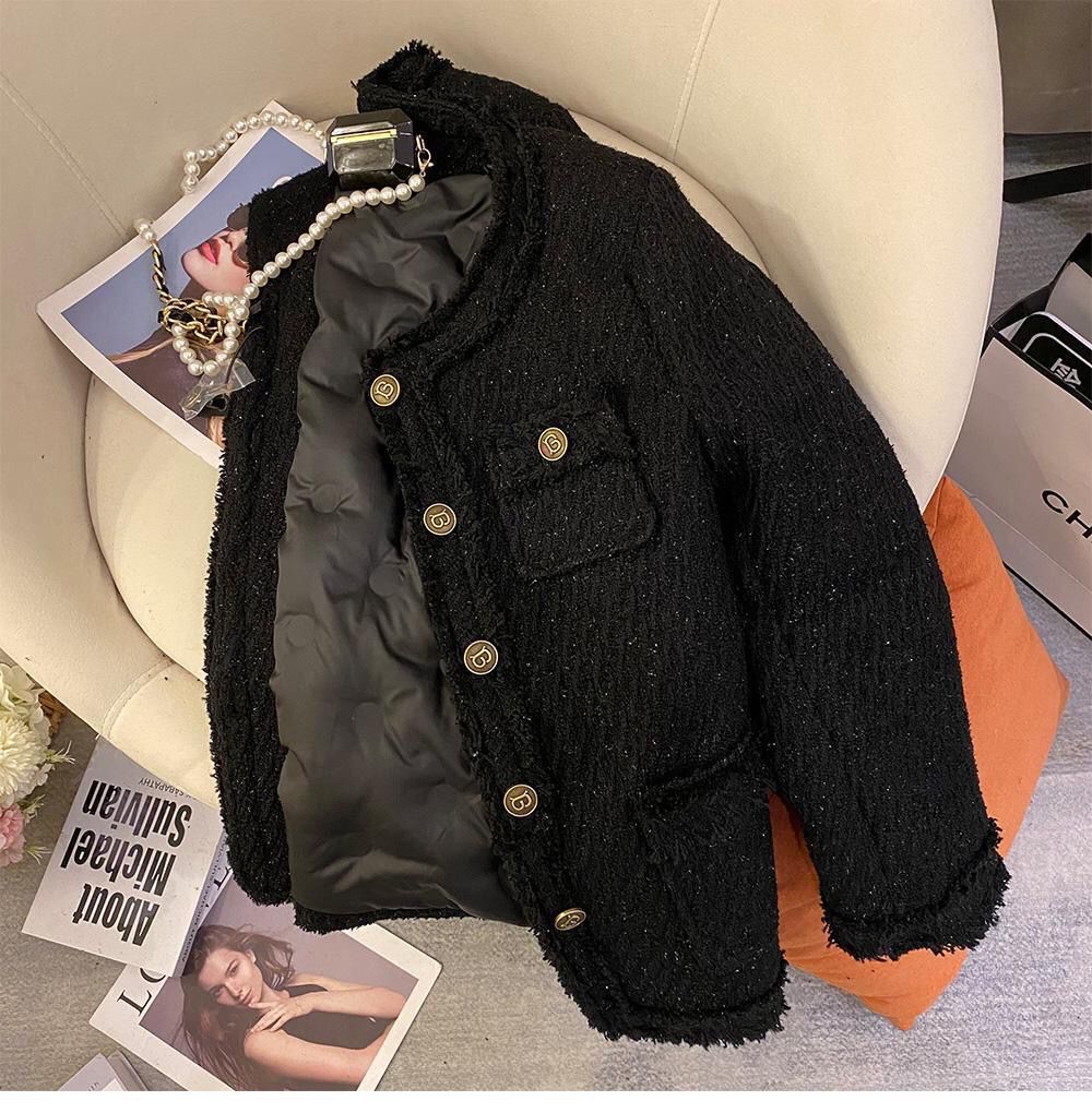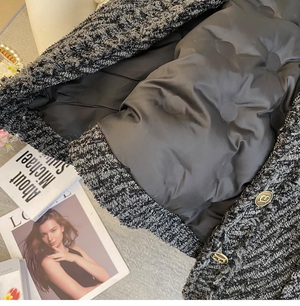 블랙 우아한 샤넬 스타일 다운 재킷 여성 겨울 2023 새로운 고급 프랑스 술 밝은 실크 라이너 재킷스토어 가기