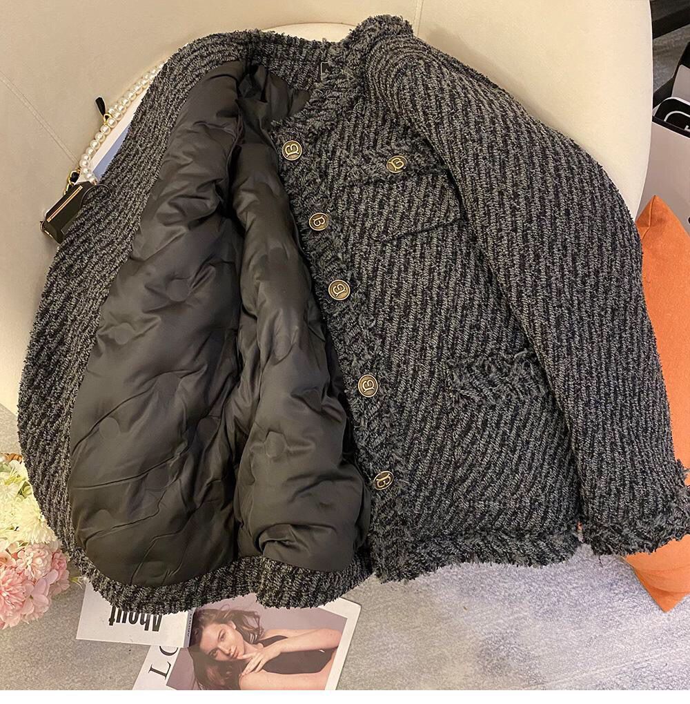 블랙 우아한 샤넬 스타일 다운 재킷 여성 겨울 2023 새로운 고급 프랑스 술 밝은 실크 라이너 재킷