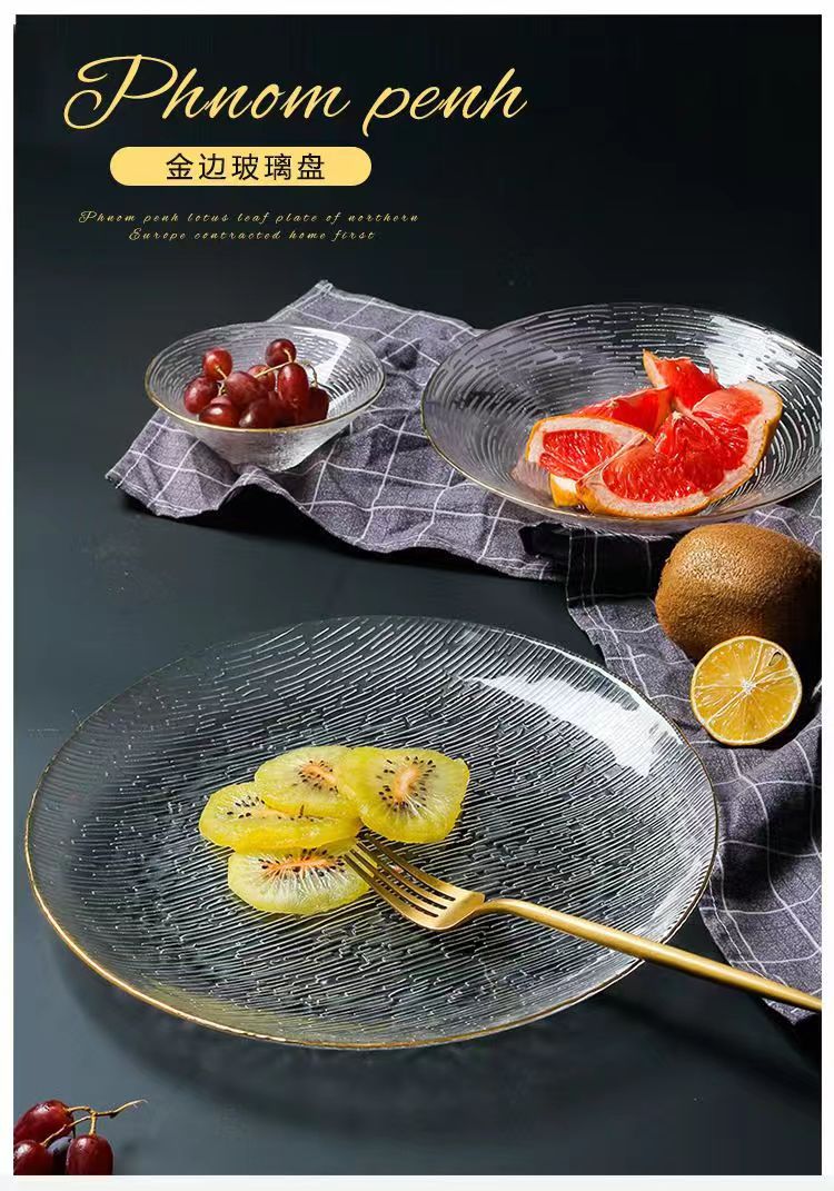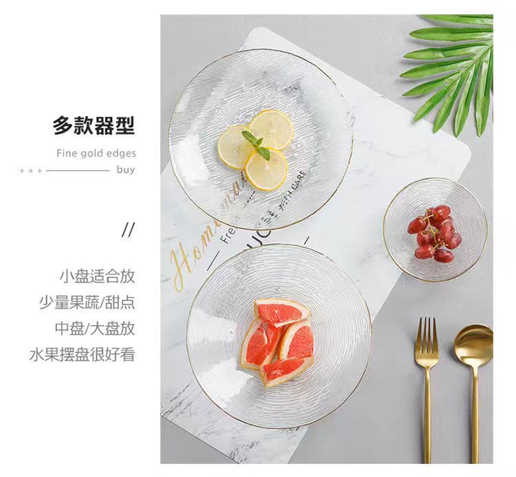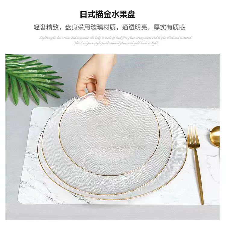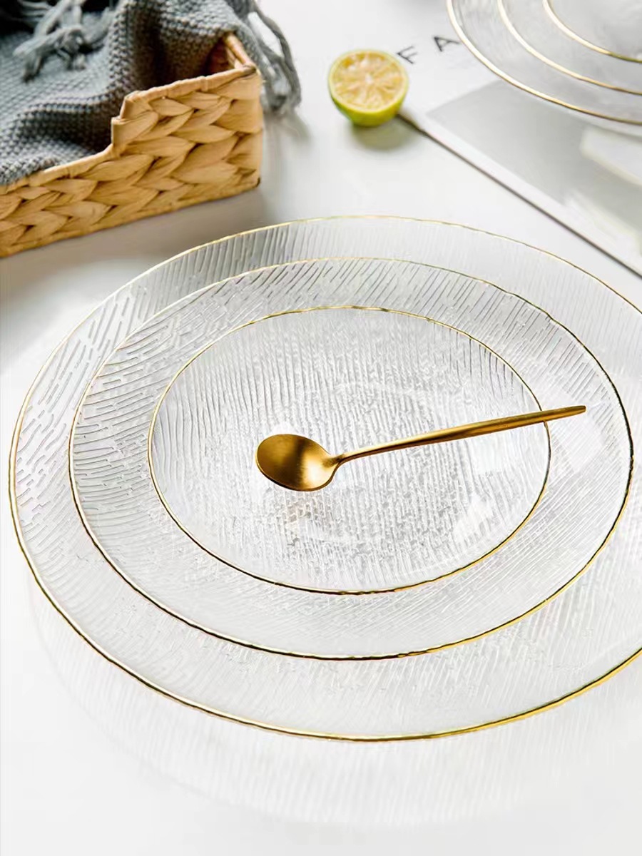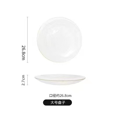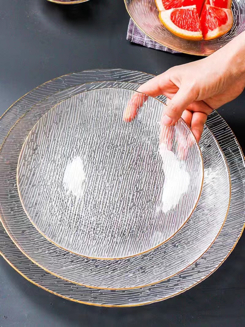일본식 가로 줄무늬 유리 접시 가정용 투명 식기 접시 서양 음식 유리 과일 샐러드 그릇 저녁 식사 접시 도매스토어 가기