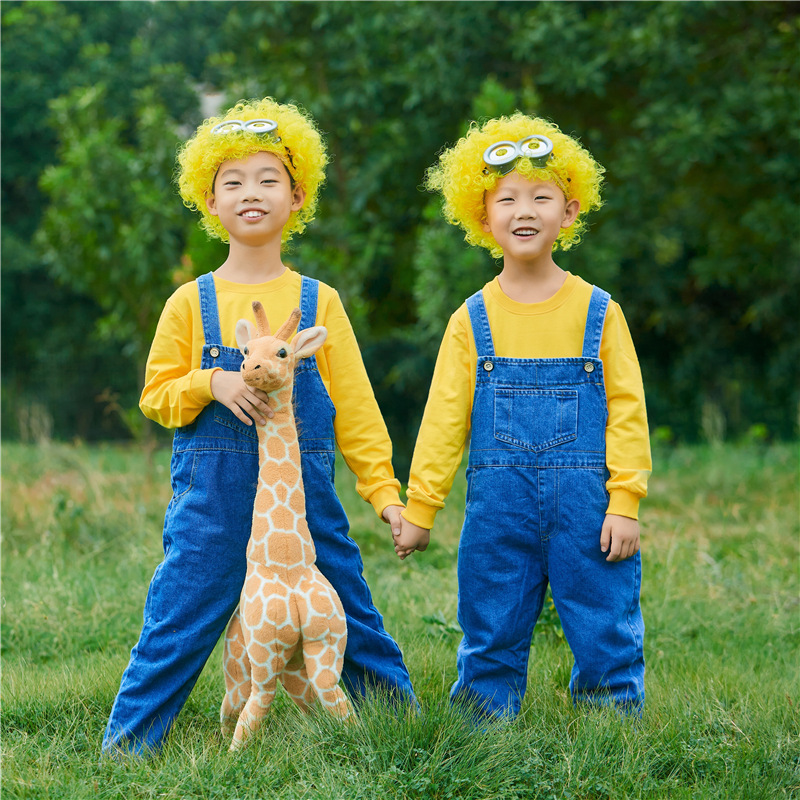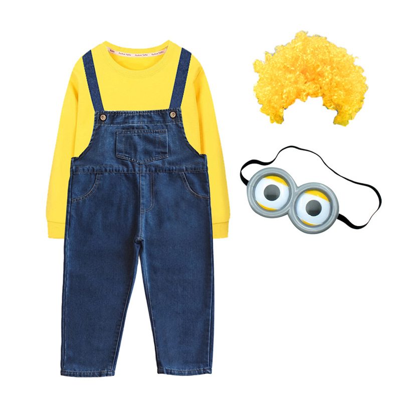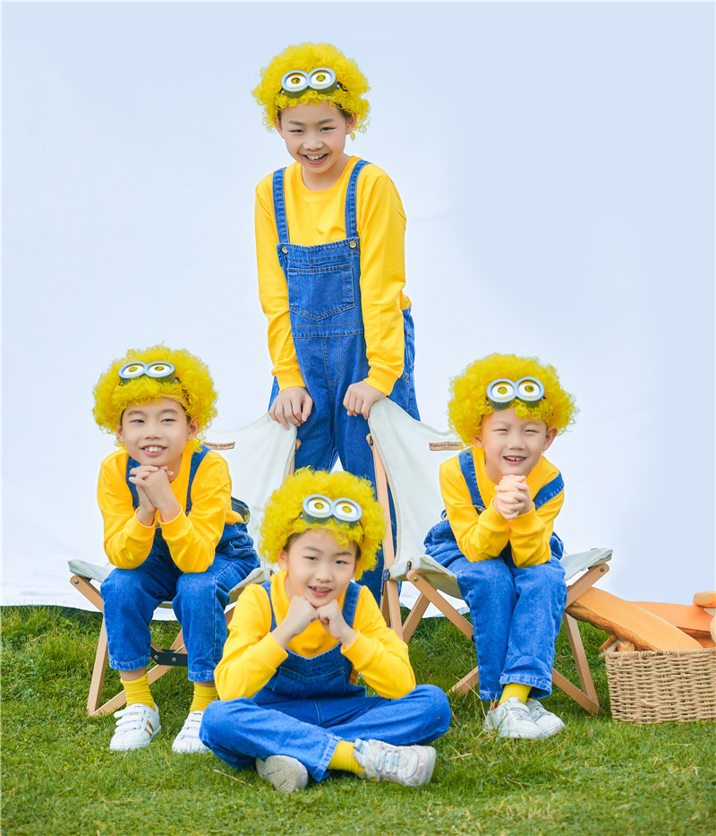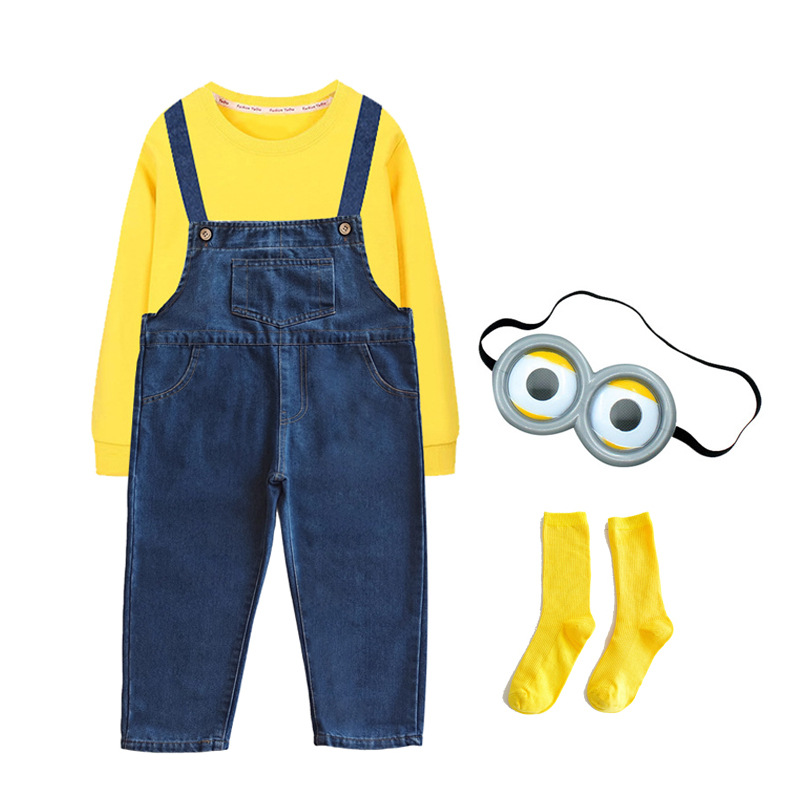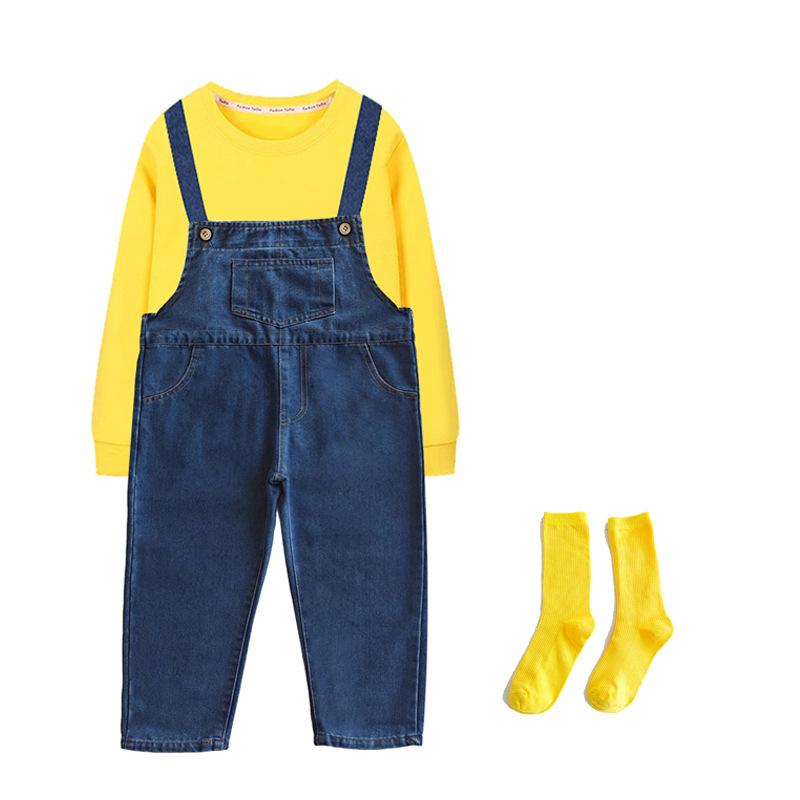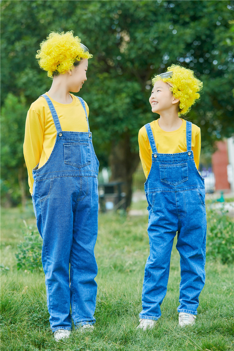 새해 첫날 어린이 공연 의류 미니언 공연 의류 유치원 소년과 소녀 공연 데님 스트랩 바지 세트 가을과 겨울