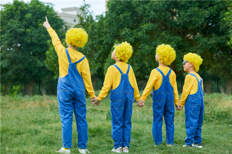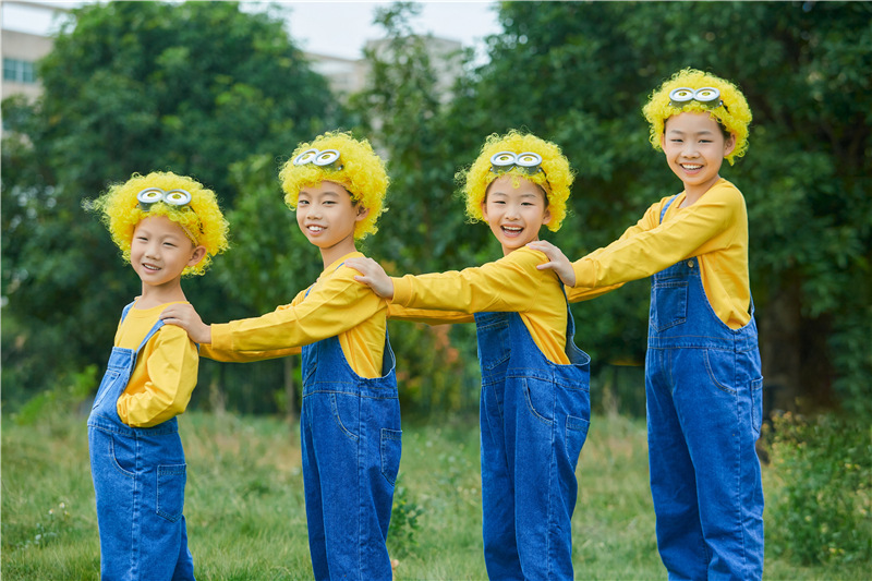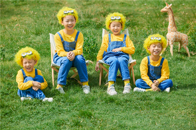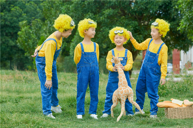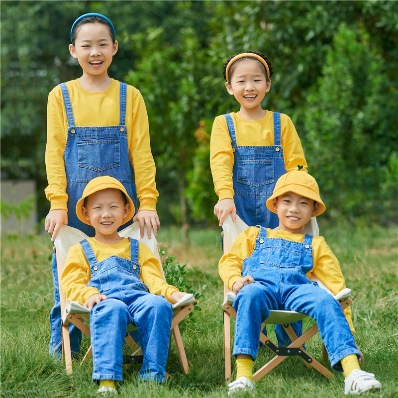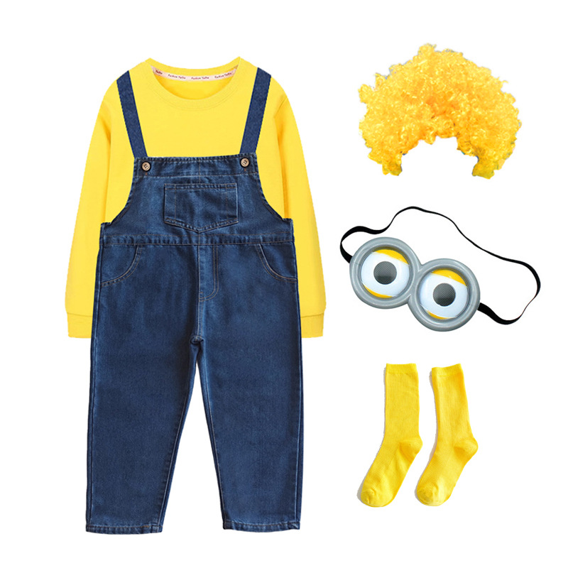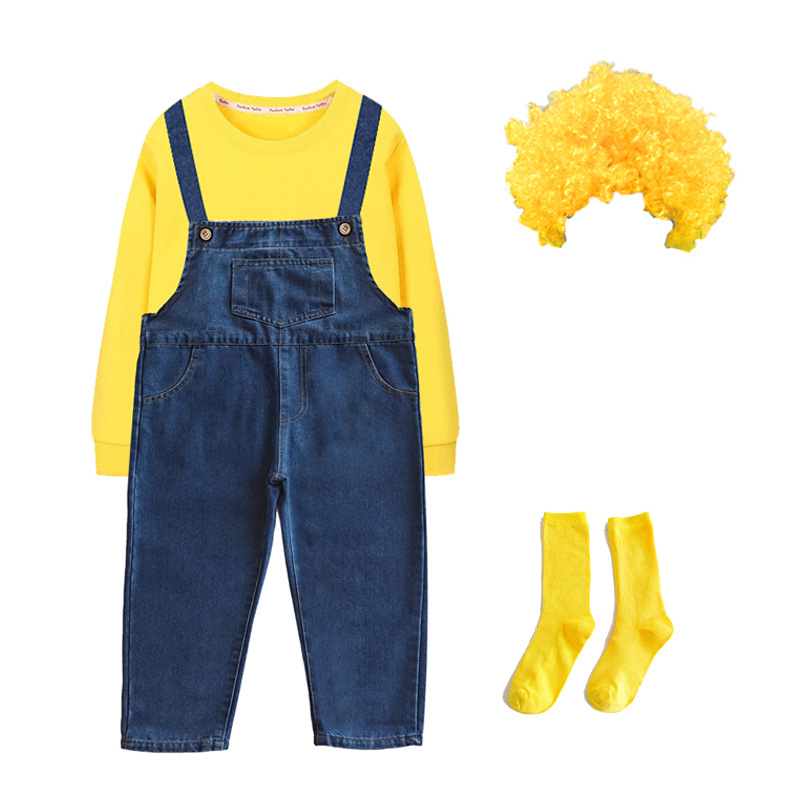 새해 첫날 어린이 공연 의류 미니언 공연 의류 유치원 소년과 소녀 공연 데님 스트랩 바지 세트 가을과 겨울