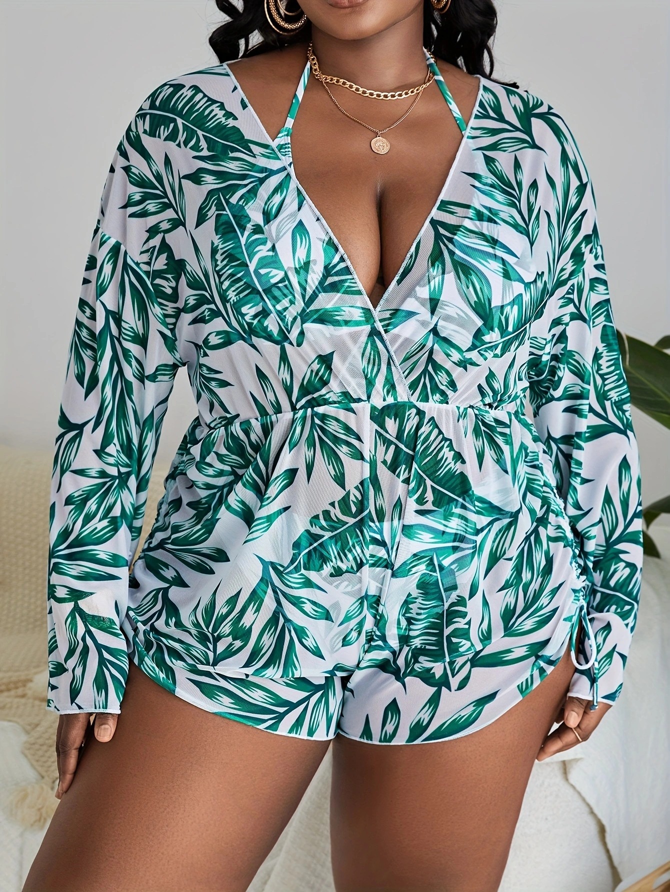 2024 새로운 크로스 국경 대외 무역 플러스 사이즈 메쉬 긴 소매 3 피스 스플릿 브리프 비키니 수영복 여성