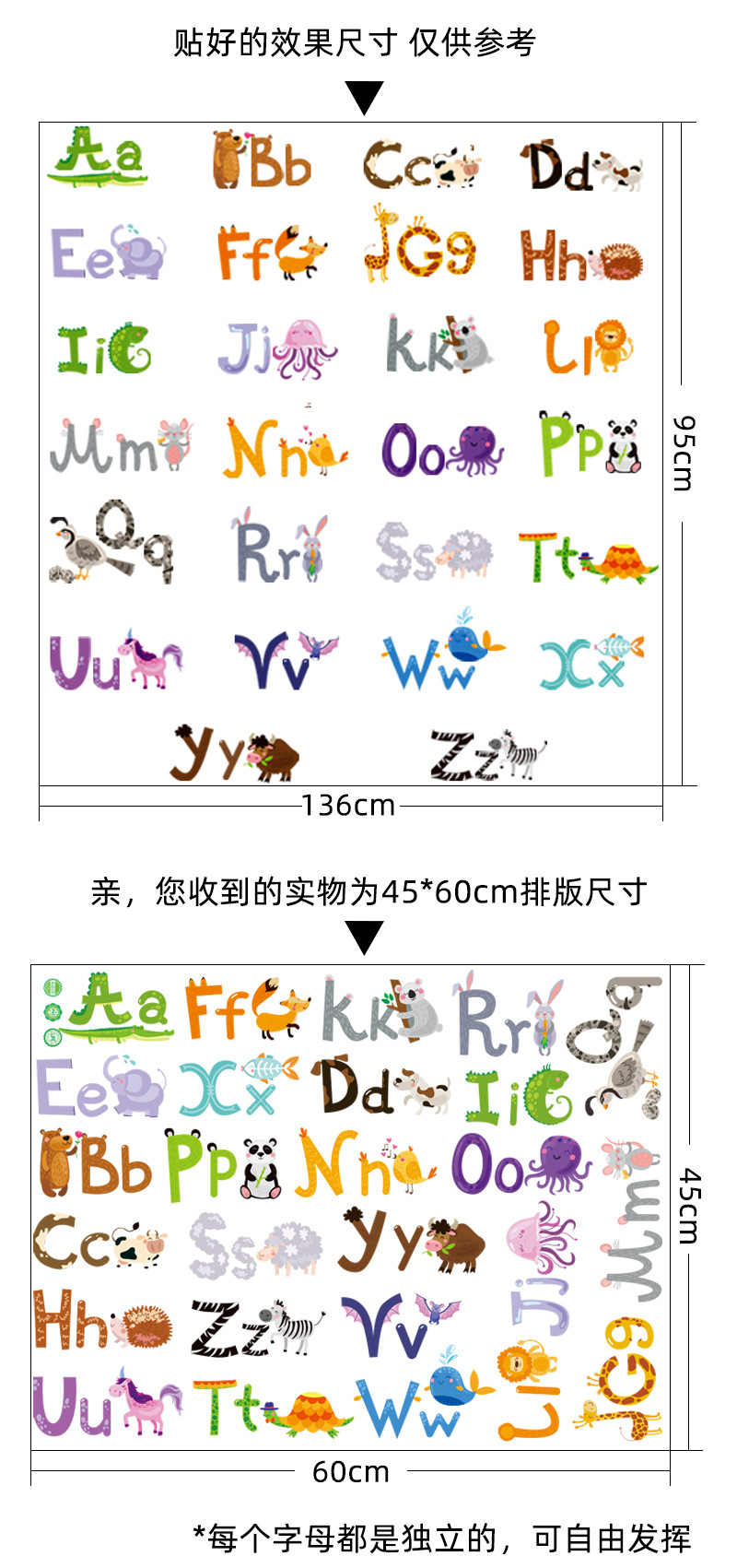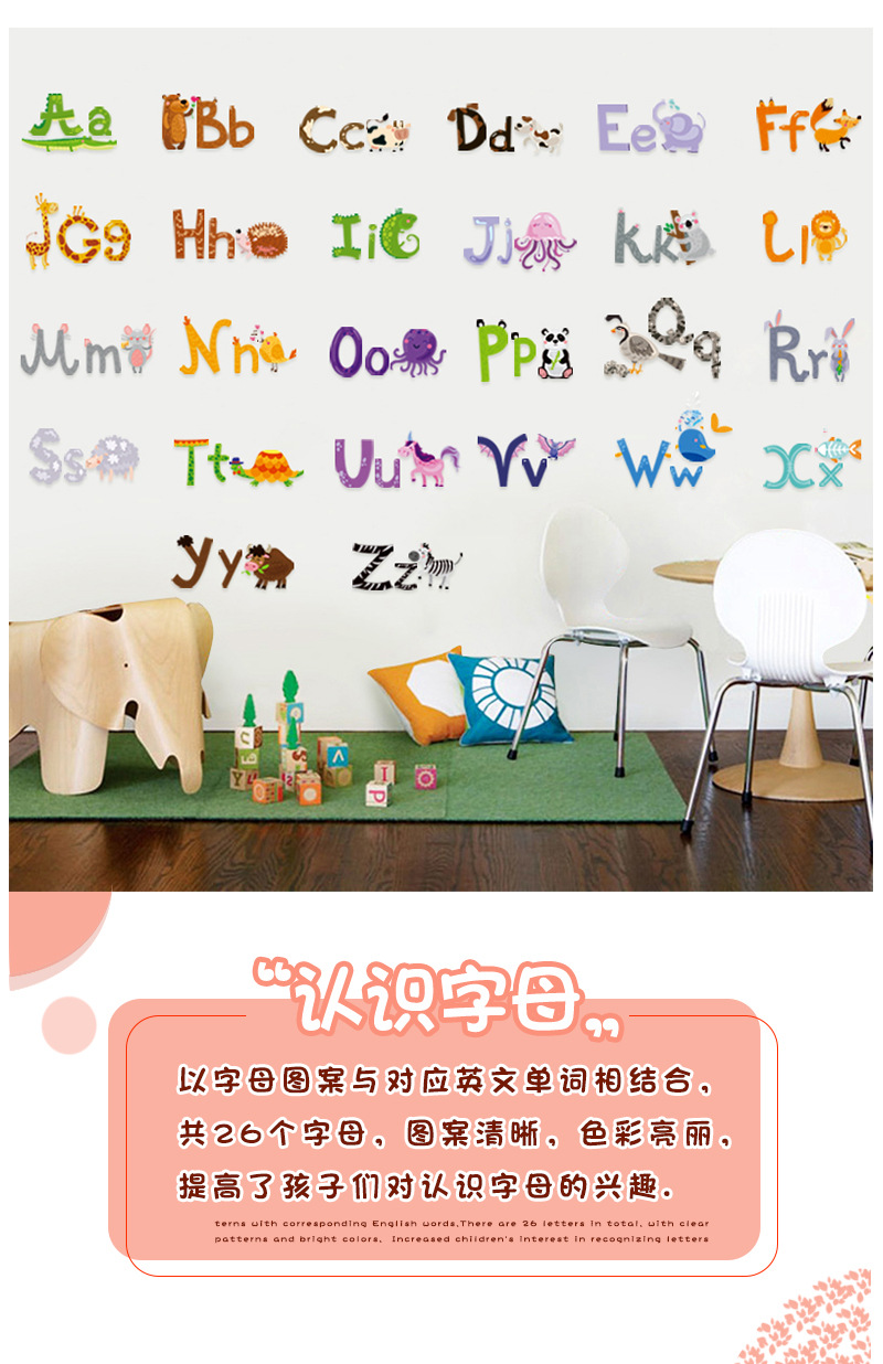크리 에이 티브 어린이 조기 교육 스티커 자체 접착 영어 알파벳 귀여운 동물 벽지 유치원 방 벽 장식