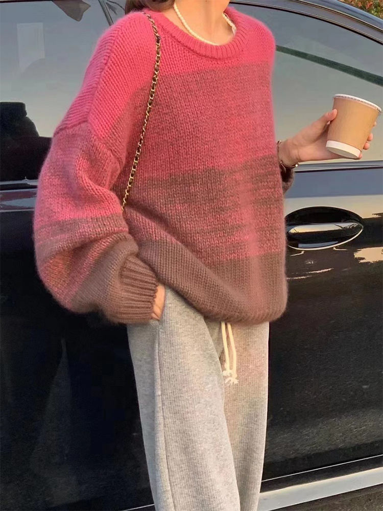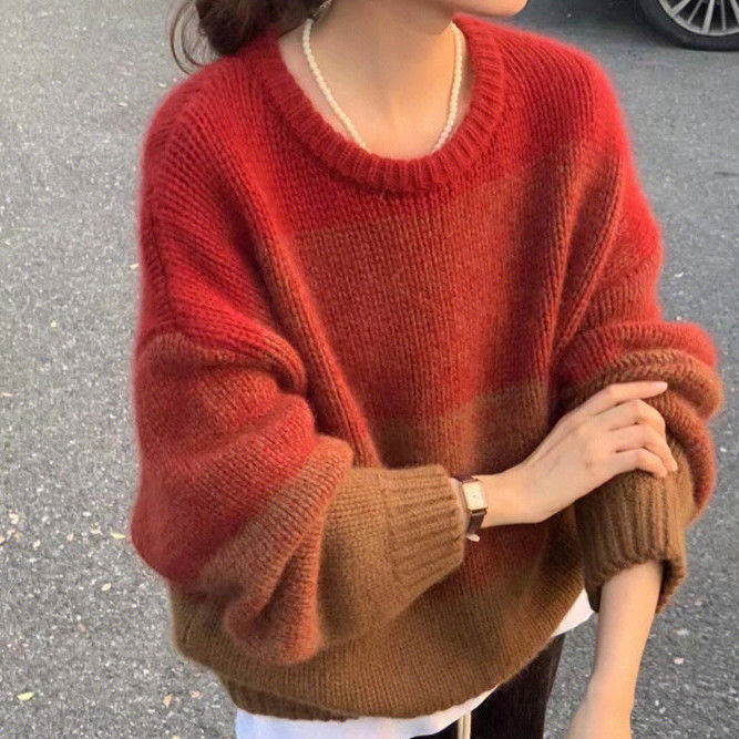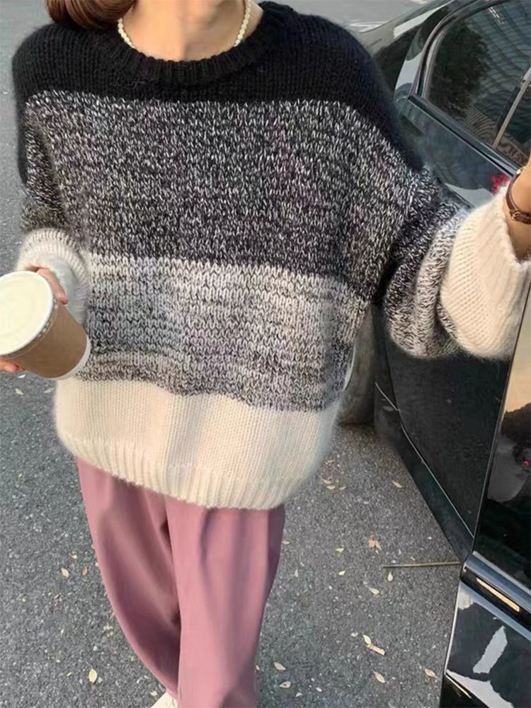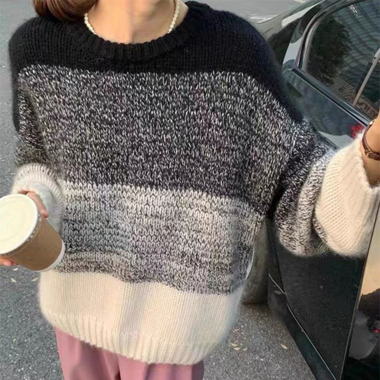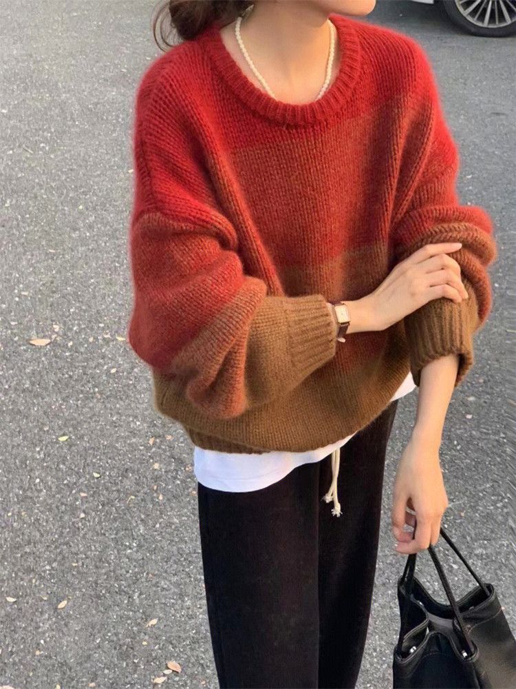 가을과 겨울 스트라이프 컬러 매칭 느슨한 게으른 스타일 긴 소매 탑 스웨터 2023 새로운 라운드 넥 내부 풀오버 스웨터