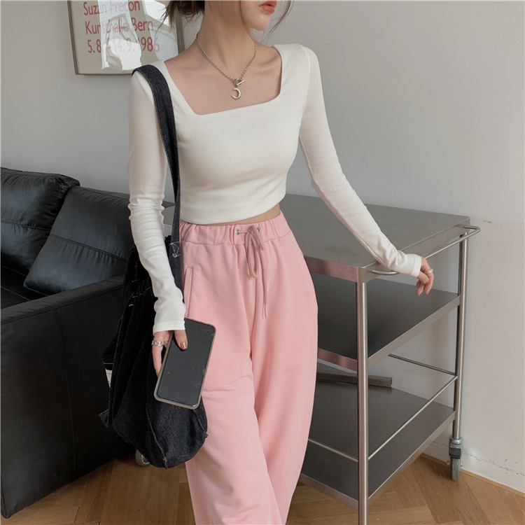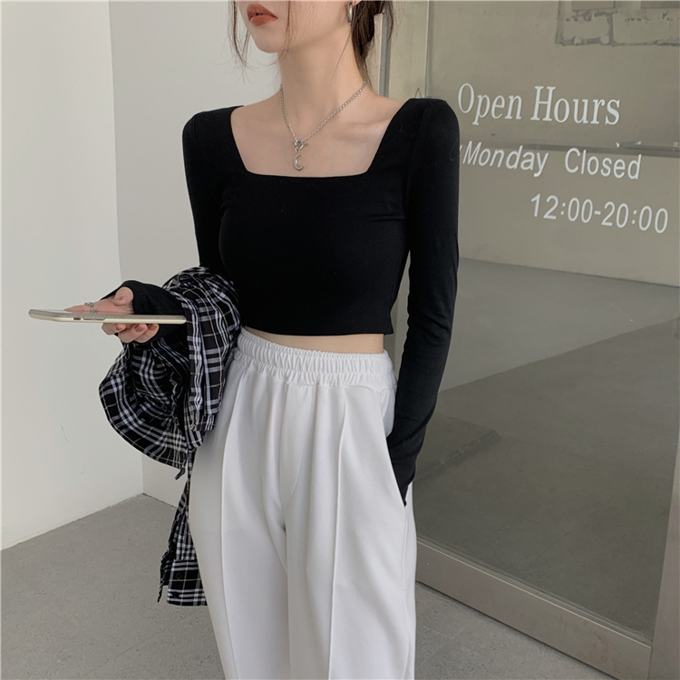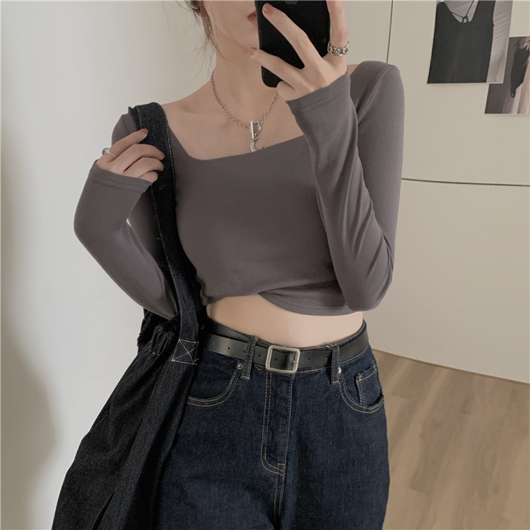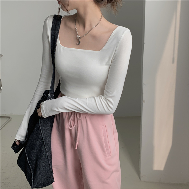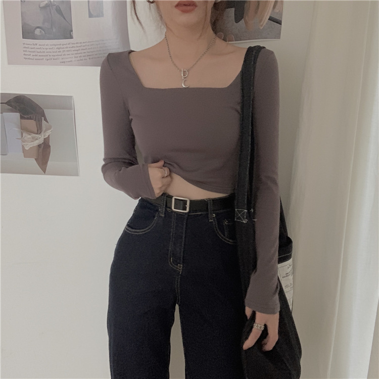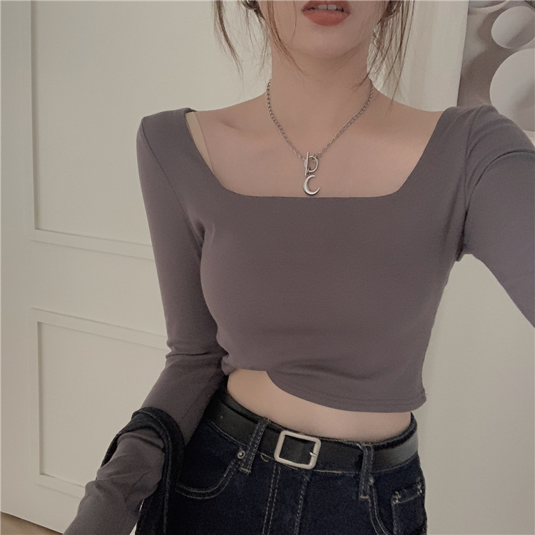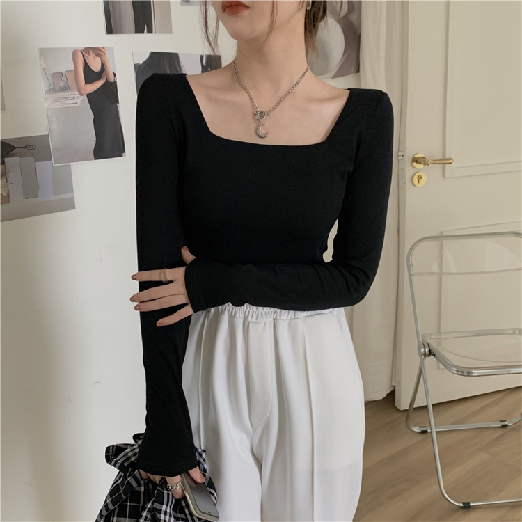 스퀘어 칼라 쇼트 탑 여성용 가을 새로운 슬림핏 이너베이스 셔츠 여성용 긴팔 티셔츠