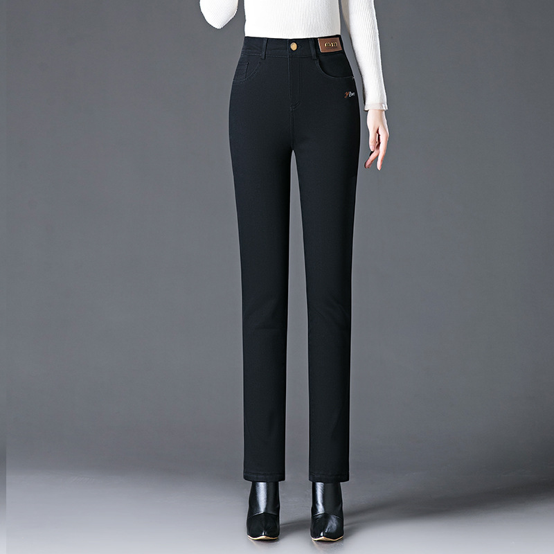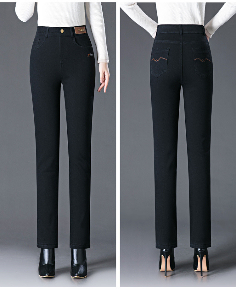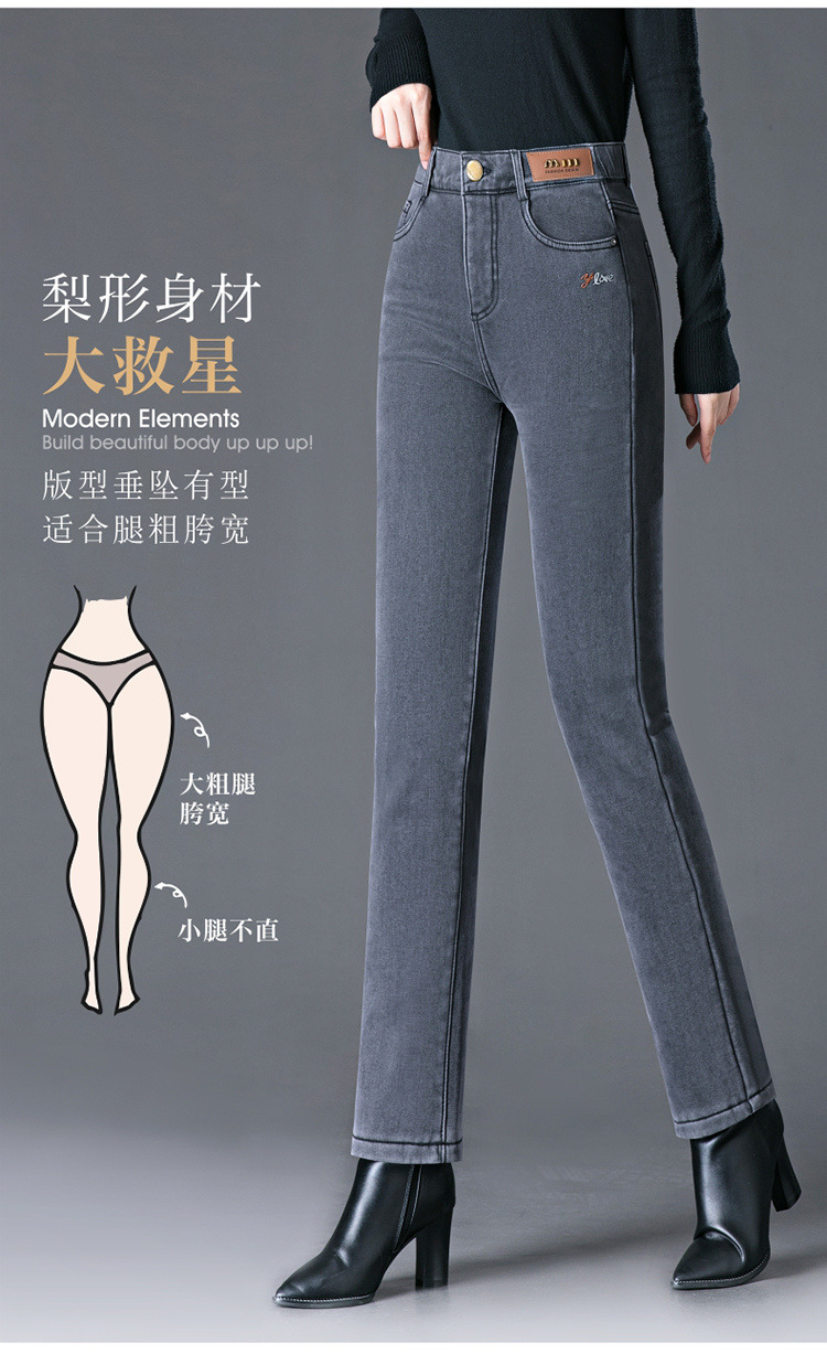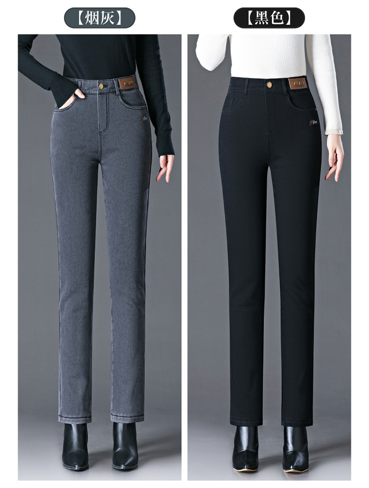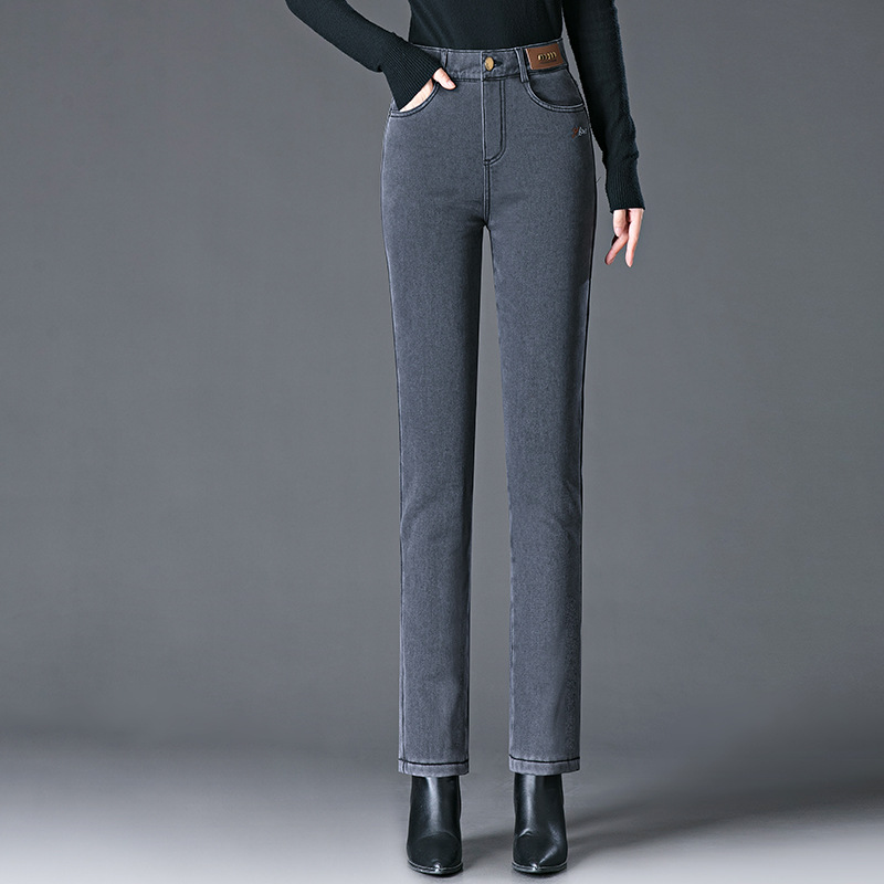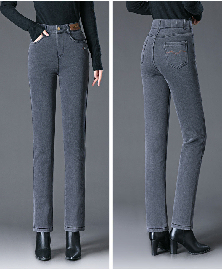 스모크 그레이 기모 청바지 여성용 겨울 새 시즌 하이 웨이스트 스트레치 스트레이트 팬츠 중년 엄마를 위한 모든 매치 슬리밍 팬츠