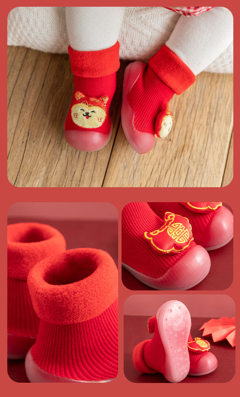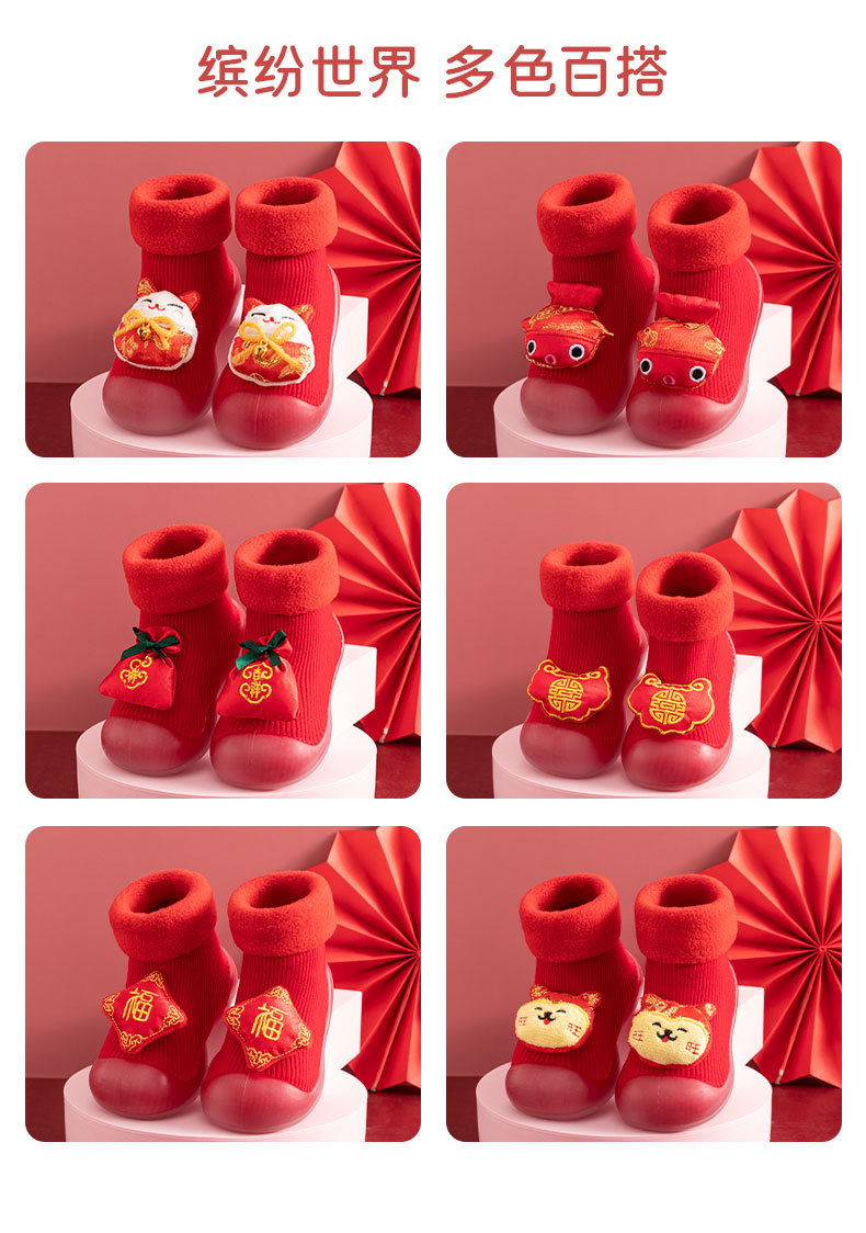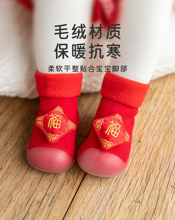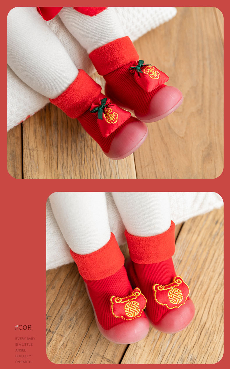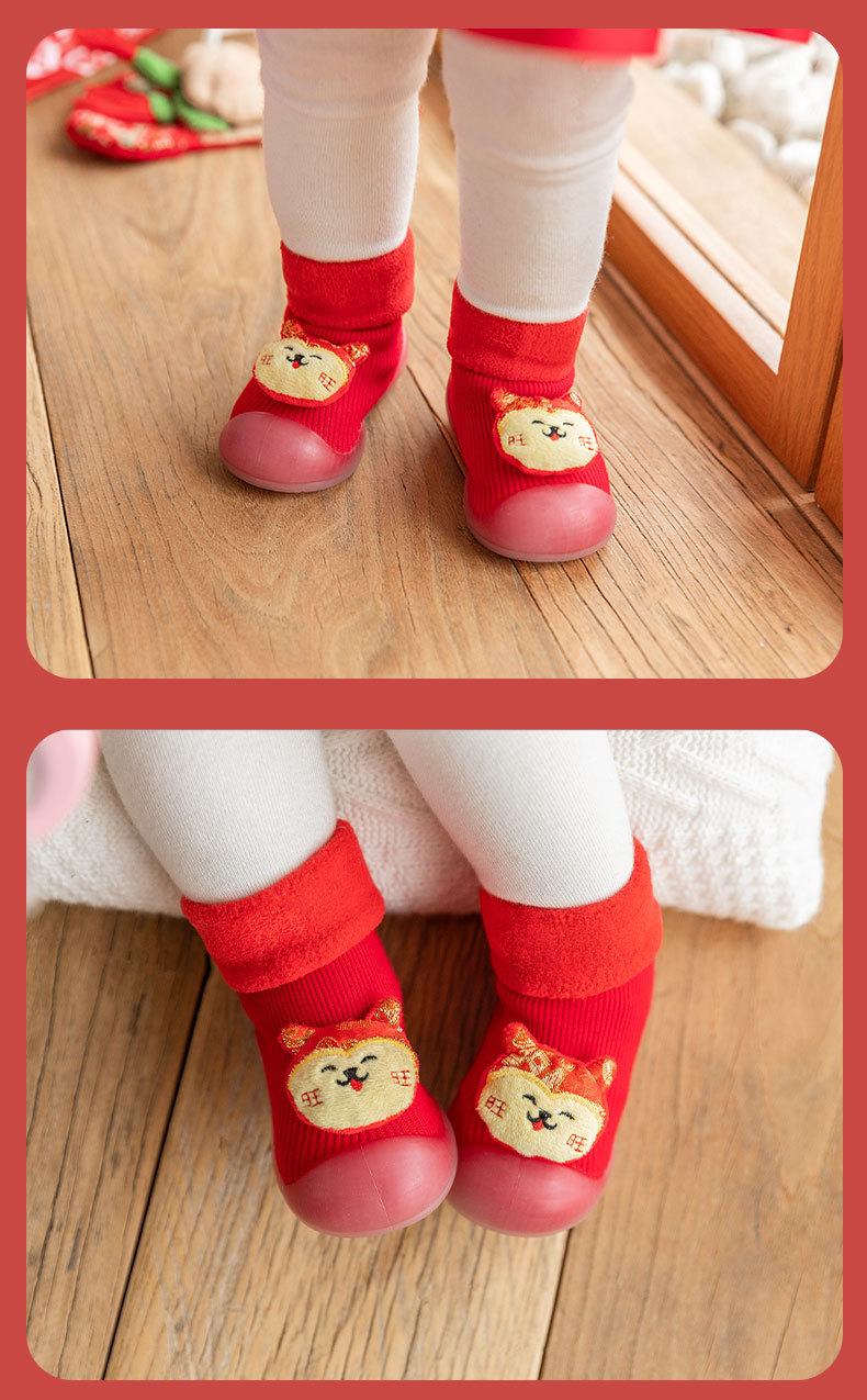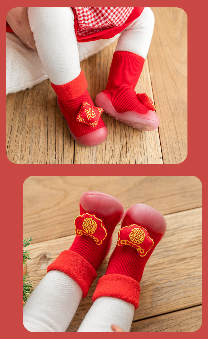 새해 빨간 캐시미어 아기 바닥 양말 두꺼운 따뜻한 실내 유아 신발 TPR 미끄럼 방지 어린이 바닥 신발
