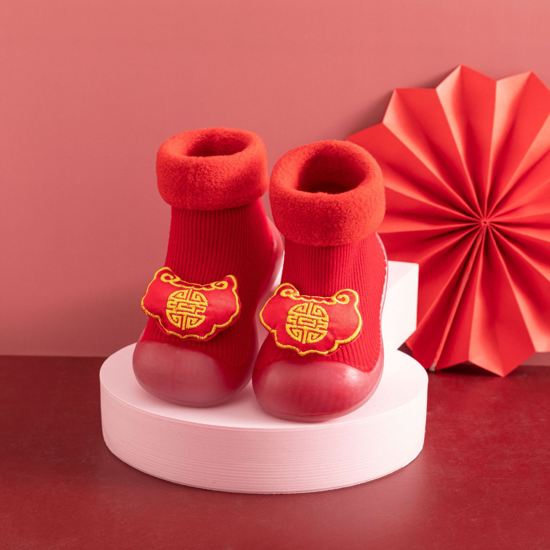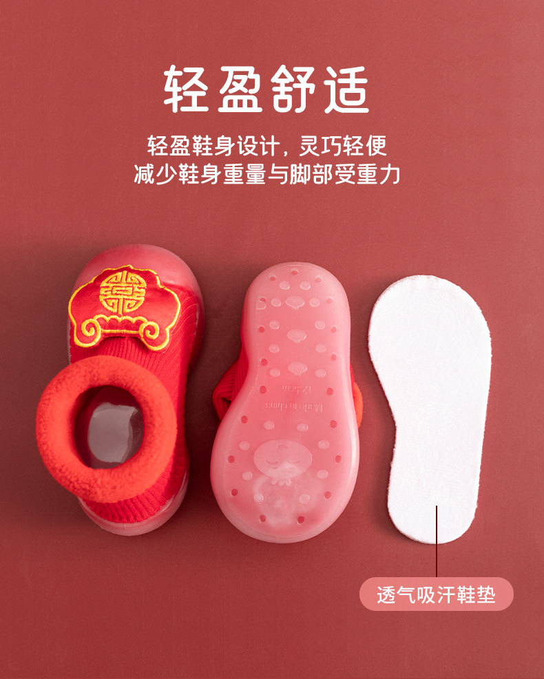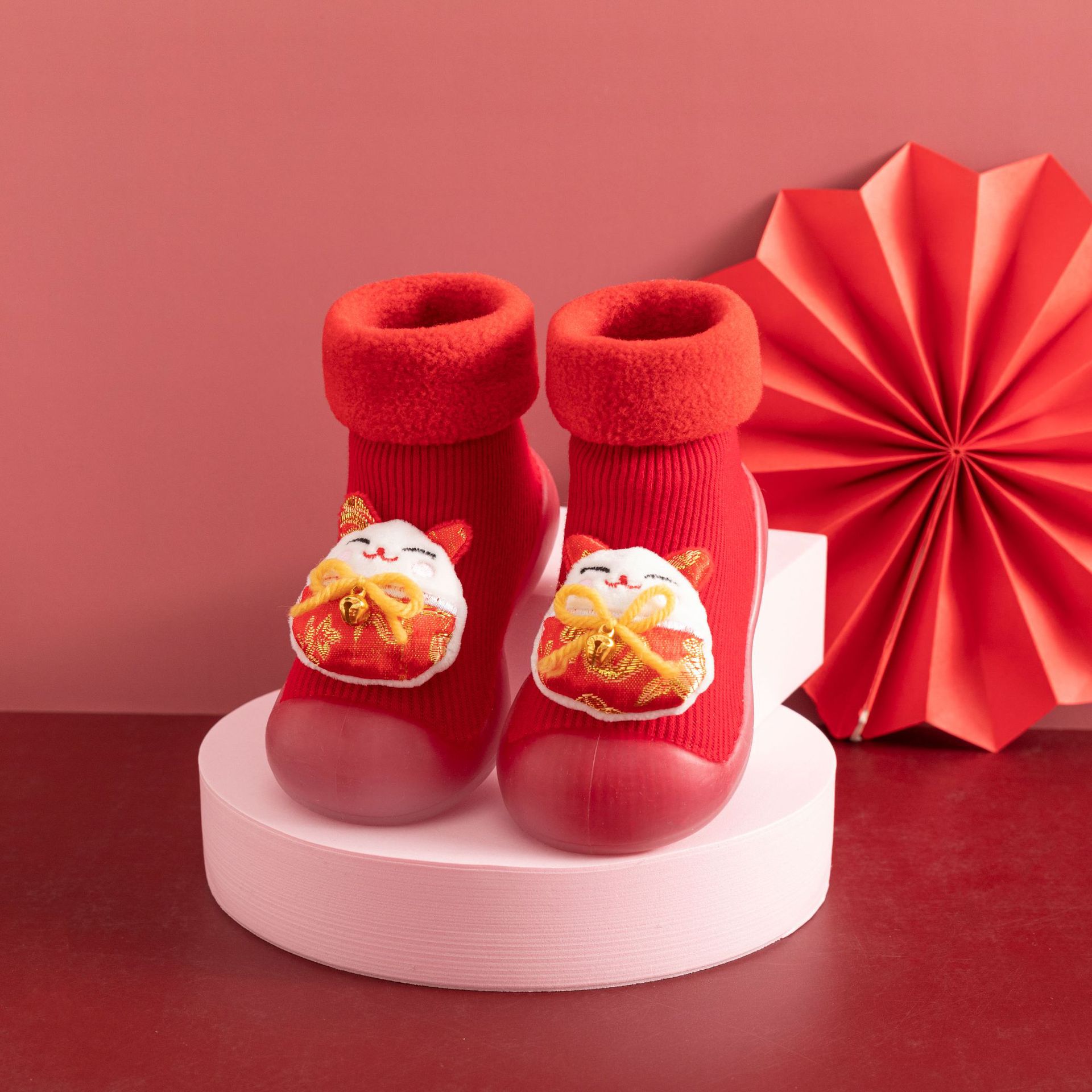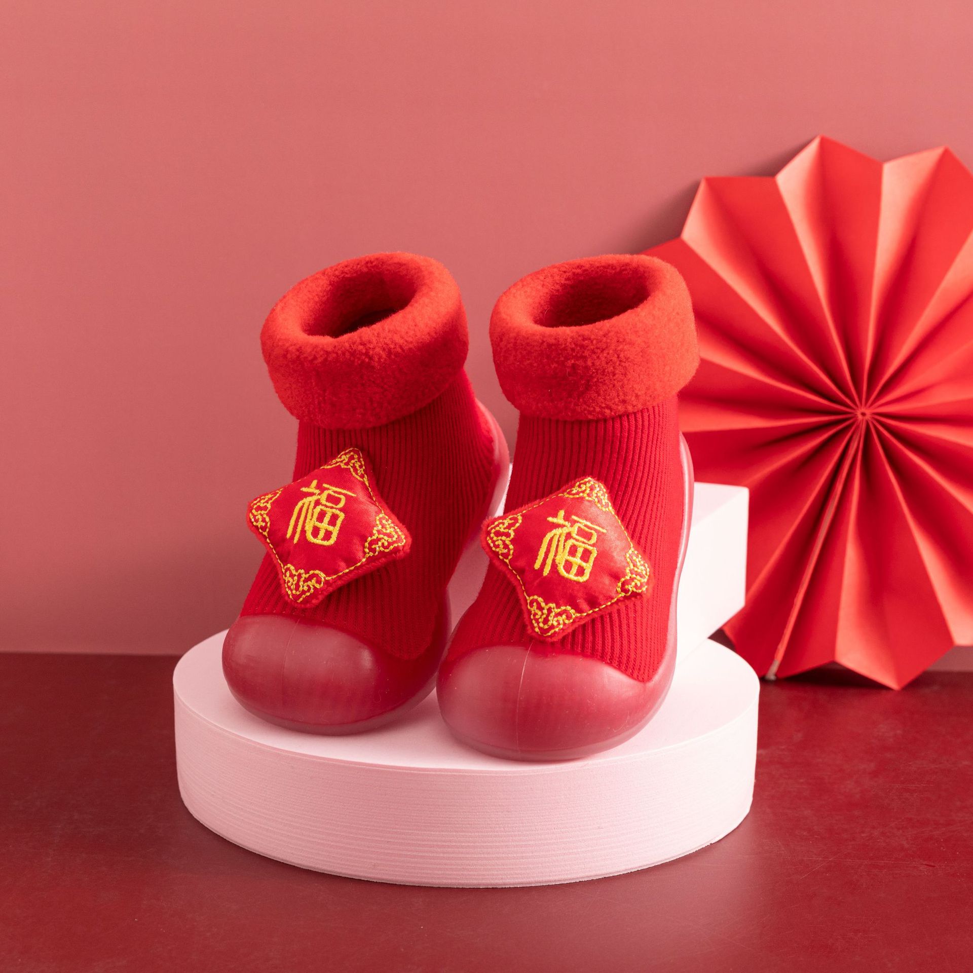 새해 빨간 캐시미어 아기 바닥 양말 두꺼운 따뜻한 실내 유아 신발 TPR 미끄럼 방지 어린이 바닥 신발
