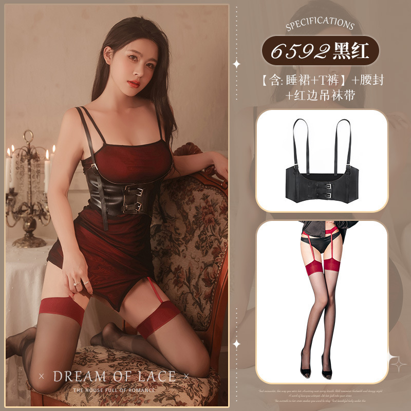 黑红【睡裙+T裤】+6592红边吊带袜+7659腰封(限价93.8)