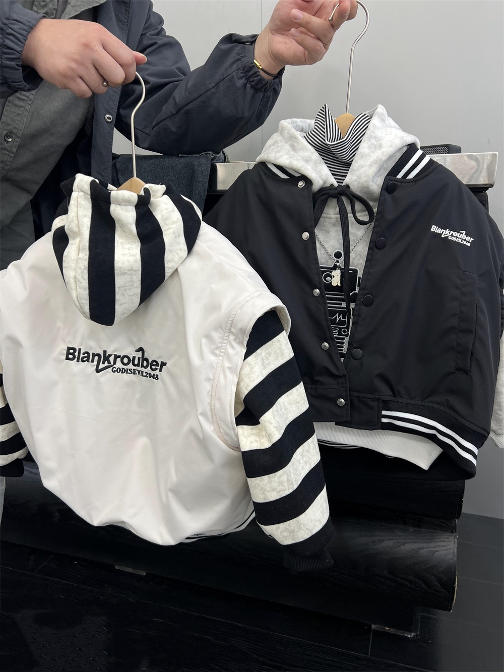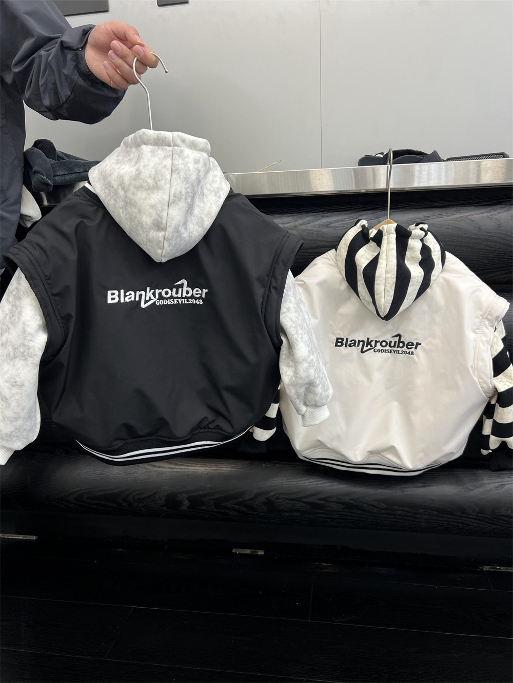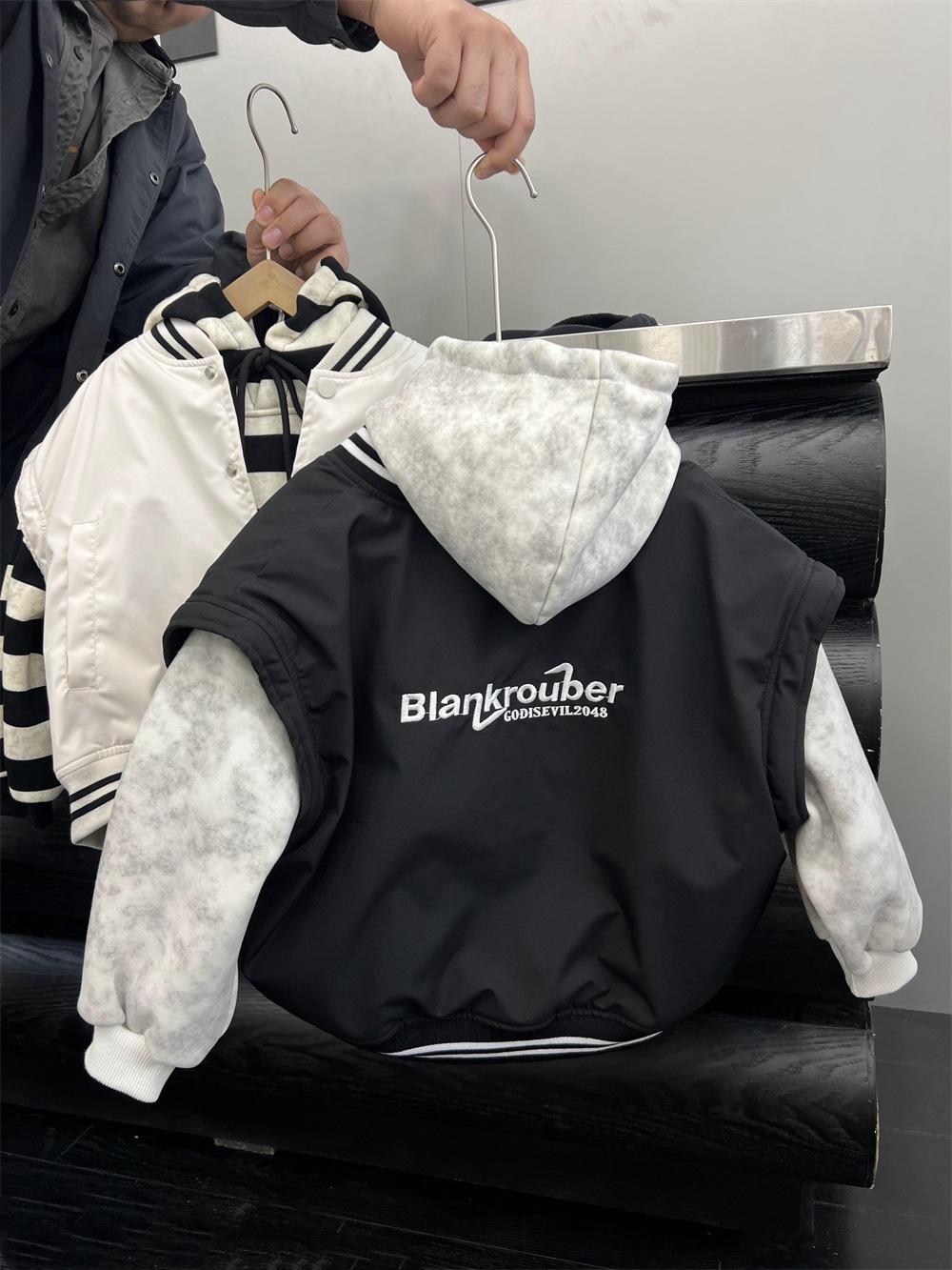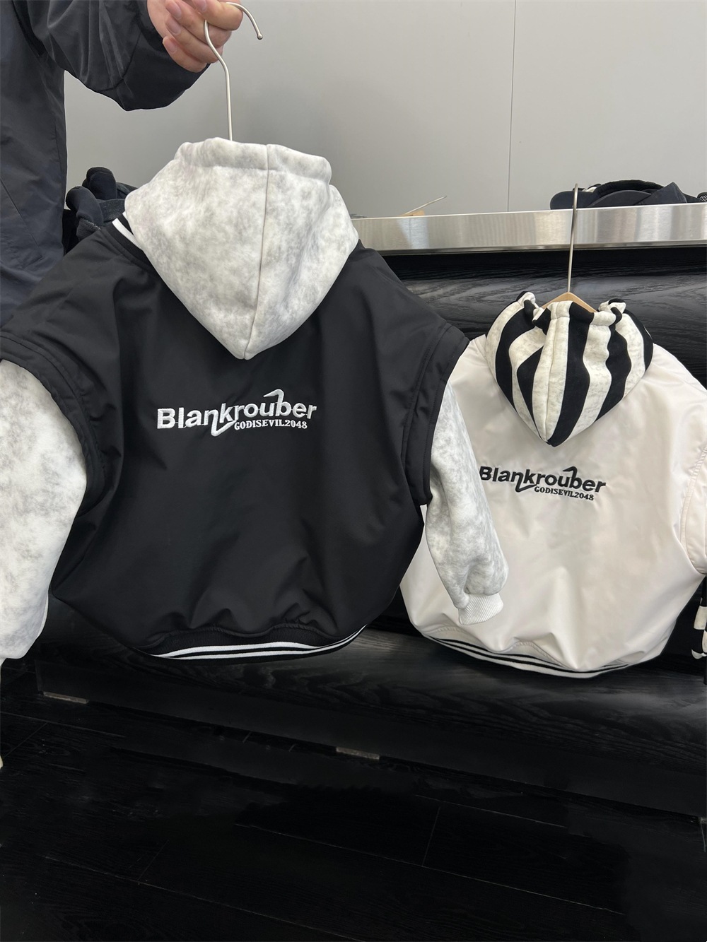 垮肩版型,里面搭连帽卫衣很好看