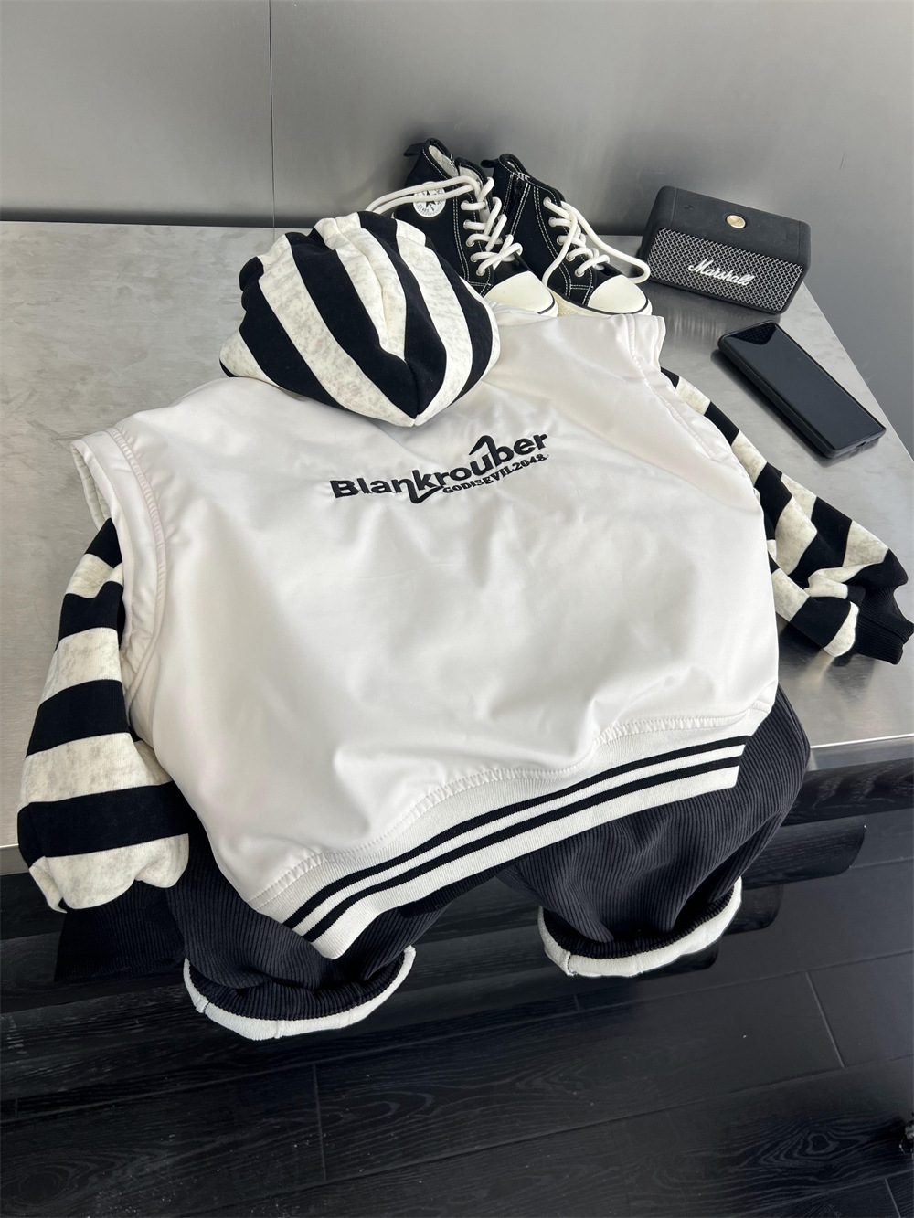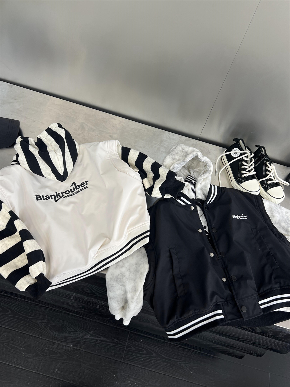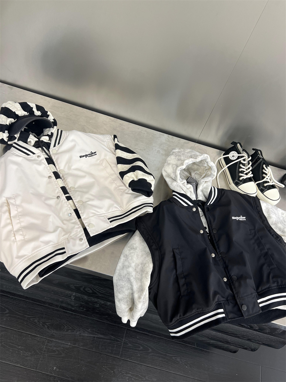 垮肩版型,里面搭连帽卫衣很好看