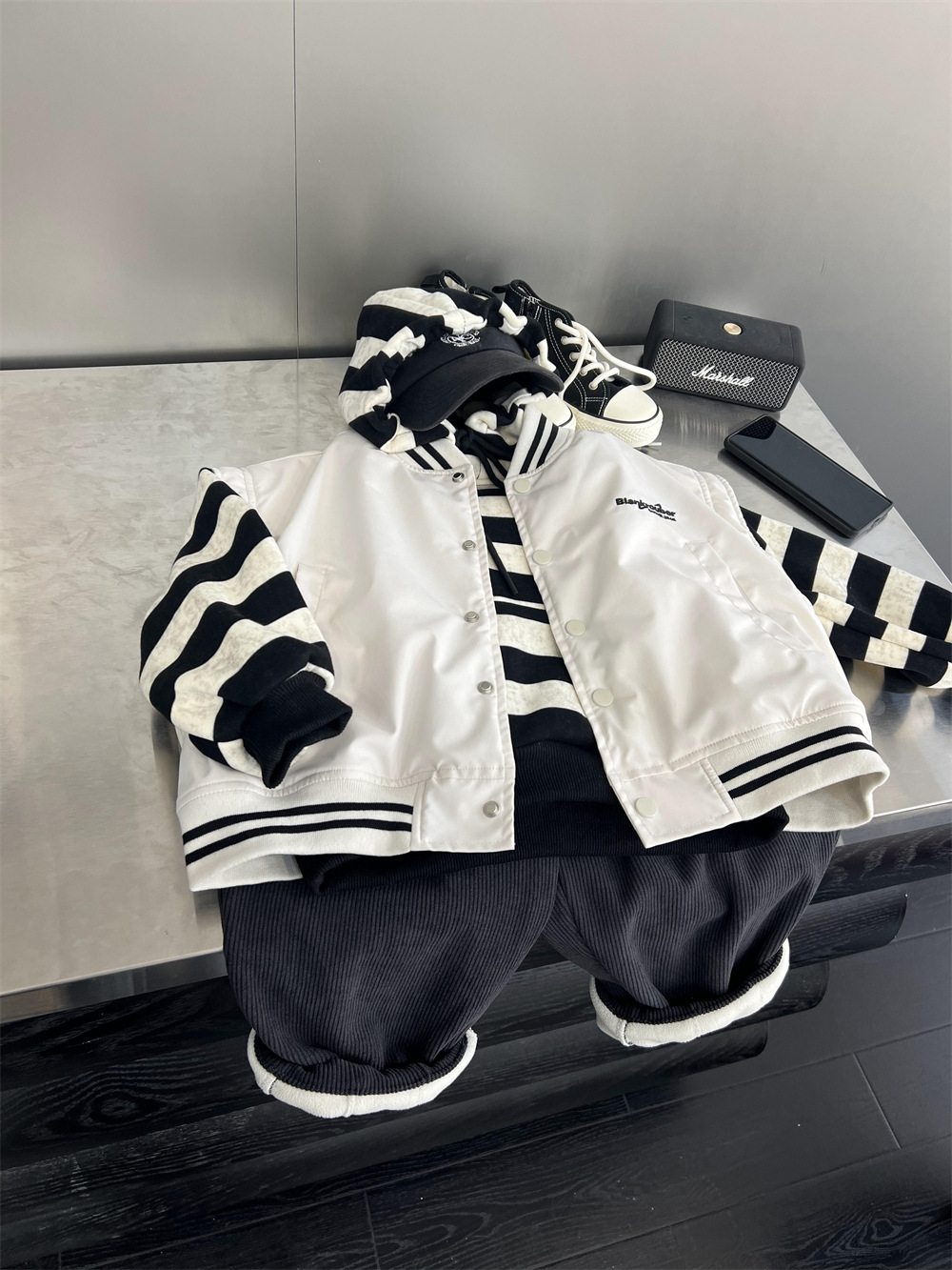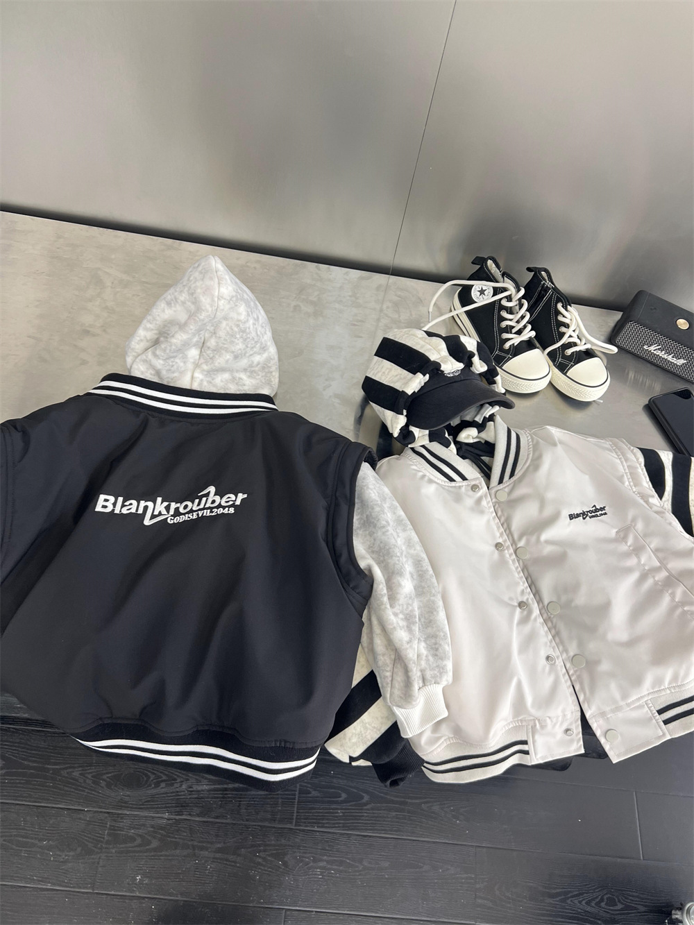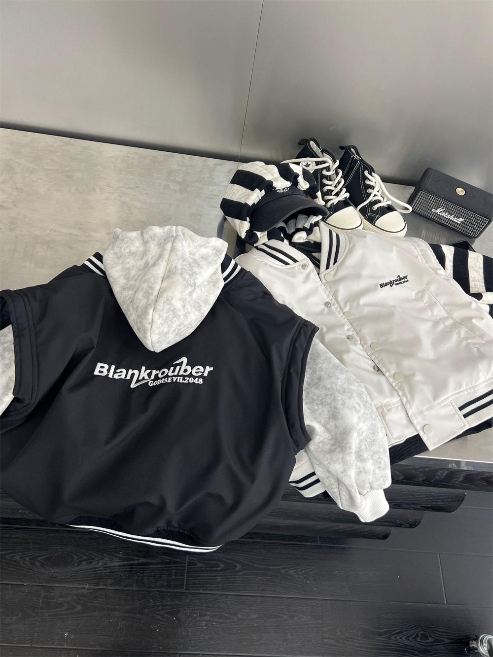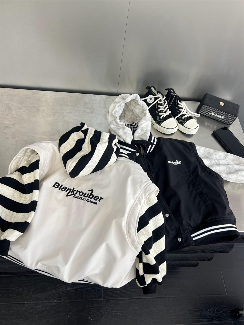 垮肩版型,里面搭连帽卫衣很好看