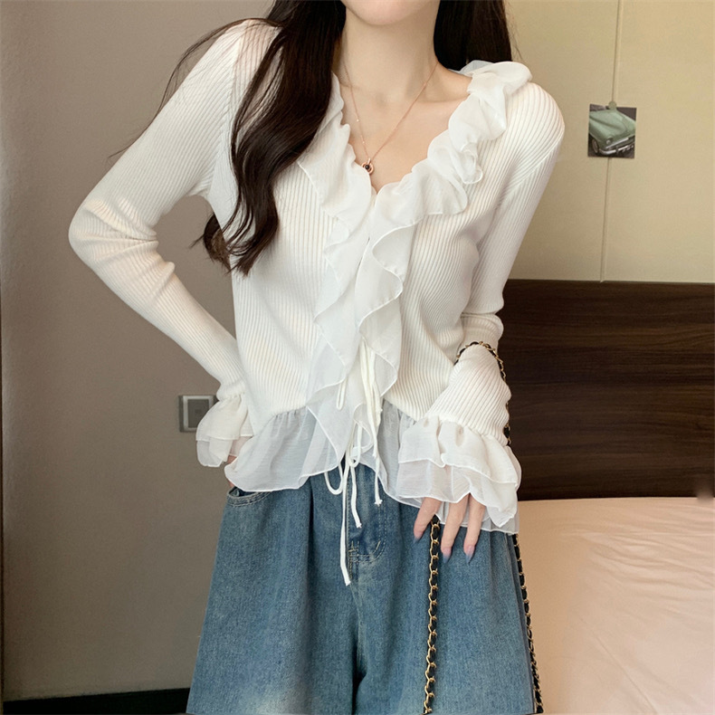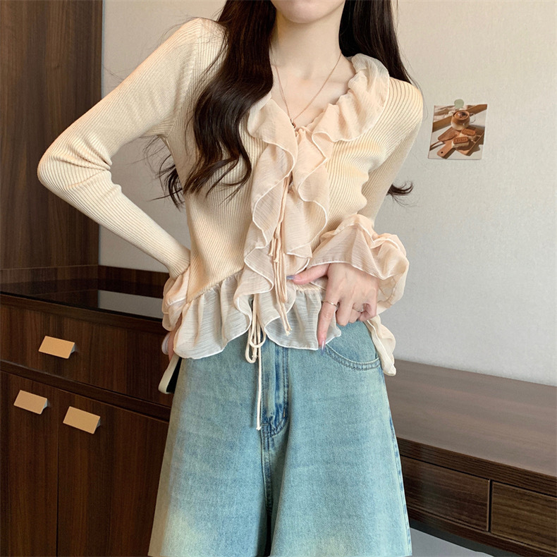 한국식 가을 겨울 디자인 센스 틈새 프릴 스트랩 긴팔 스웨터 여성용 우아한 모든 매치 여성용 쇼트 탑스토어 가기