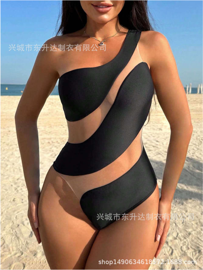 Dongshengda 2024 새로운 유럽과 미국의 섹시한 꽉 메쉬 접합 중공 원 숄더 원피스 여성 수영복 비키니