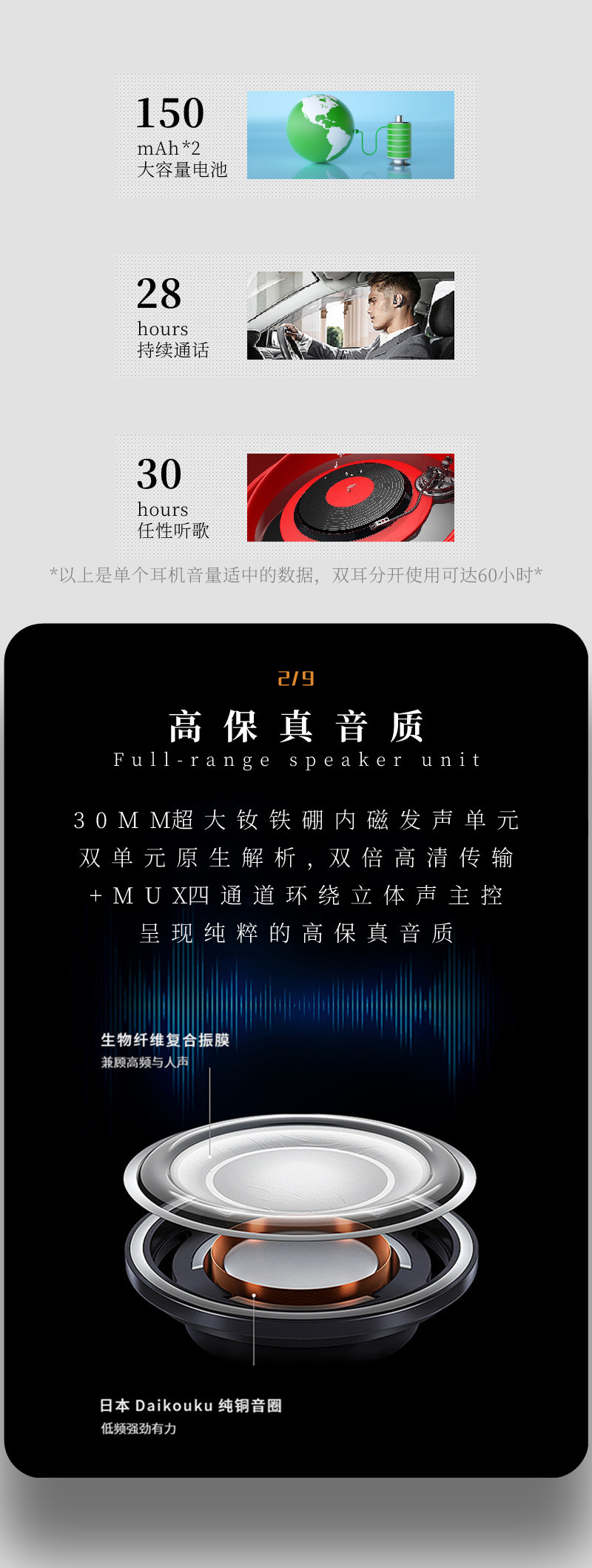 150毫A品电芯/个 单个耳机最大音量13H续航