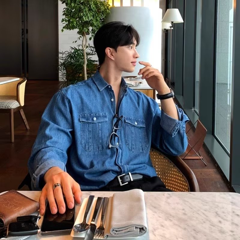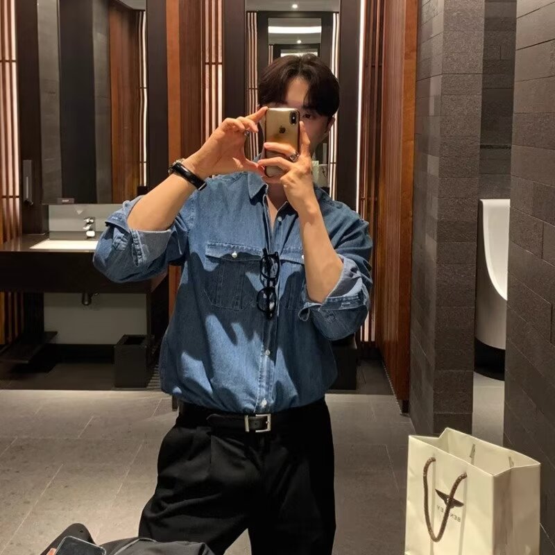 워싱 디스트레스드 데님 셔츠 남성 봄 한국 스타일 루즈한 하이엔드 긴팔 워크 셔츠스토어 가기