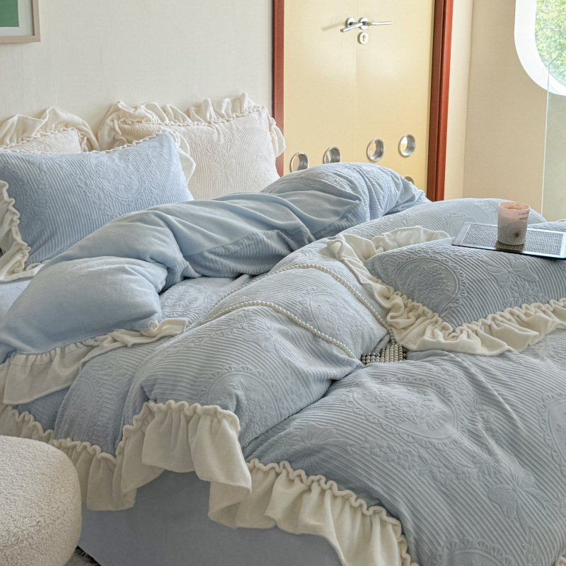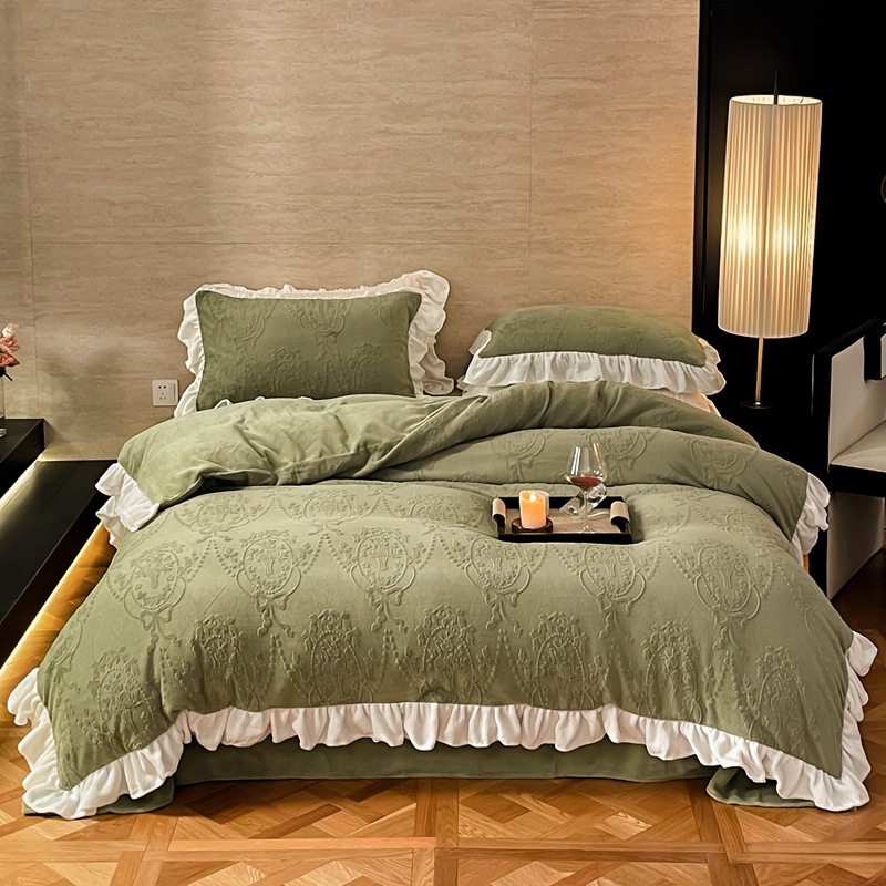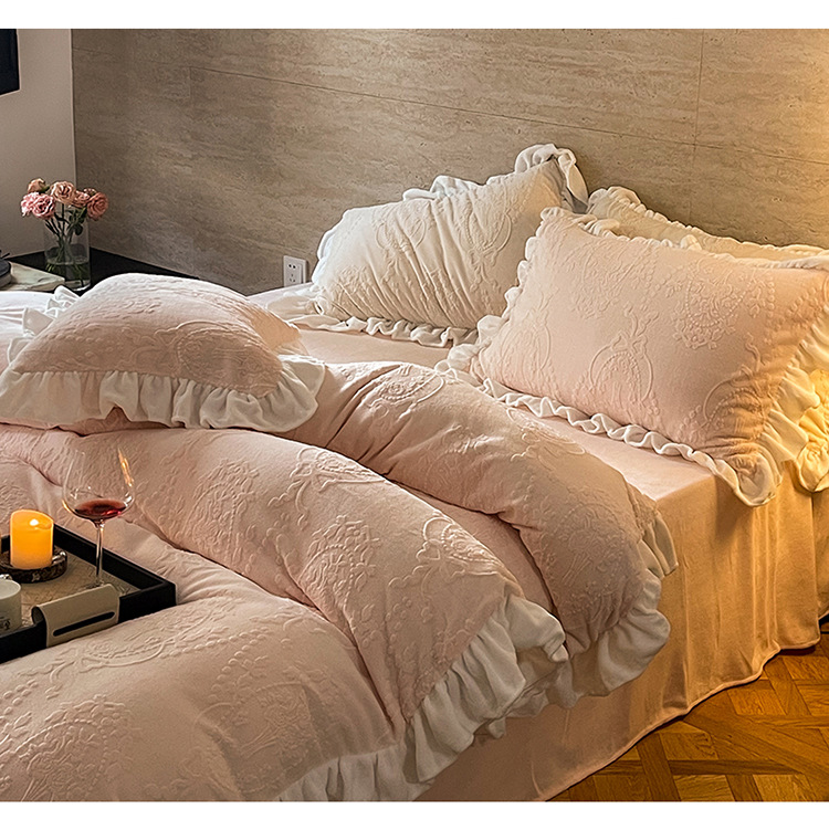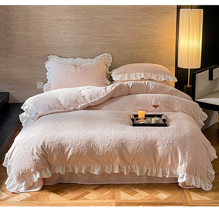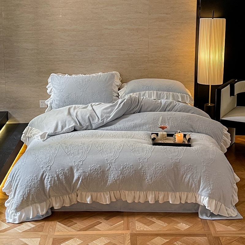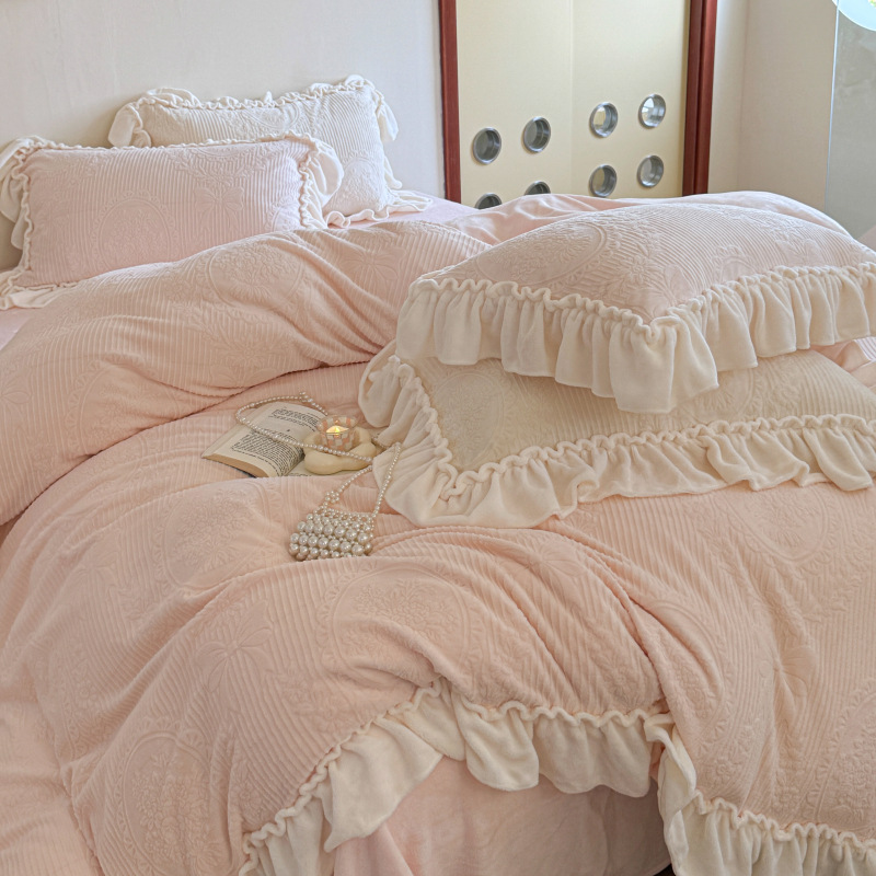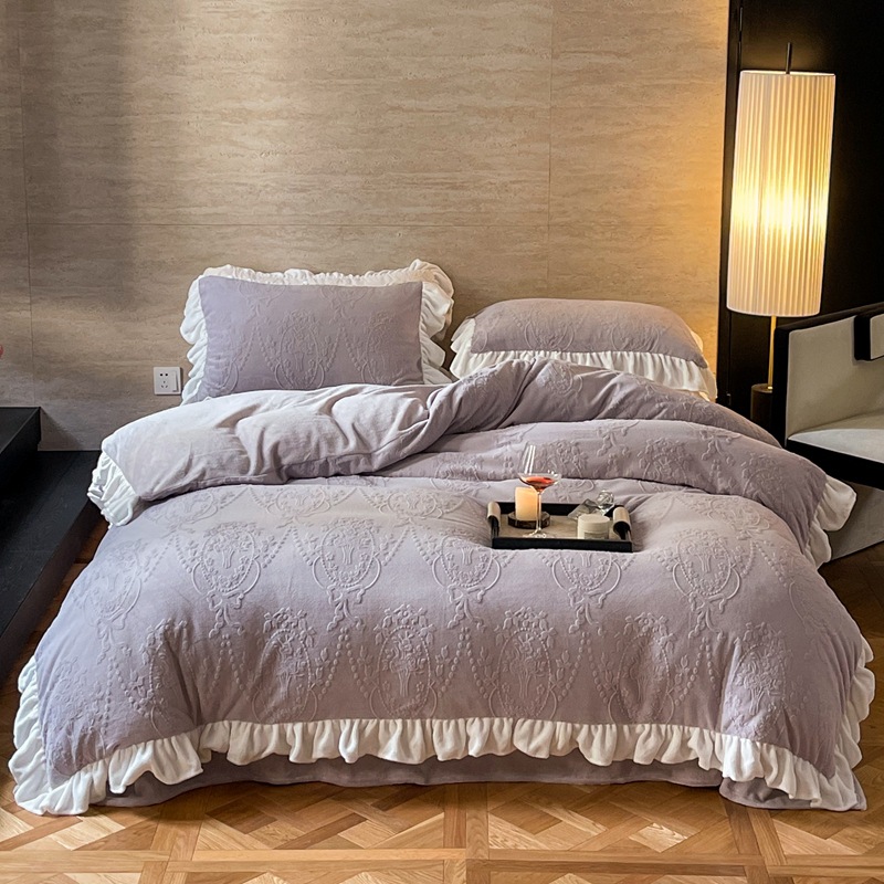레이스 스타일 밀크 벨벳 4종 세트, 두꺼운 가을 겨울 따뜻한 공주풍 침대 4종 세트, 겨울용 플란넬 세트
