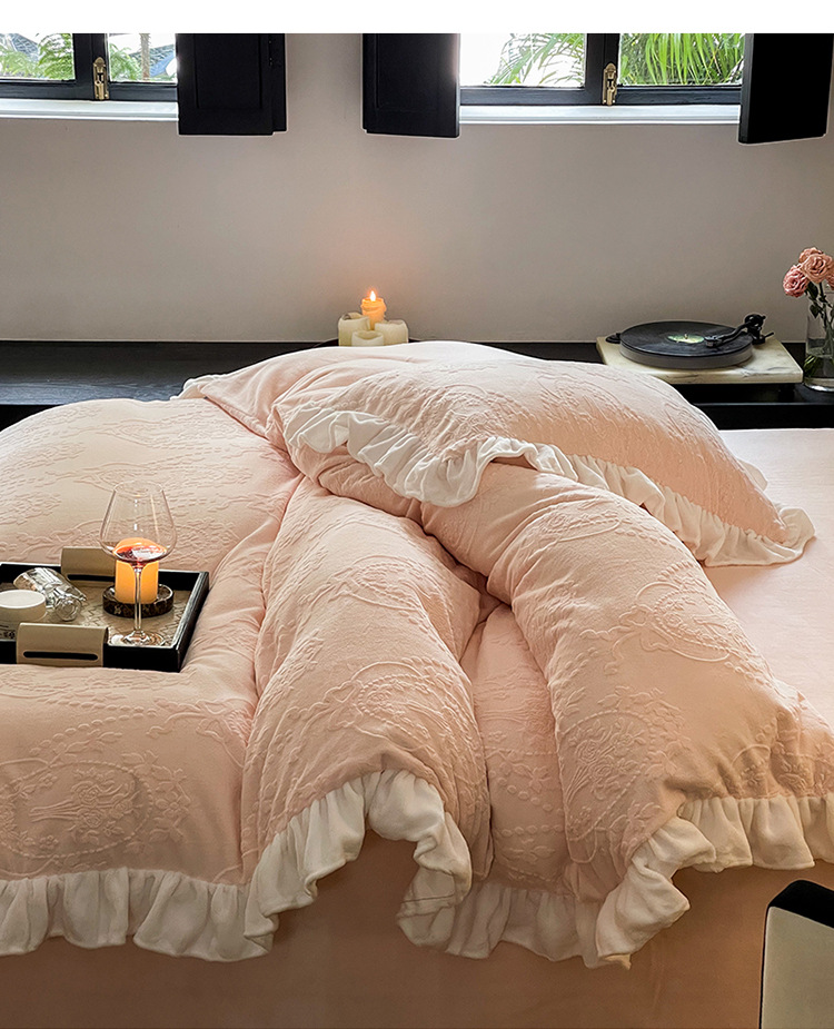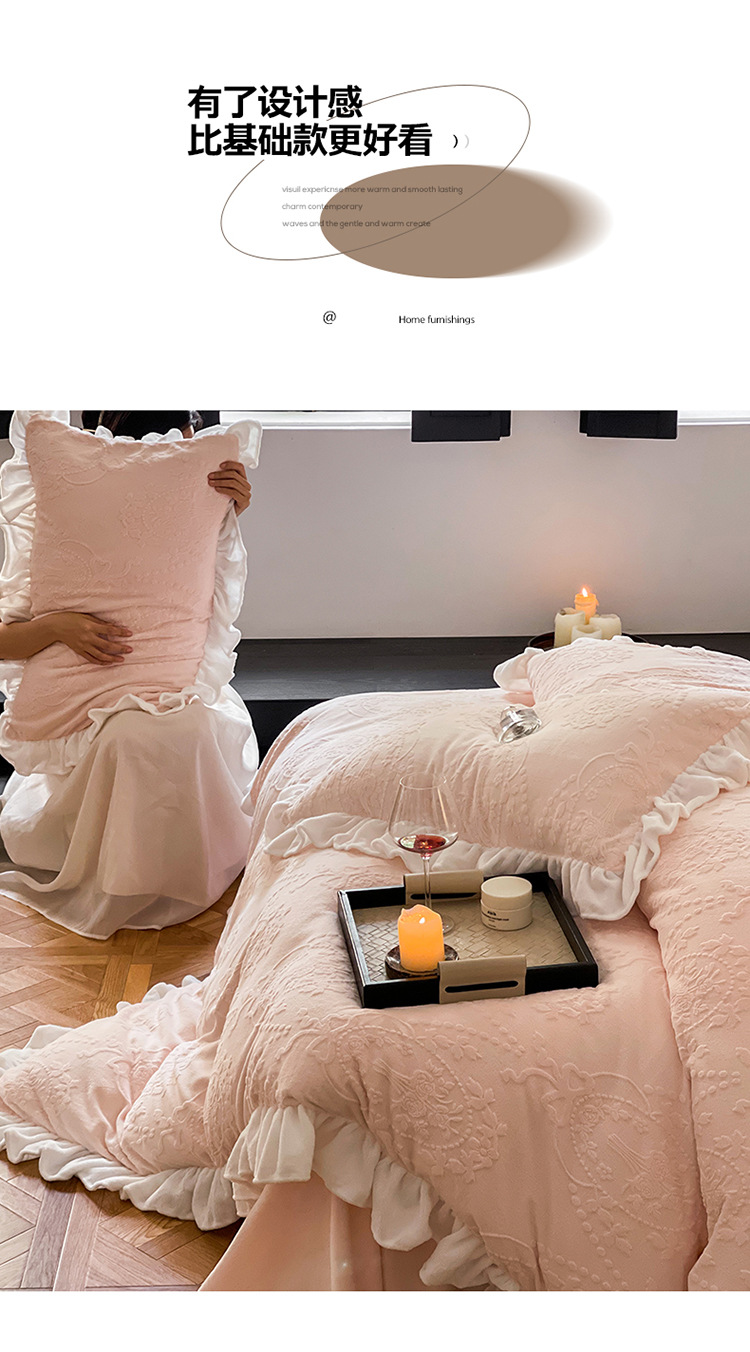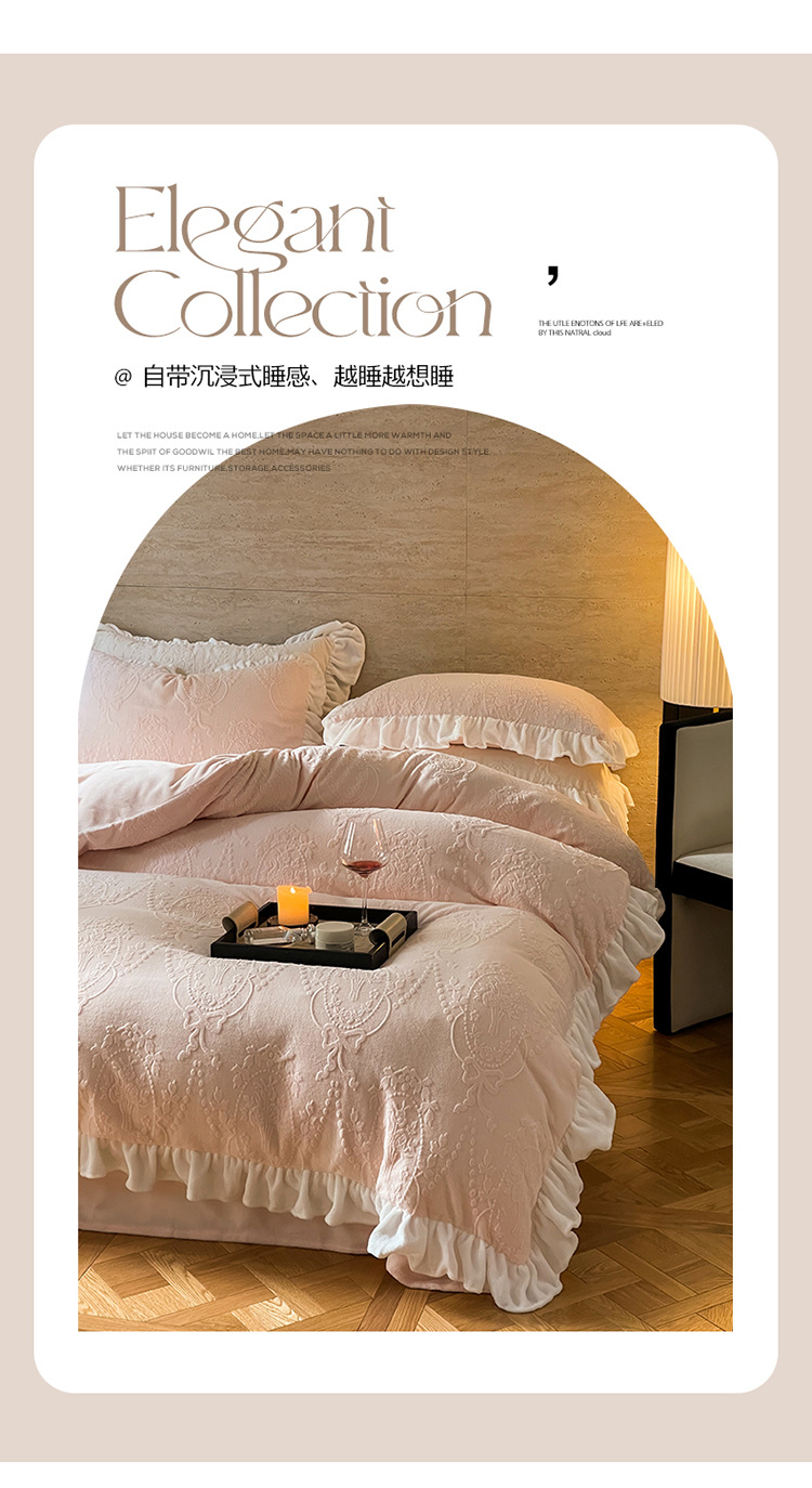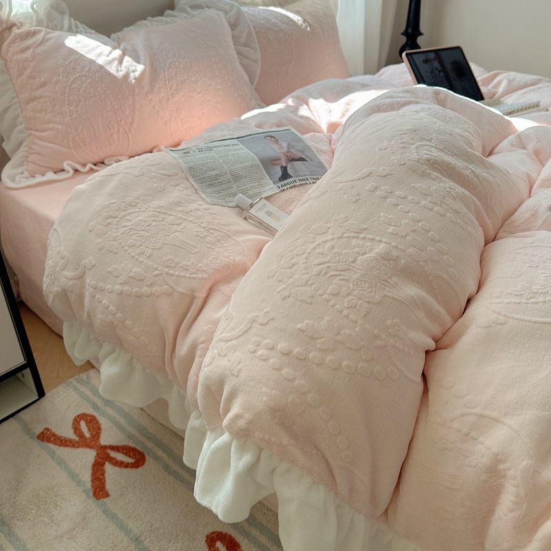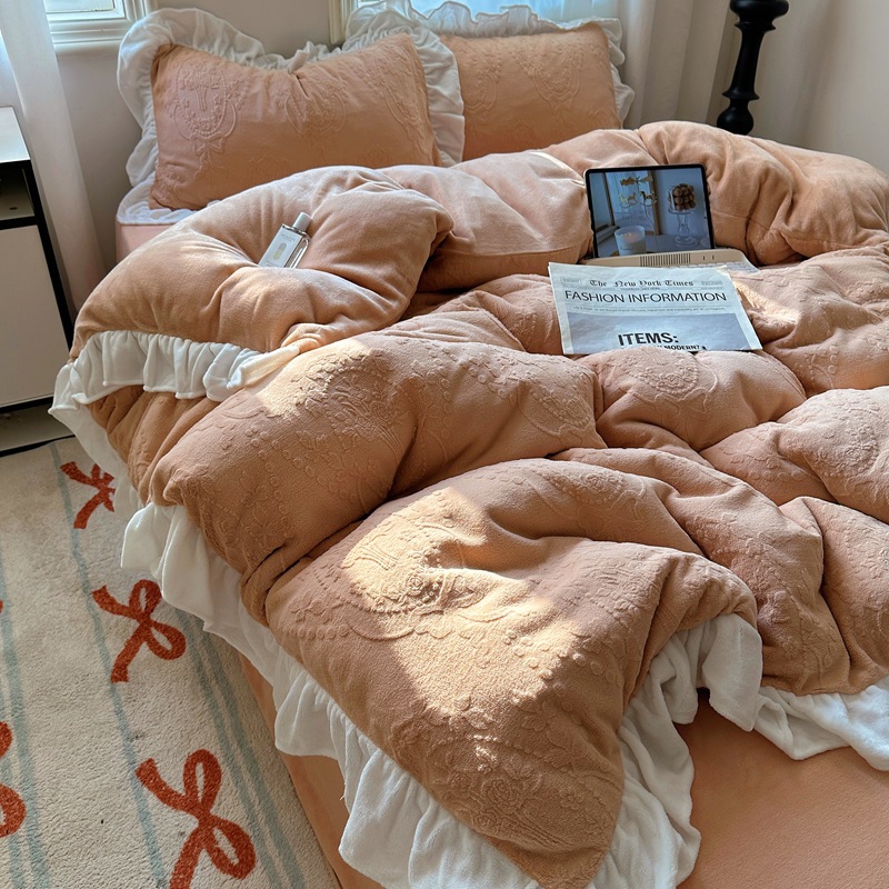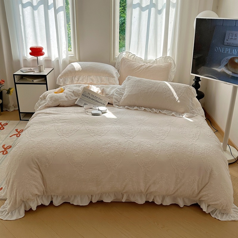 레이스 스타일 밀크 벨벳 4종 세트, 두꺼운 가을 겨울 따뜻한 공주풍 침대 4종 세트, 겨울용 플란넬 세트