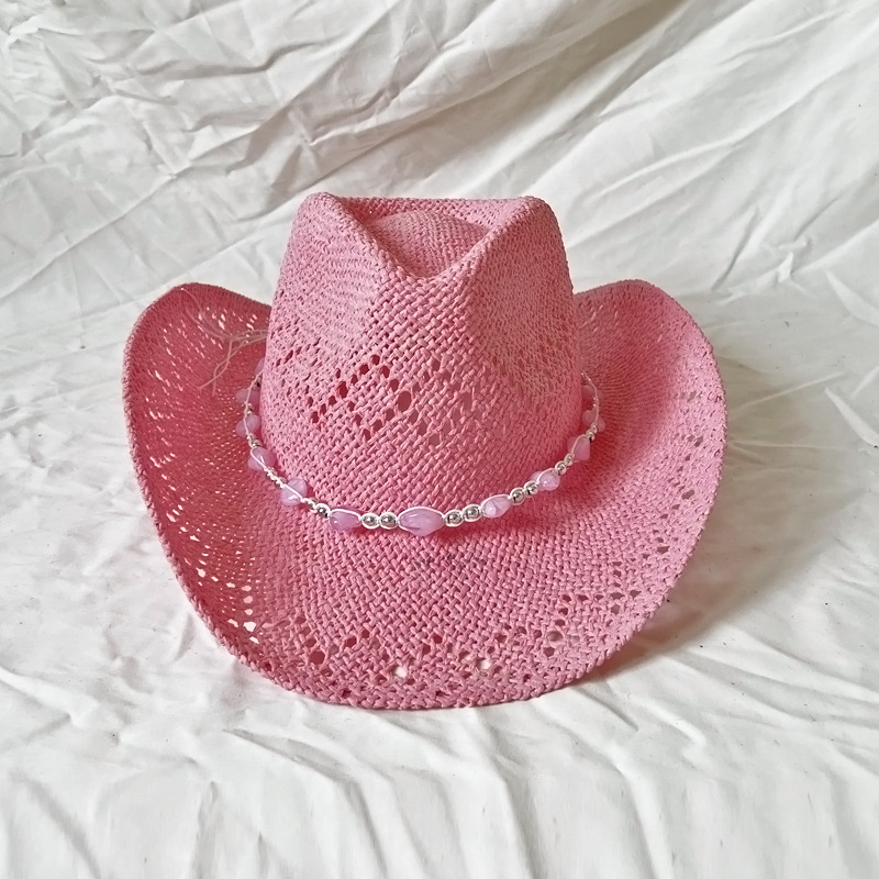 하트 모양 구슬 장식 밀짚모자 수제 빈티지 데님 모자 넓은 챙 말아 올린 챙 서부 스타일