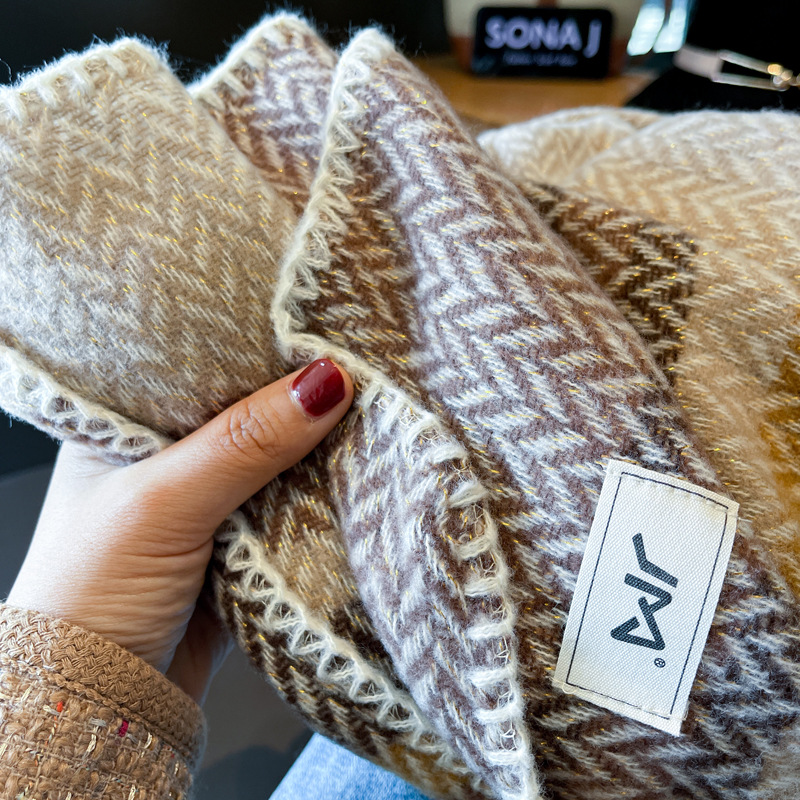 한국 스타일 모든 매치 라이트 럭셔리 밝은 실크 헤링탑 스트라이프 울 스카프 여성 가을과 겨울 두꺼운 따뜻한 대형 숄