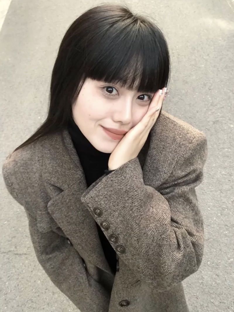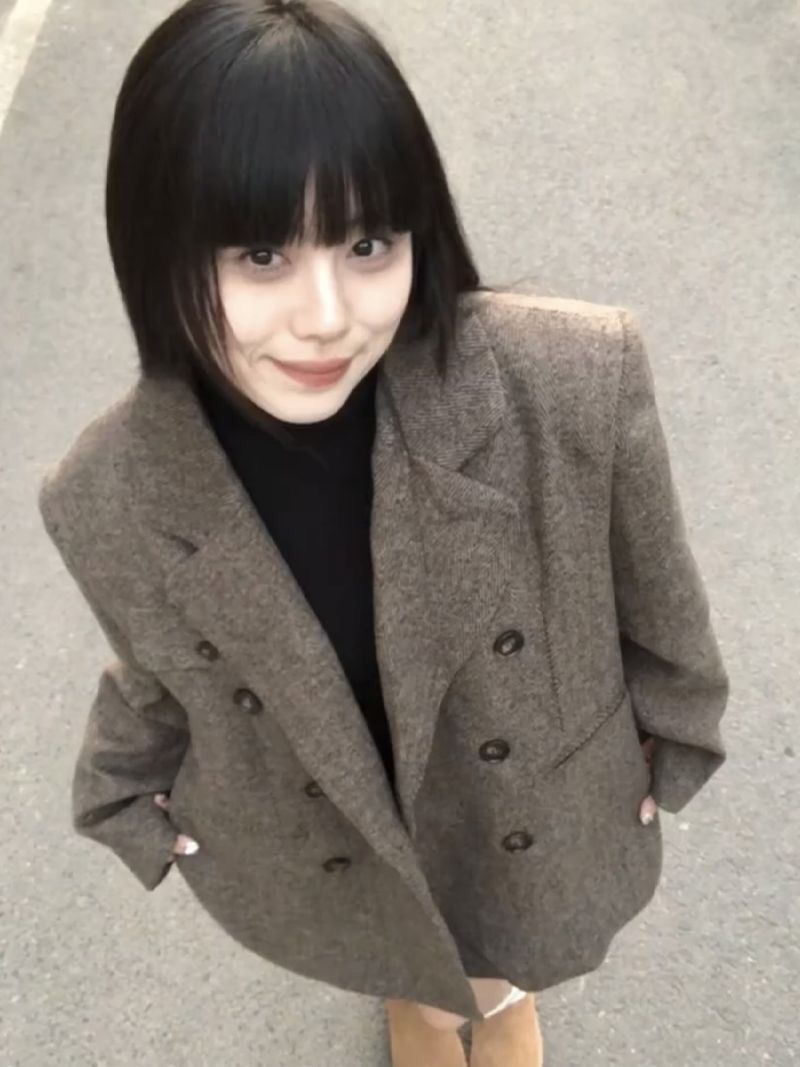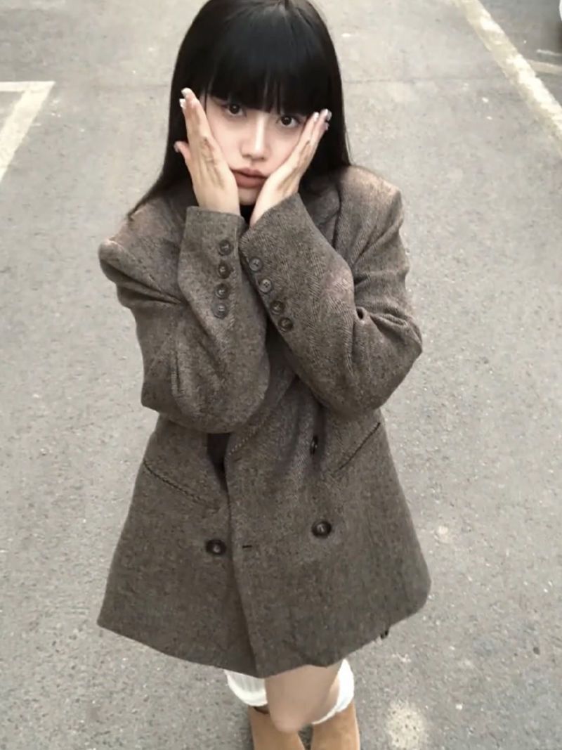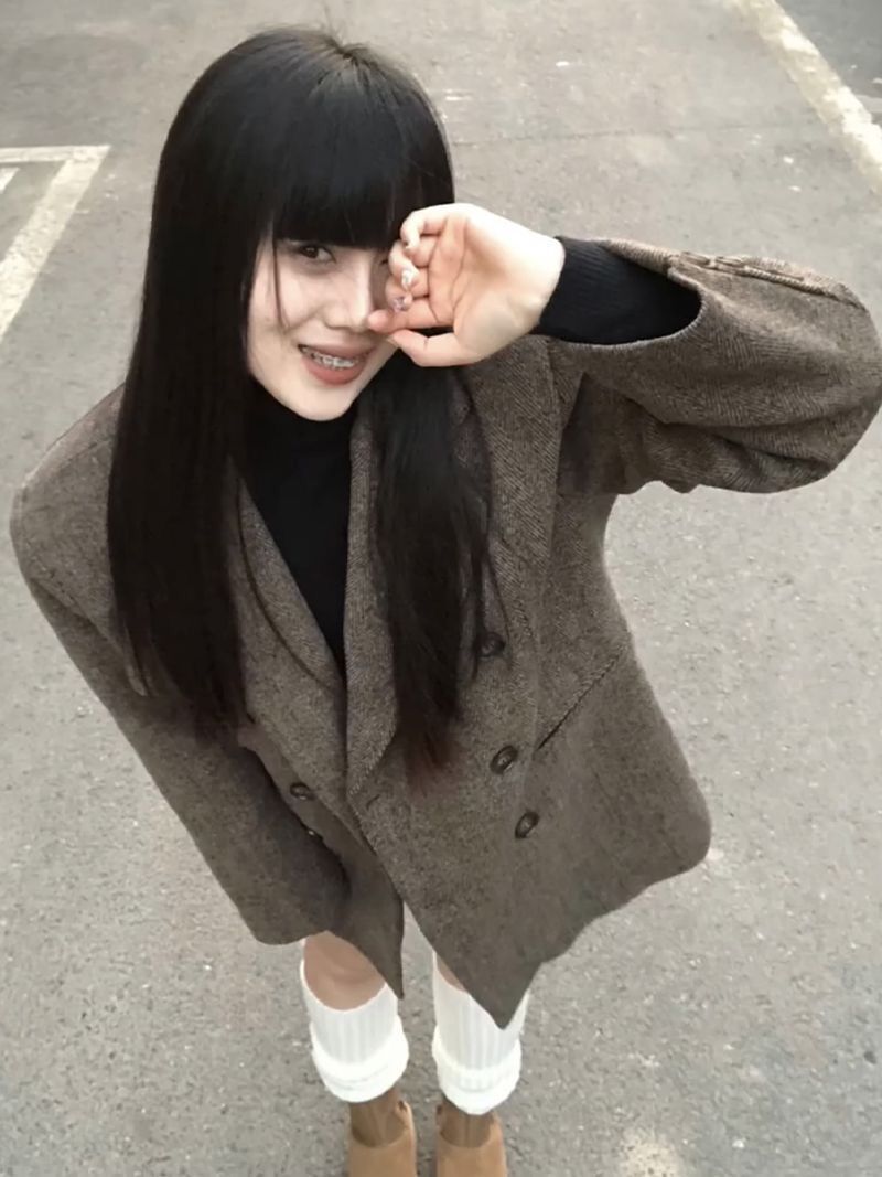 고급 레트로 다크 브라운 모직 세트 재킷 여자의 겨울 틈새 우아한 느슨한 캐주얼 두꺼운 모직 코트스토어 가기