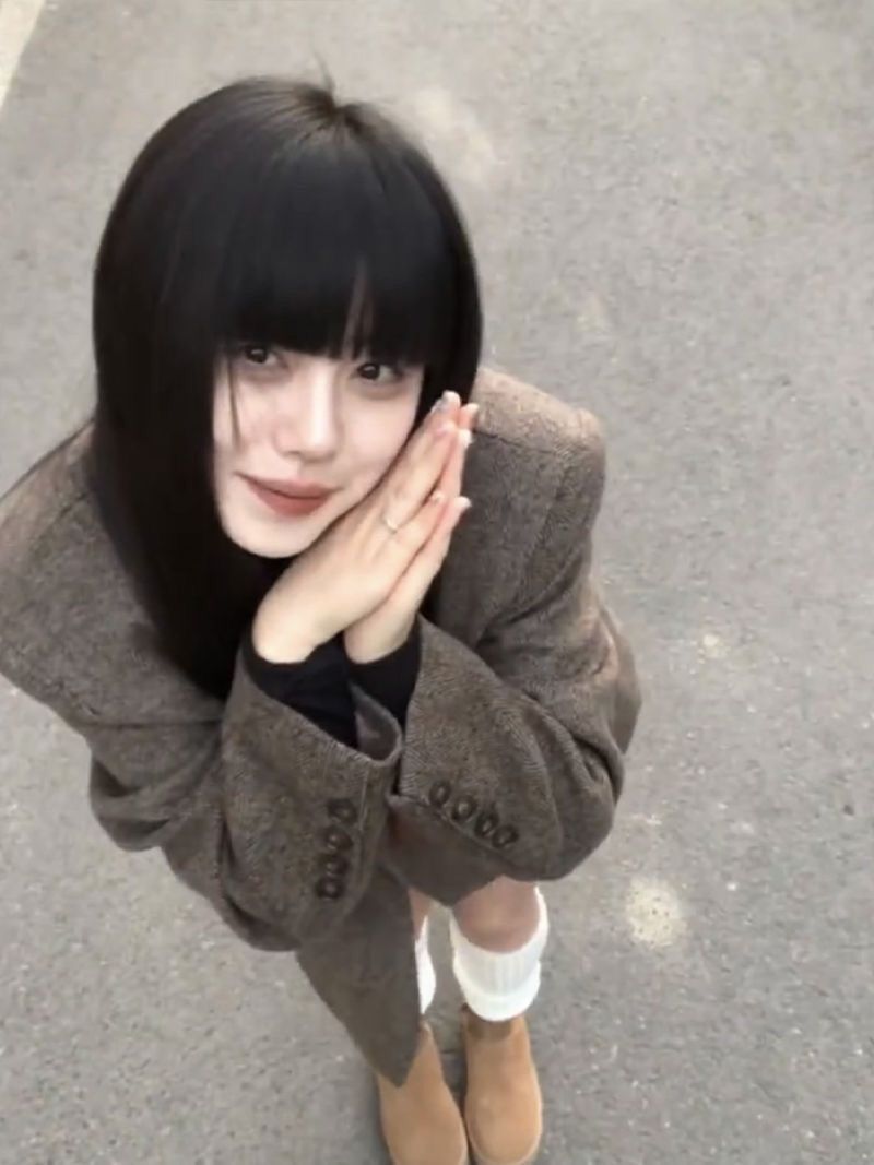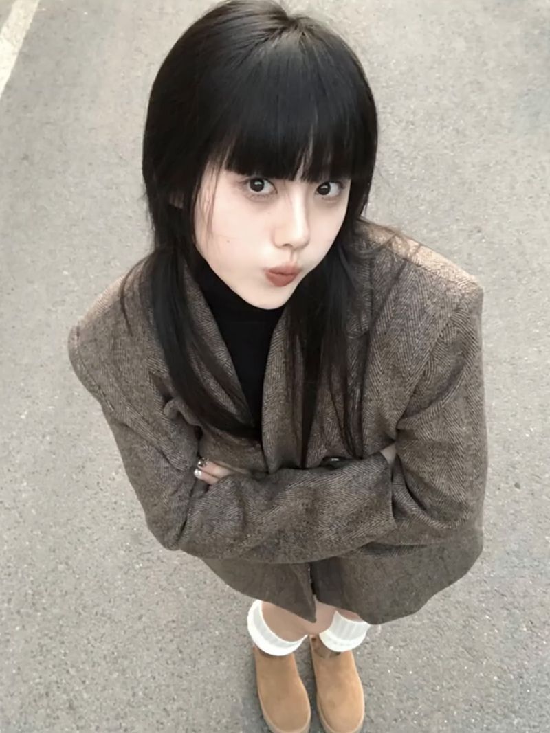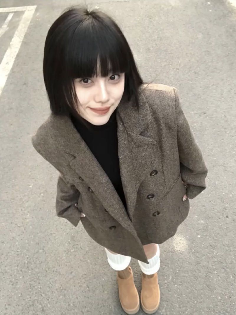 고급 레트로 다크 브라운 모직 세트 재킷 여자의 겨울 틈새 우아한 느슨한 캐주얼 두꺼운 모직 코트