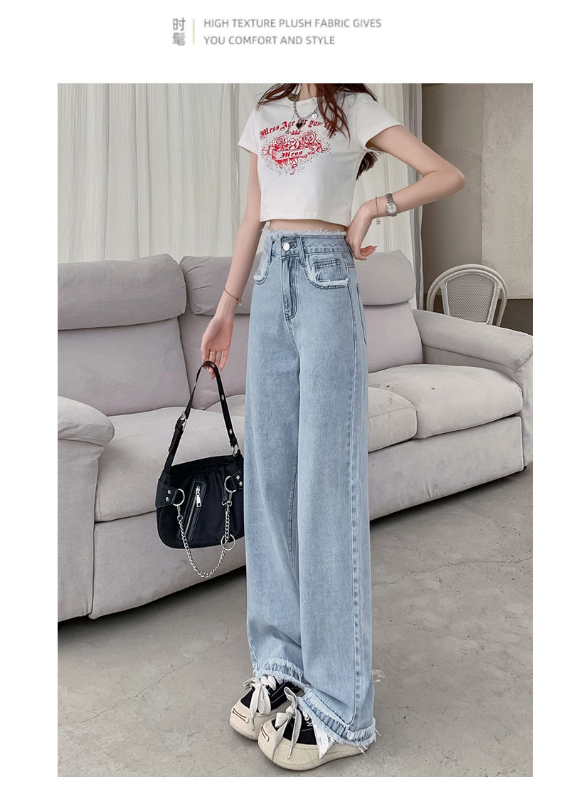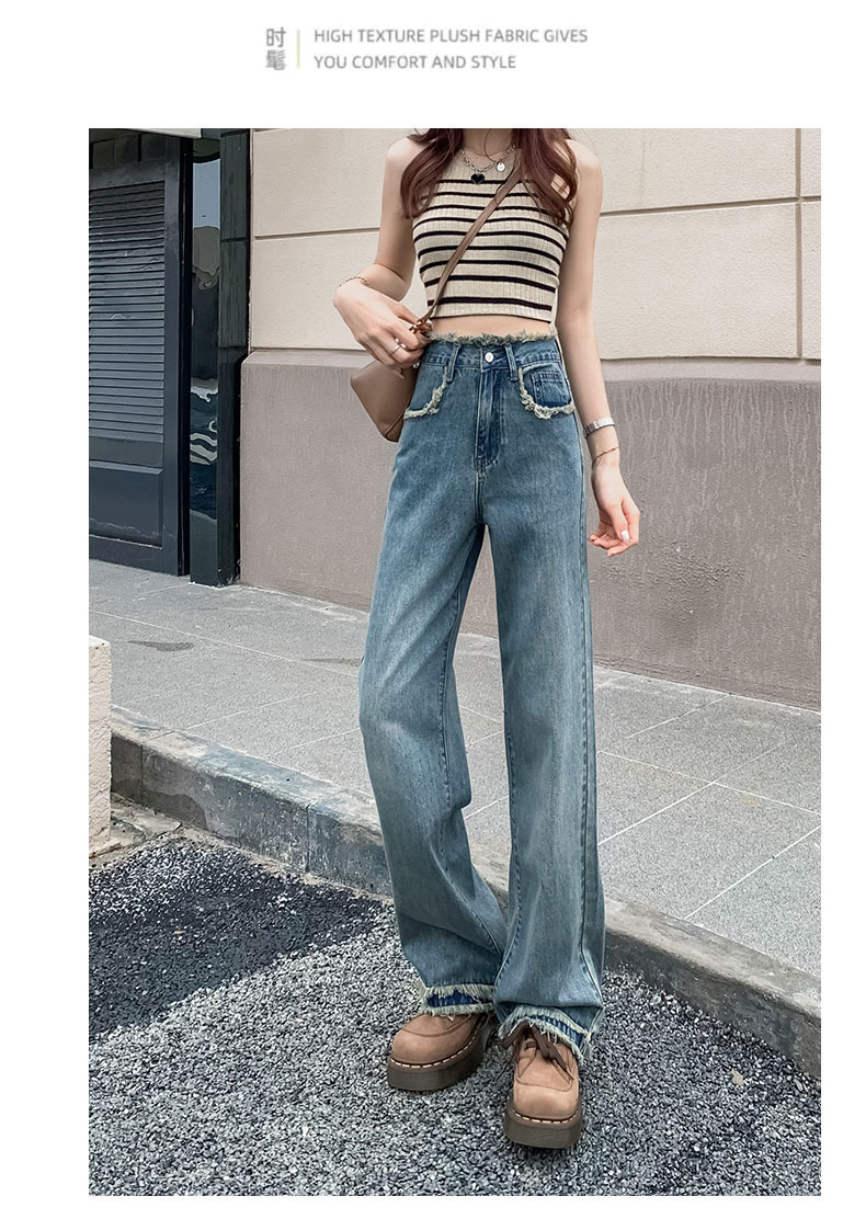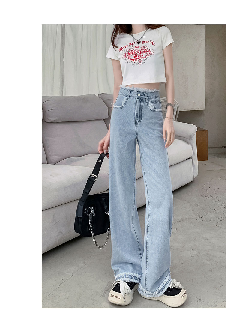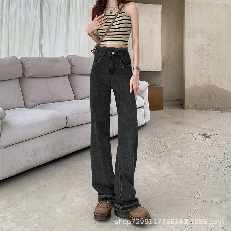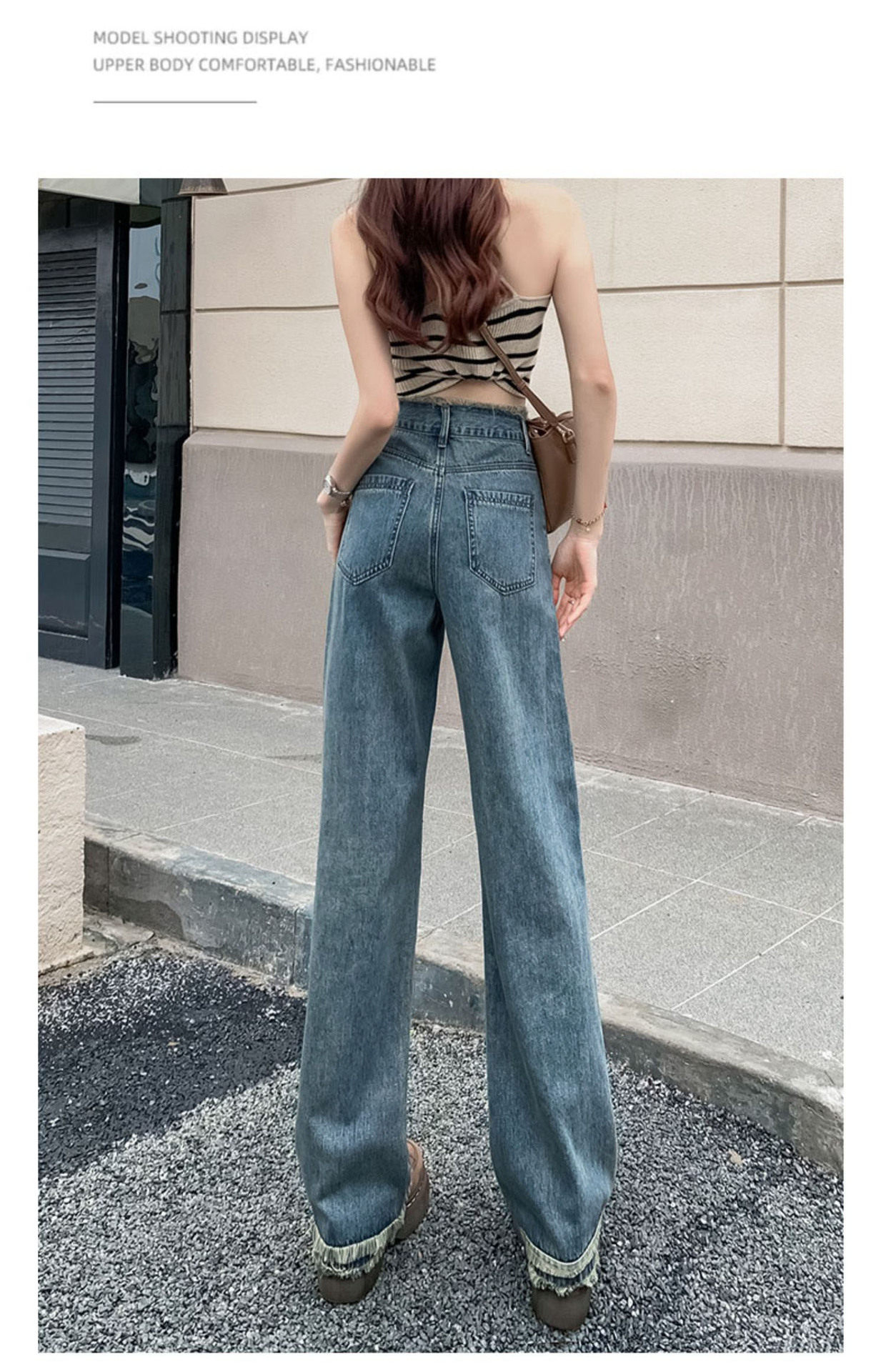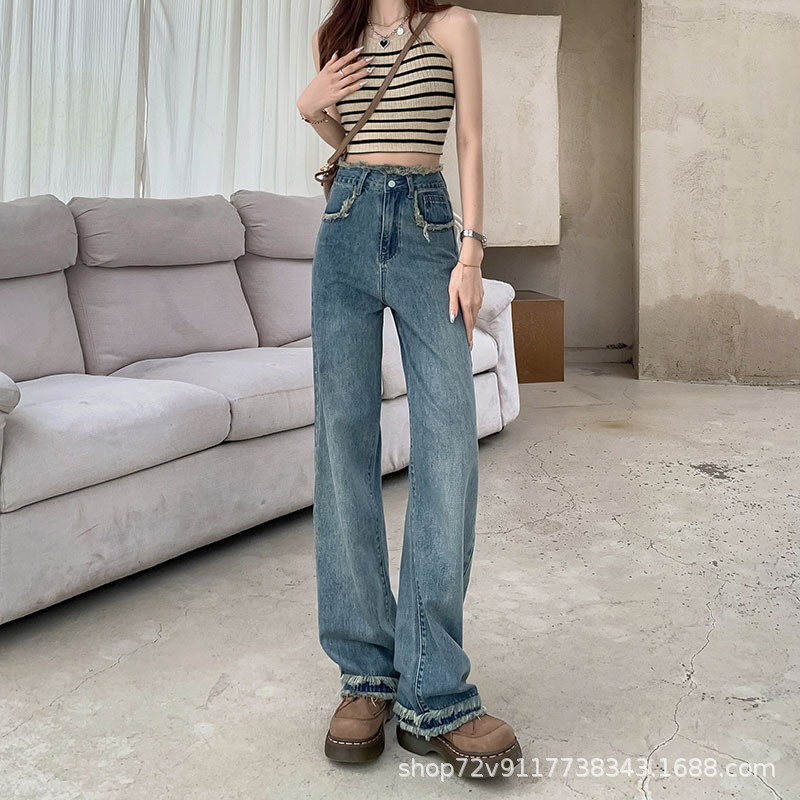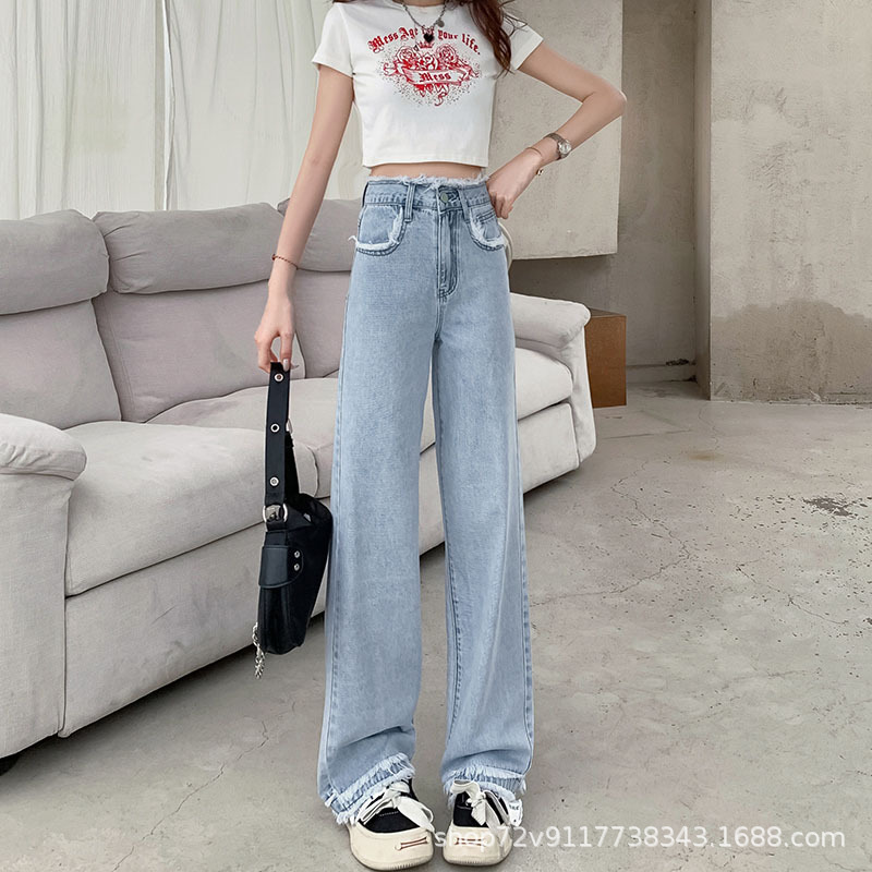 화이트 스트레이트 레그 진 여성용 슬림하게 보이는 2023 가을 새로운 디자인 느낌 랩 하이 웨이스트 느슨한 와이드 레그 팬츠