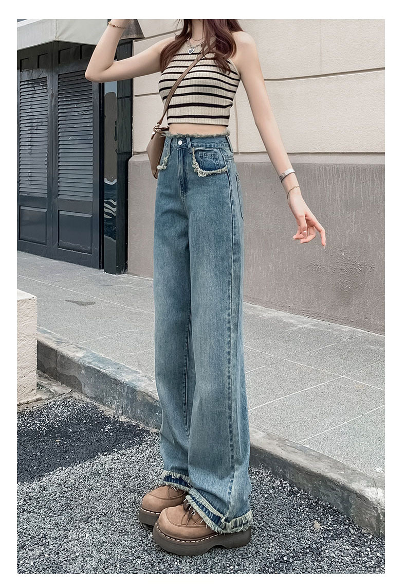 화이트 스트레이트 레그 진 여성용 슬림하게 보이는 2023 가을 새로운 디자인 느낌 랩 하이 웨이스트 느슨한 와이드 레그 팬츠스토어 가기