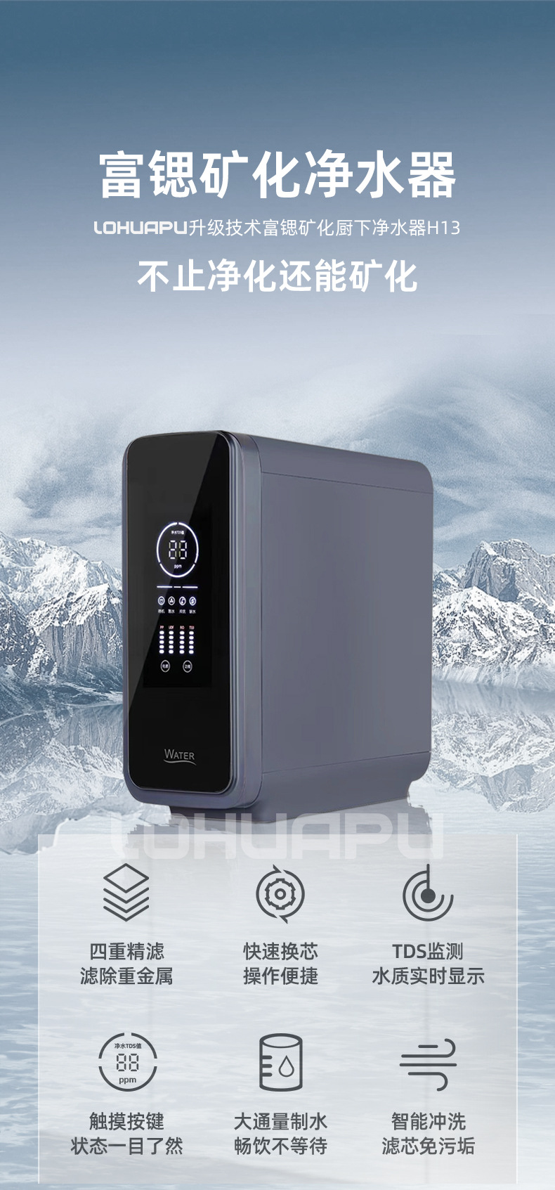 600g 큰 흐름 스트론튬이 풍부한 미네랄 워터 정수기 로 역 삼투 수돗물 청정기 주방 정수기 가정용
