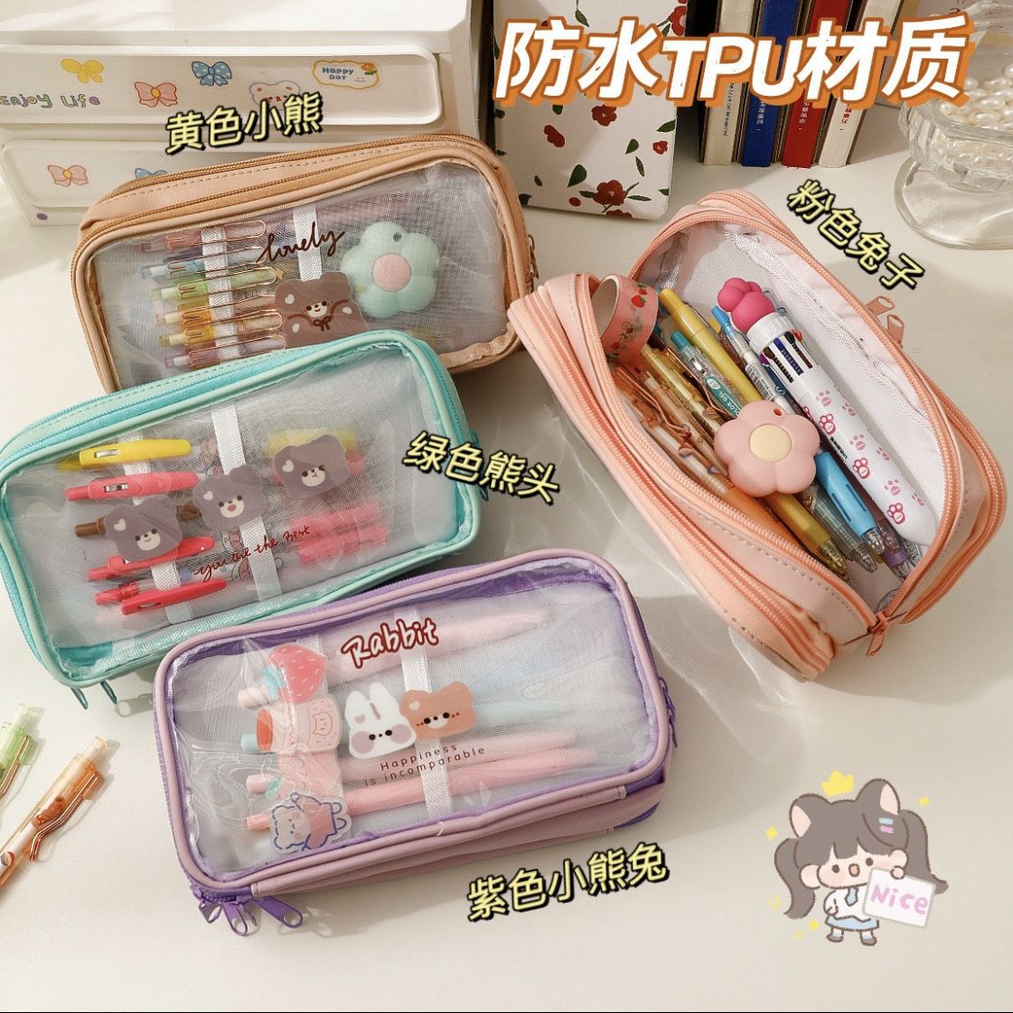 다채로운 캔디 컬러의 투명 대용량 다층 수납 가방, 곰돌이 지퍼 만화 필통 문구류