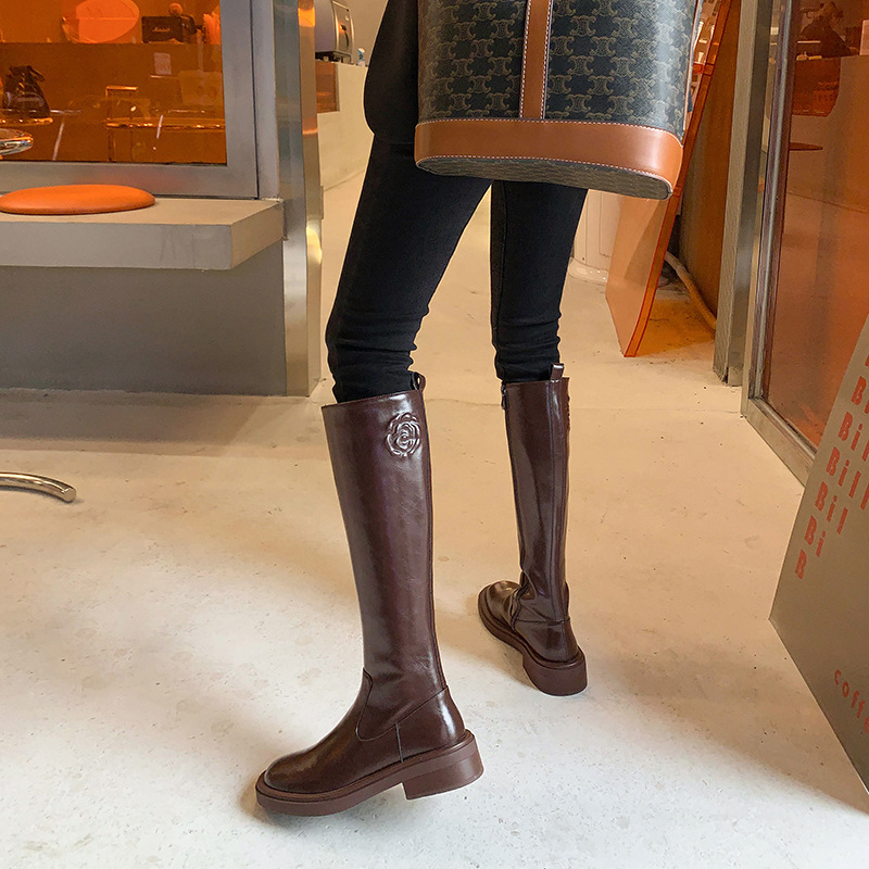 위안 서클 전체 소가죽 ~ 새로운 동백 가죽 높은 부츠 여성 기사 부츠 다크 브라운 부츠 작은 향기로운 부츠