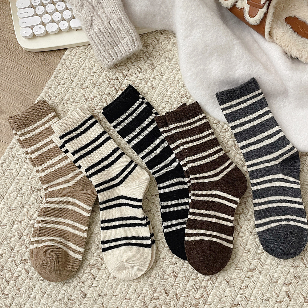 양말 여성의 따뜻한 스트라이프 울 양말 가을과 겨울 한국 빈티지 중간 길이 양말 인터넷 연예인 두꺼운 상어 바지