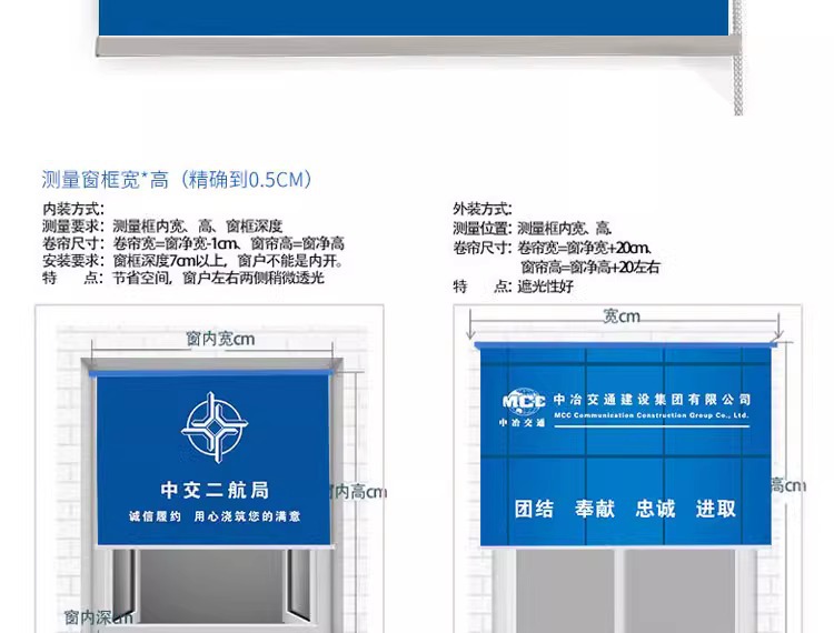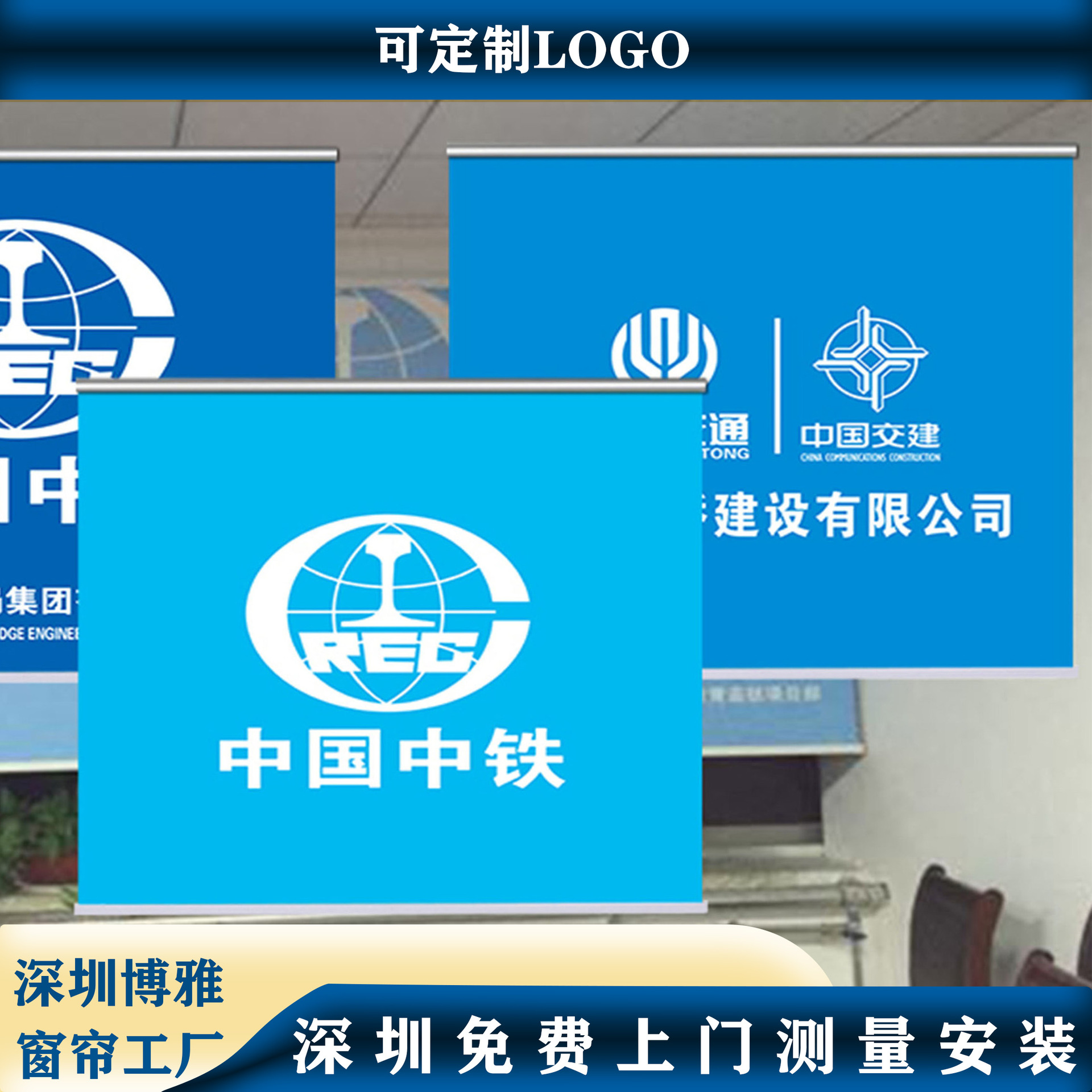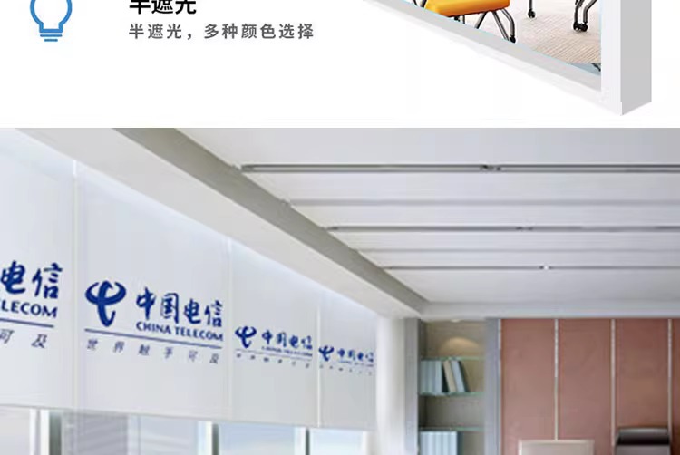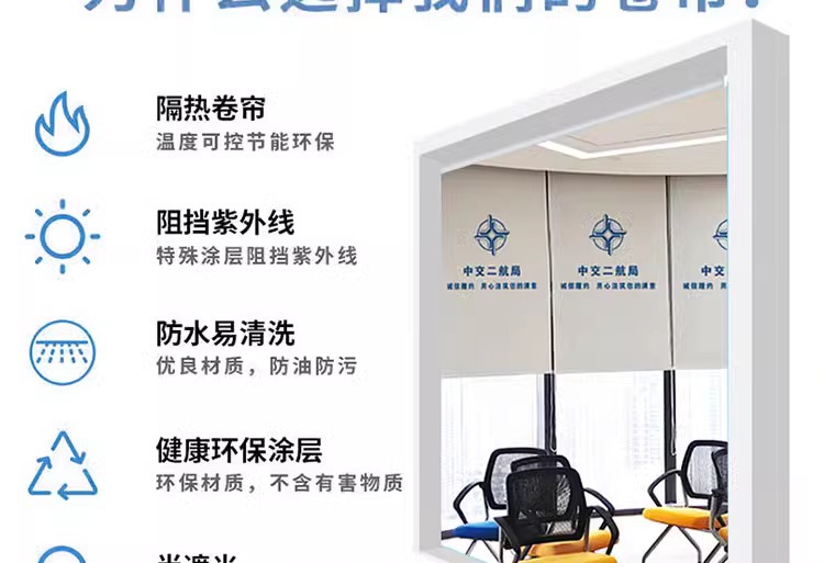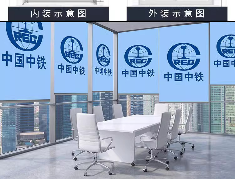 국경을 넘는 사무실 롤스크린 프로젝트는 로고 광고를 추가할 수 있으며, 두꺼운 차양 및 단열 기능이 있으며, 구멍을 뚫지 않고도 작동할 수 있습니다.