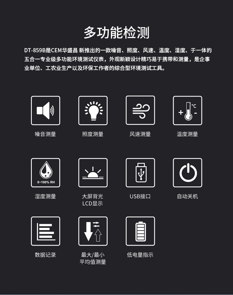 Huashengchang DT-859B 전문 다기능 환경 테스트 미터 소음 조명 풍속 온도 및 습도 5 대 1
