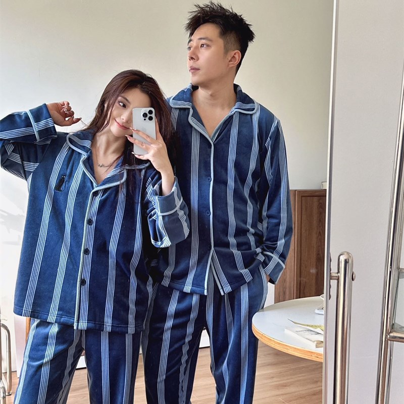 가을과 겨울 커플 실버 폭스 벨벳 잠옷 여자 줄무늬 소년 기모 두꺼운 커플 플란넬 따뜻한 잠옷 세트