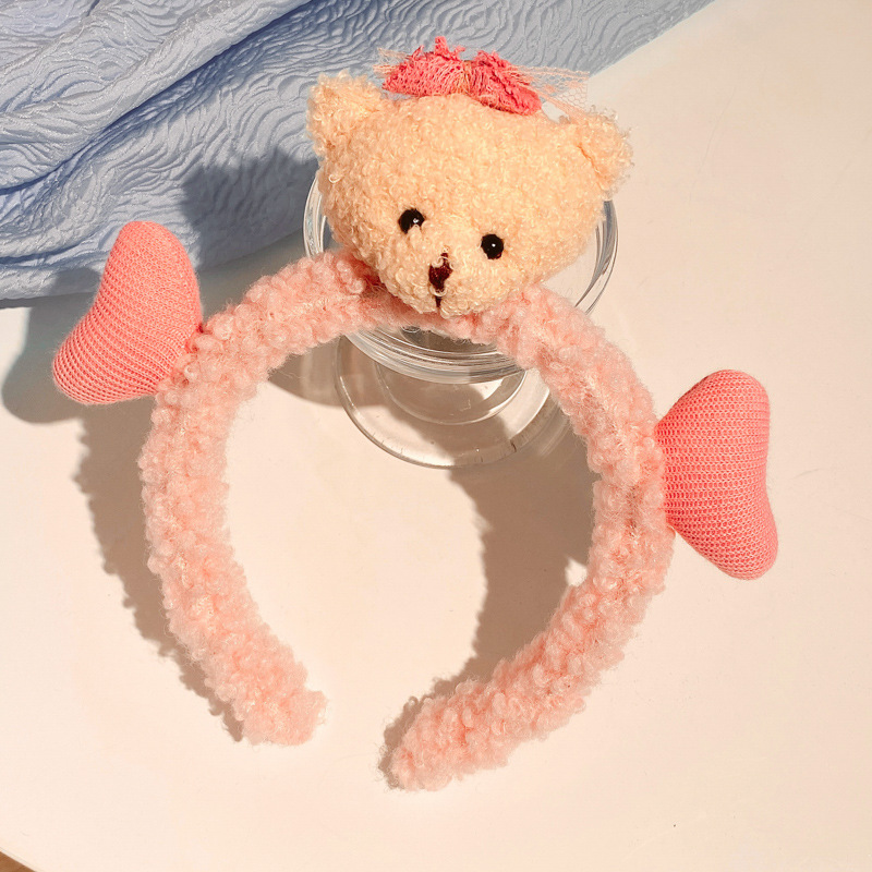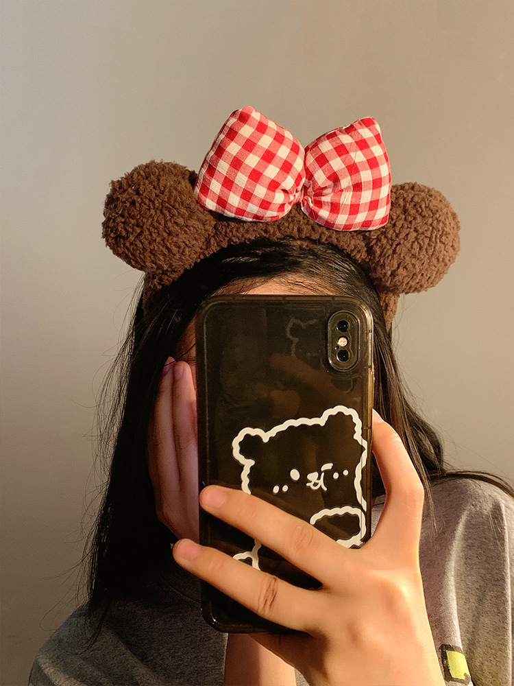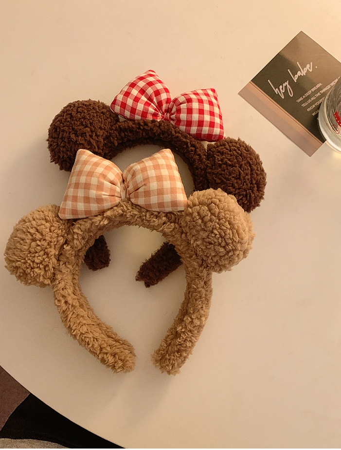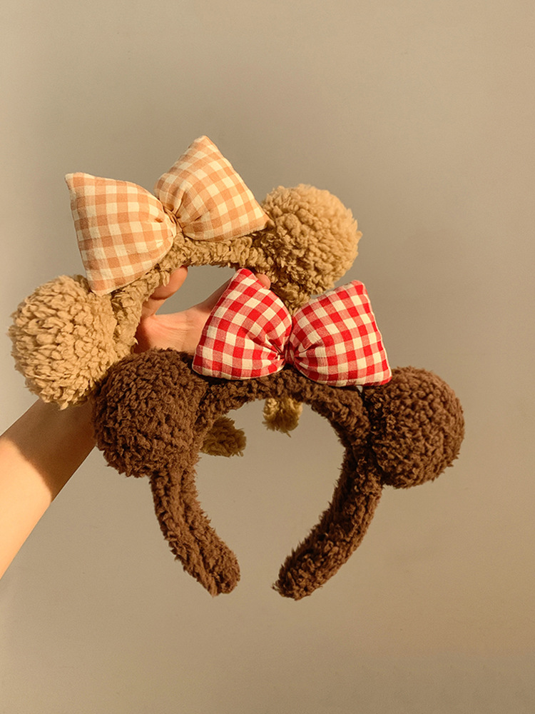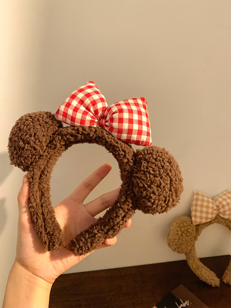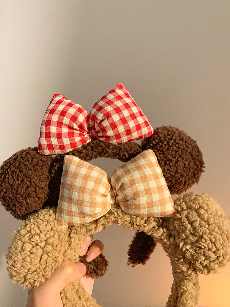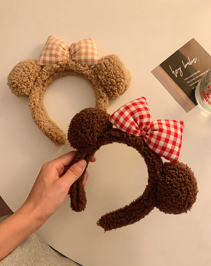 귀여운 격자 무늬 활 곰 봉제 헤어 밴드 여성용 만화 세안 압력 헤어 밴드 미끄럼 방지 헤어 클립 헤어 번들 모자
