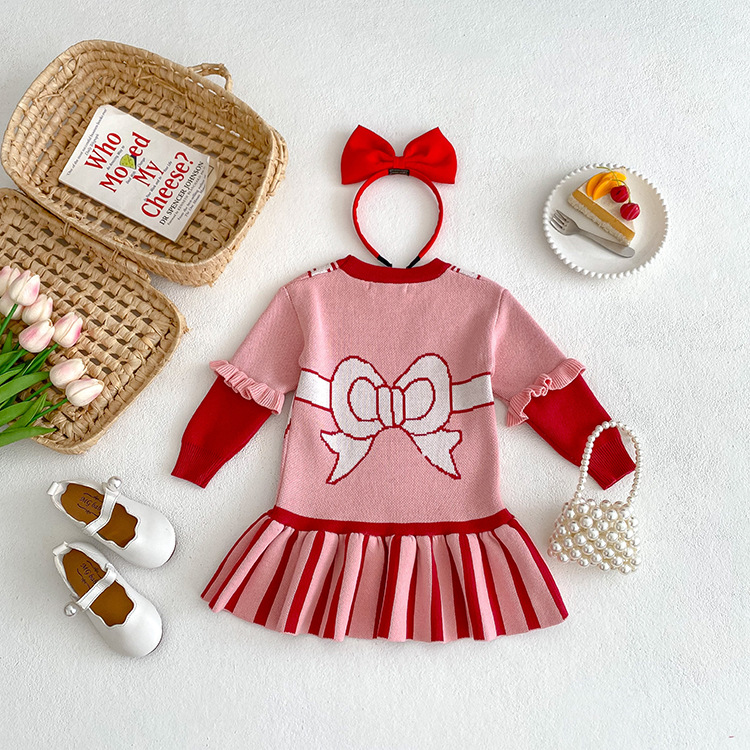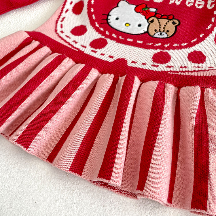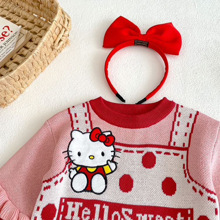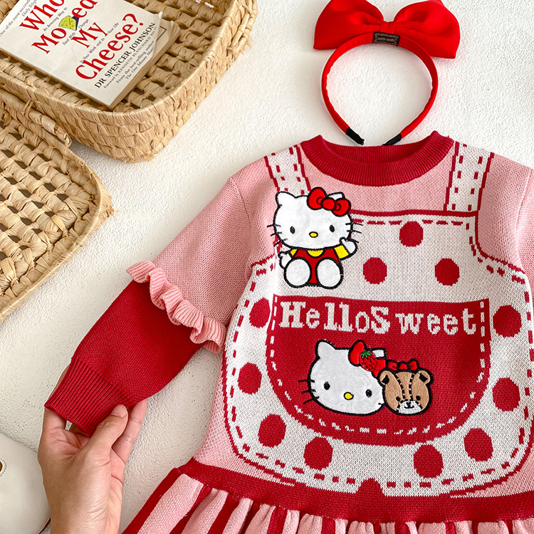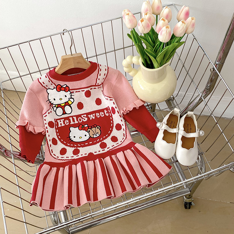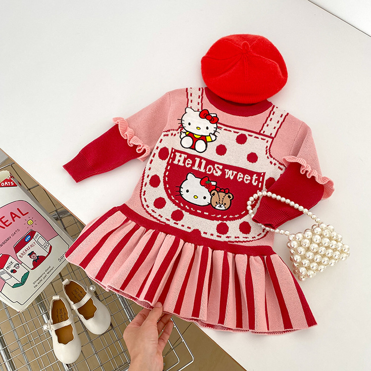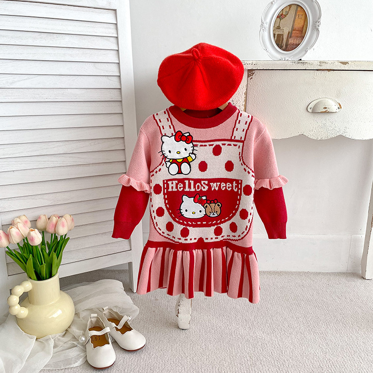 2023 소녀 가을과 겨울 새로운 KT 고양이 곰 귀여운 스웨터 원피스 승무원 목 긴 소매 니트 어린이 원피스