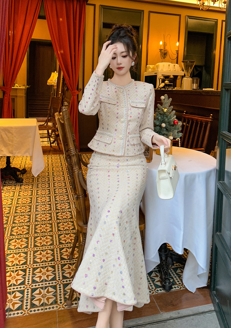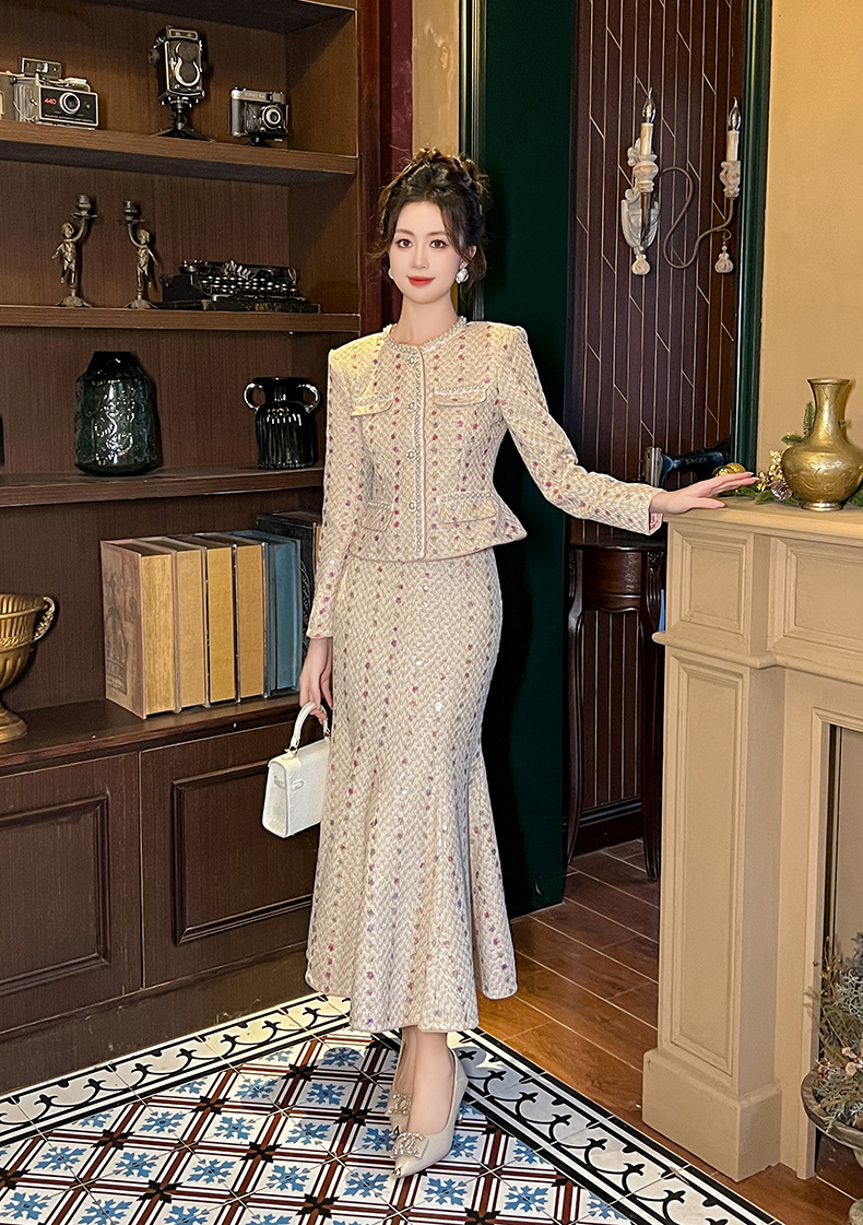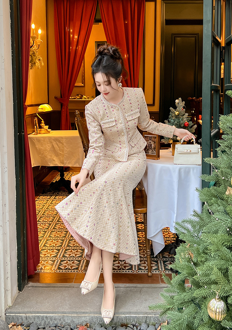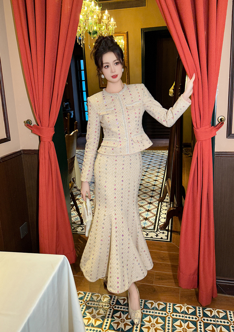 2025 가을 겨울 신상 여성용 샤넬 스타일 재킷 상의 하이웨이스트 피쉬테일 스커트 투피스 세트 50626