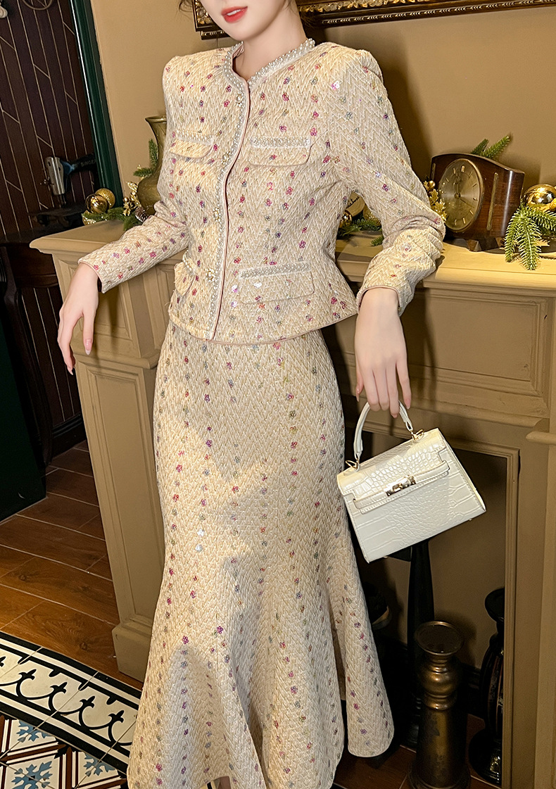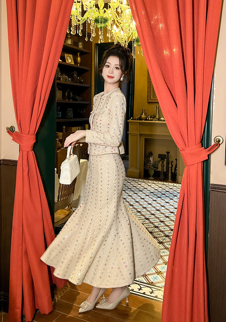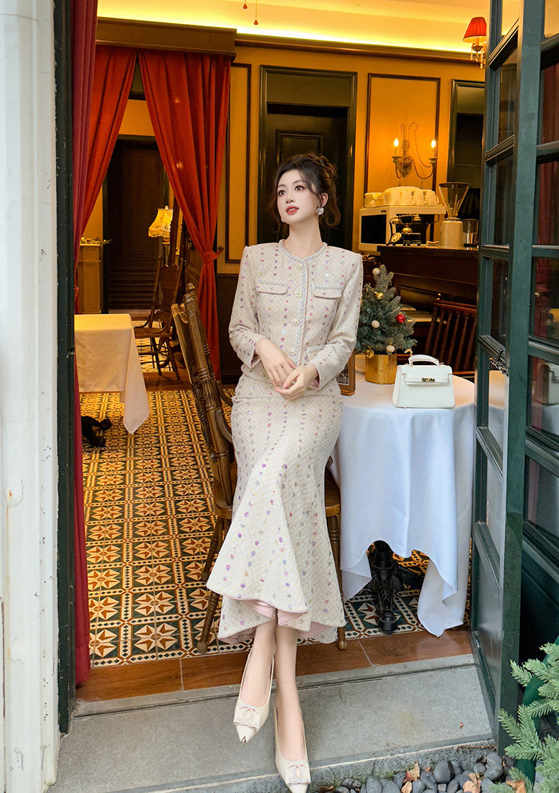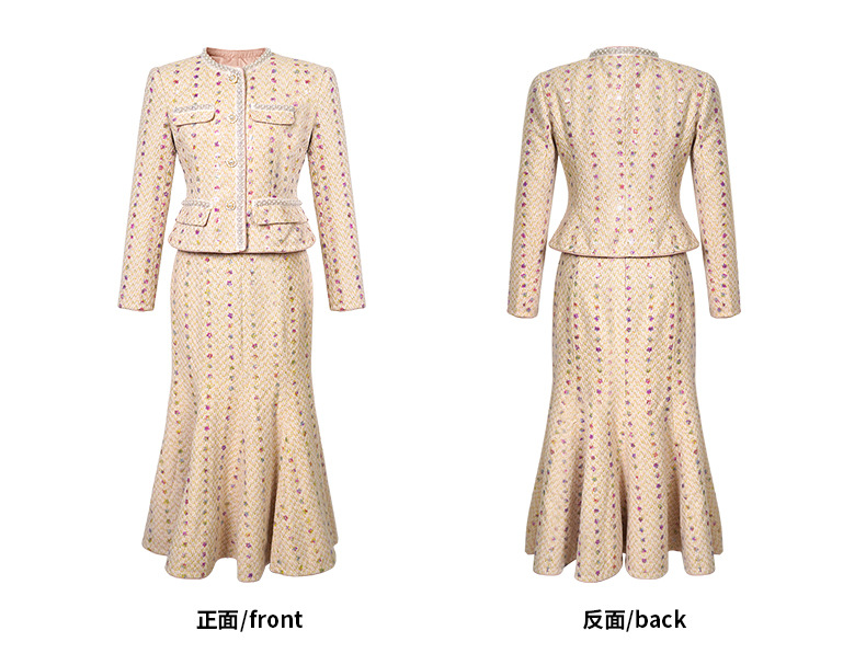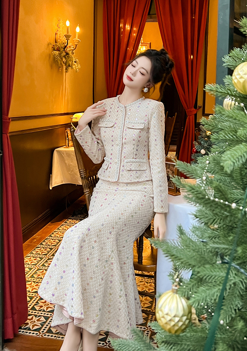 2025 가을 겨울 신상 여성용 샤넬 스타일 재킷 상의 하이웨이스트 피쉬테일 스커트 투피스 세트 50626