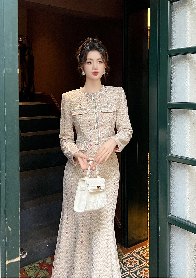 2025 가을 겨울 신상 여성용 샤넬 스타일 재킷 상의 하이웨이스트 피쉬테일 스커트 투피스 세트 50626스토어 가기