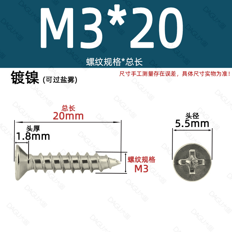 • 카운터 침몰 헤드 셀프 태핑 M3 * 20 니켈 도금 (소금 스프레이를 통과 할 수 있음)