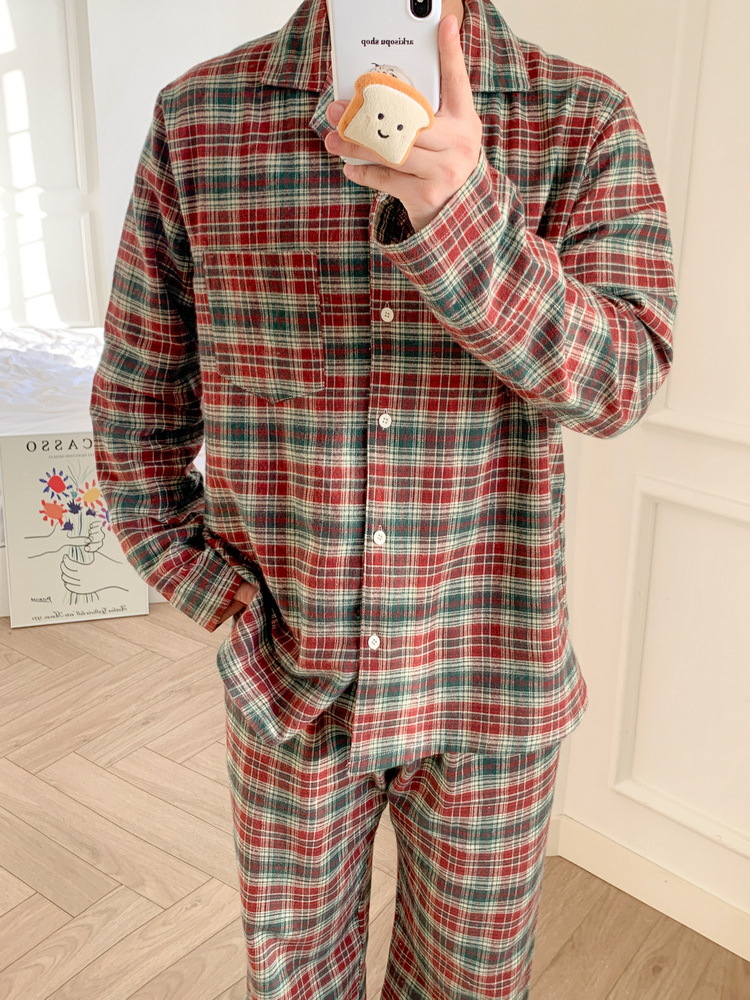 한국 가을과 겨울 새로운 크리스마스 격자 무늬 커플 파자마 긴 소매 느슨한 캐주얼 나이트 드레스 여성의 홈웨어 세트 남성스토어 가기