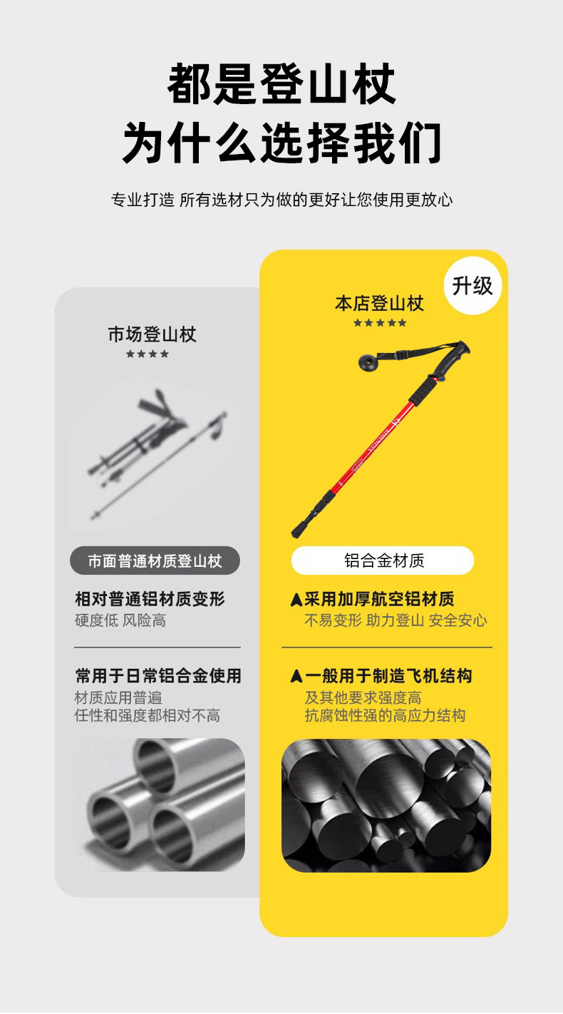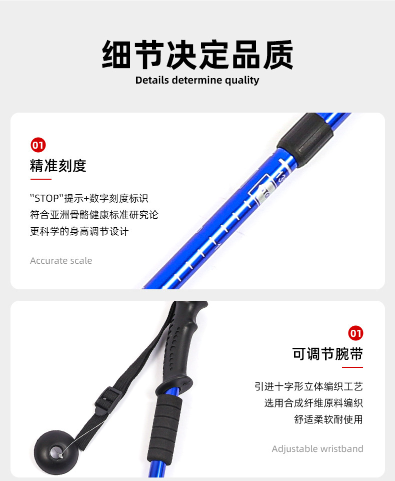 • 注意事项:每节杖身的伸缩范围需在标注的 “最小刻度” 和 “最大刻度” 之间,不可超出范围使用,否则易导致杖节变形或断裂。