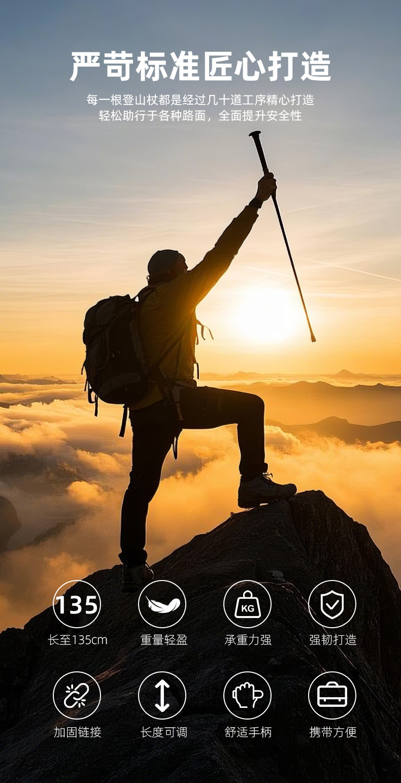 • 旋锁式登山杖:顺时针旋转杖节解锁,拉伸或缩短至目标长度后,逆时针用力拧紧锁定,确保锁扣稳固(可轻轻拉动杖节测试,无松动即可)。