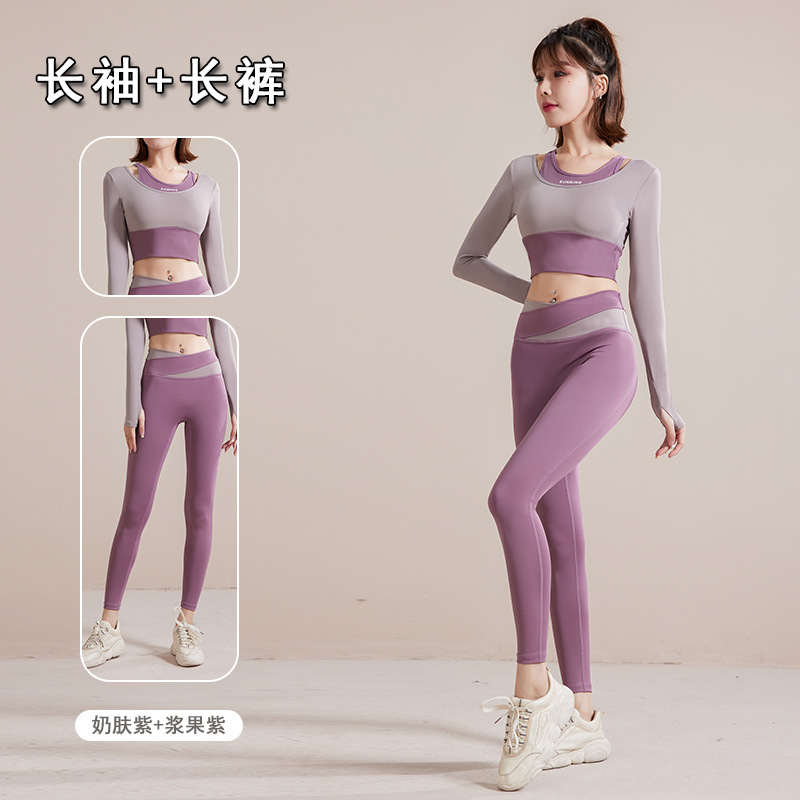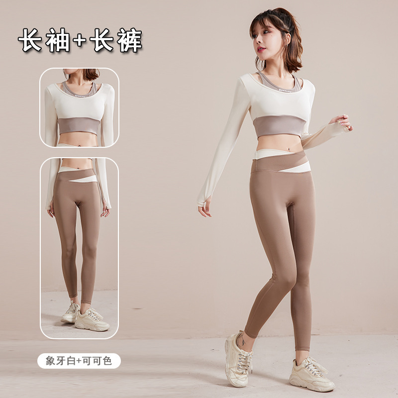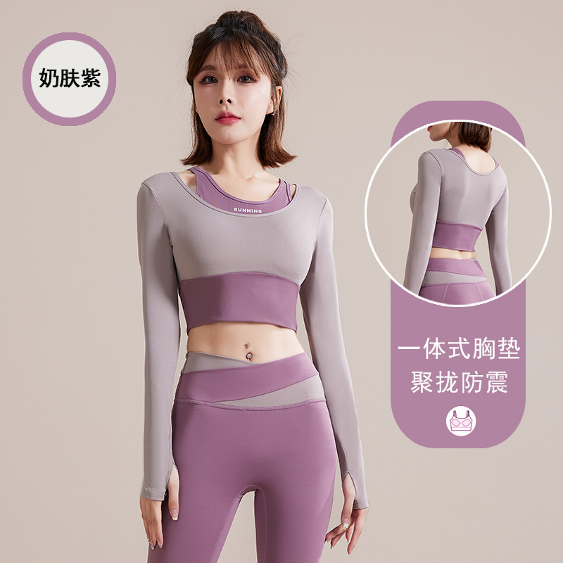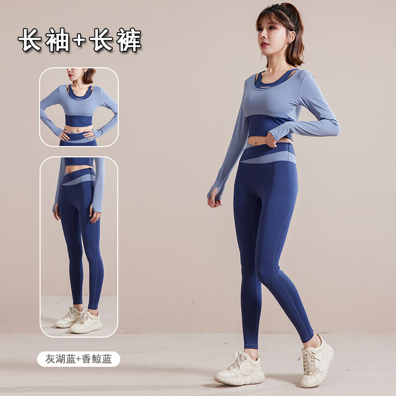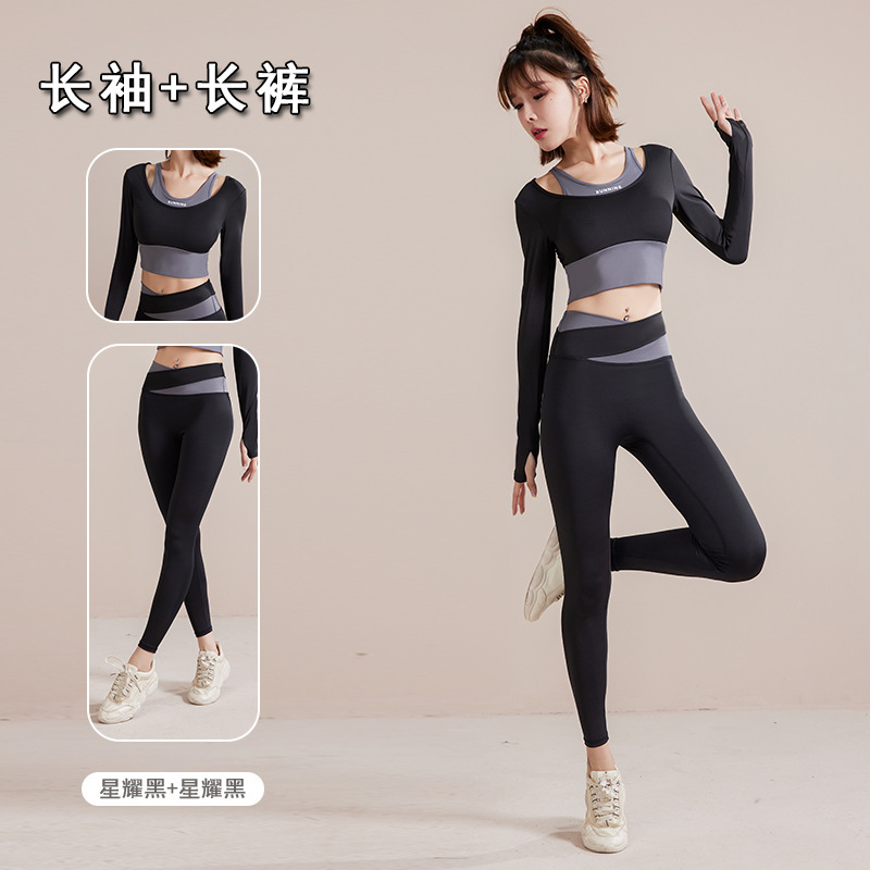 봄과 가을 가짜 투피스 요가 옷 세트 착용 없는 브래지어 대비 컬러 스티칭 스포츠 세트 필라테스 훈련 운동복