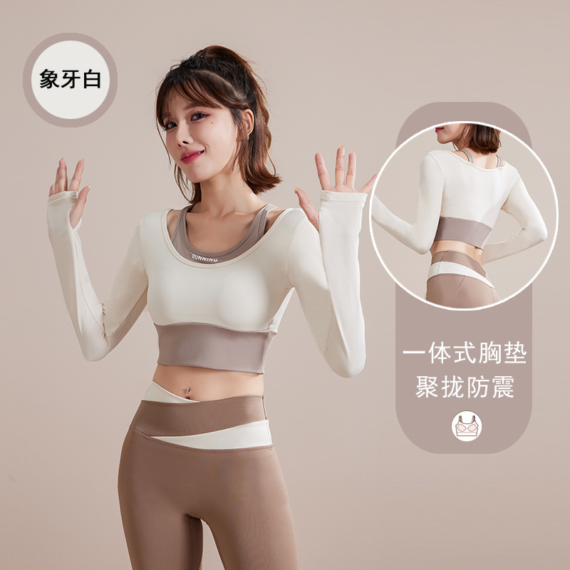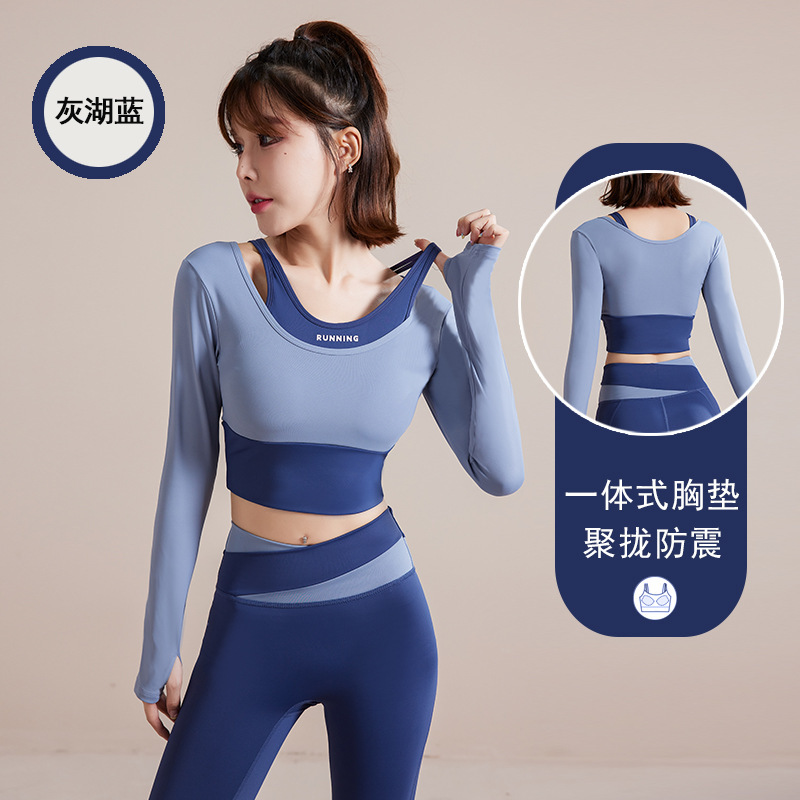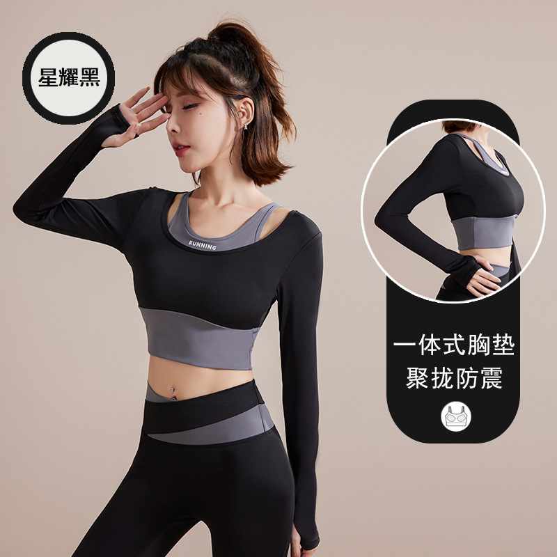 봄과 가을 가짜 투피스 요가 옷 세트 착용 없는 브래지어 대비 컬러 스티칭 스포츠 세트 필라테스 훈련 운동복스토어 가기