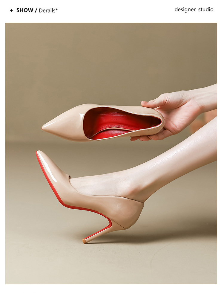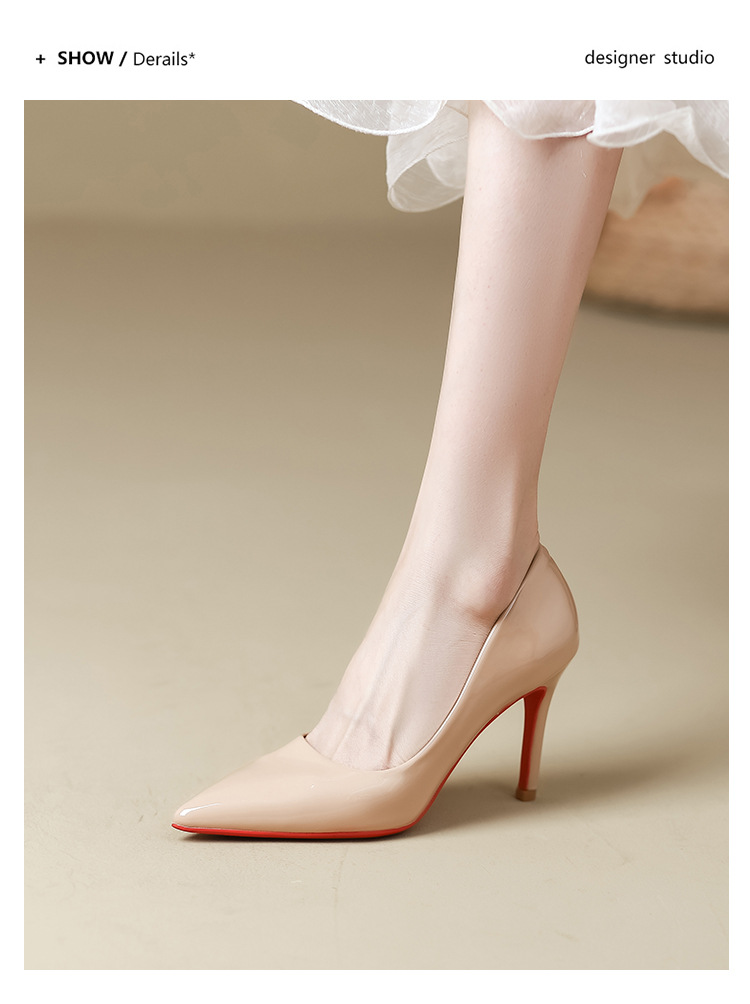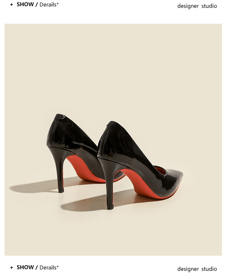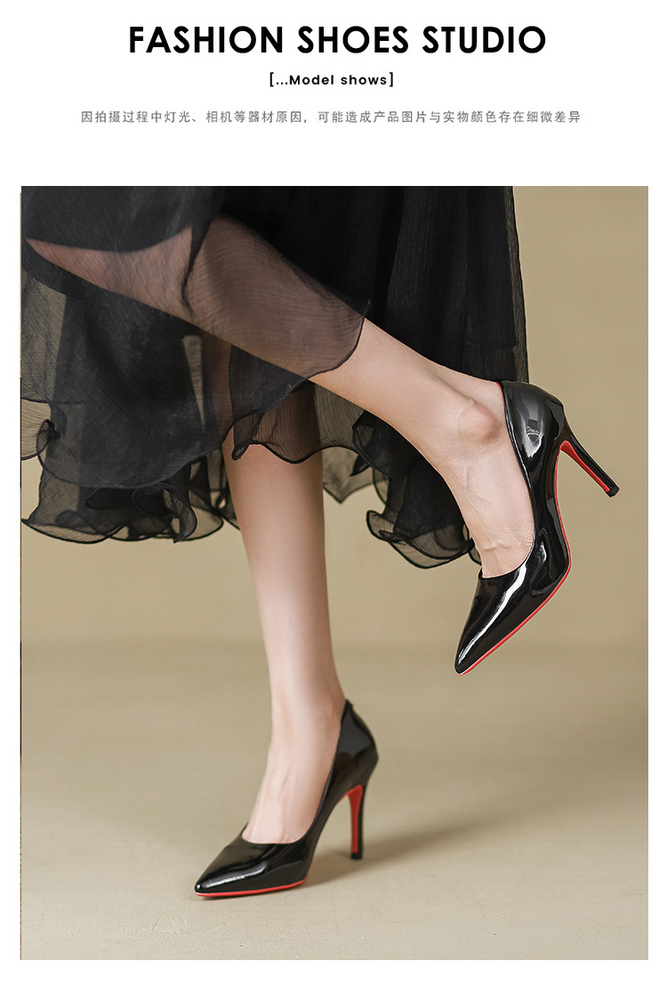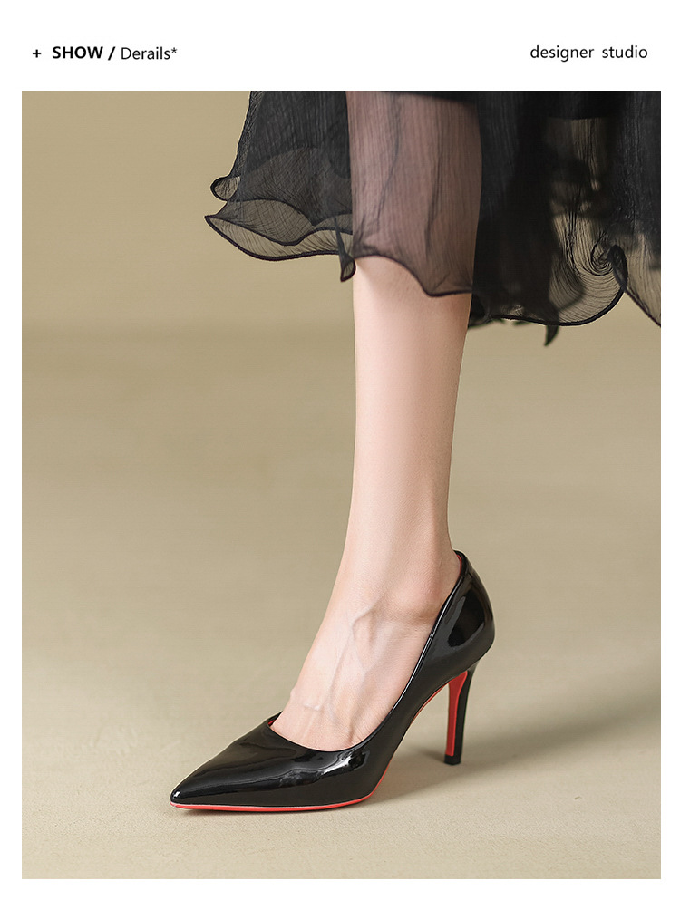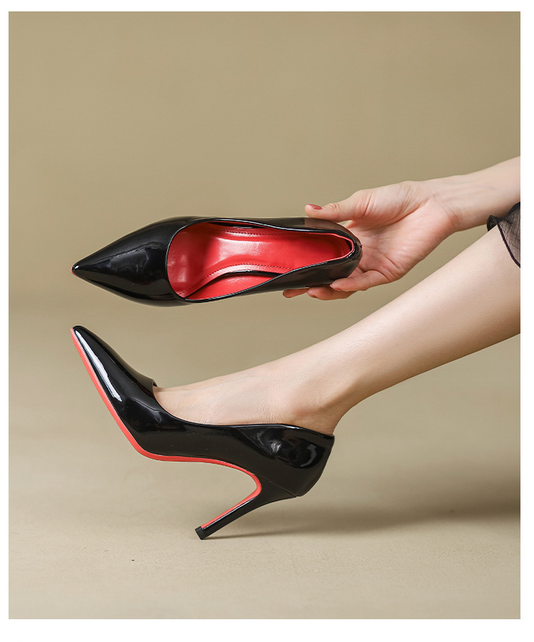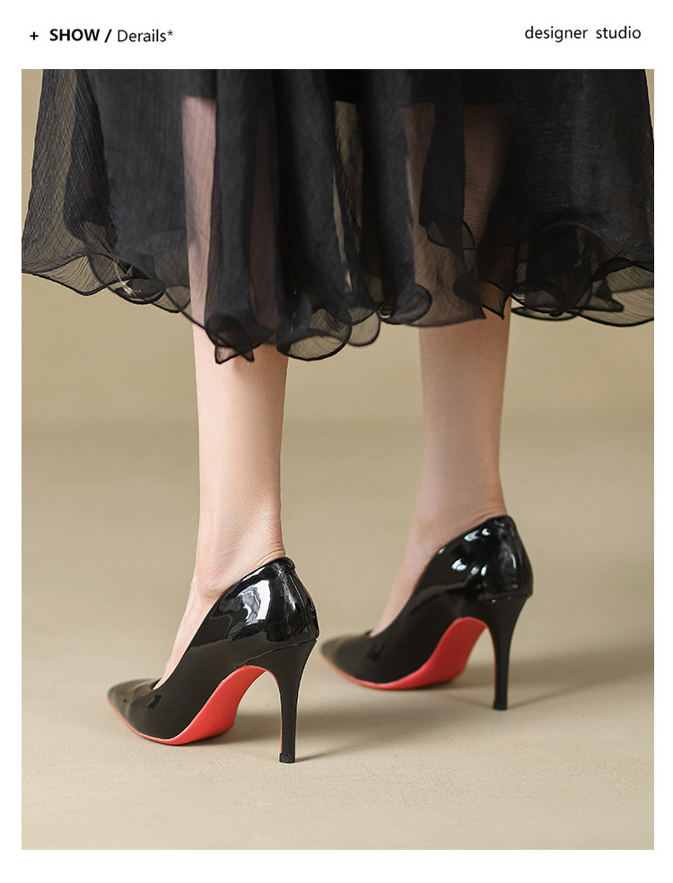 2025년 신상 여성용 레드 하이힐, 뾰족코, 에나멜 가죽 디자인, 유니크하고 인기 있는 블랙 스틸레토 힐, 가을용스토어 가기