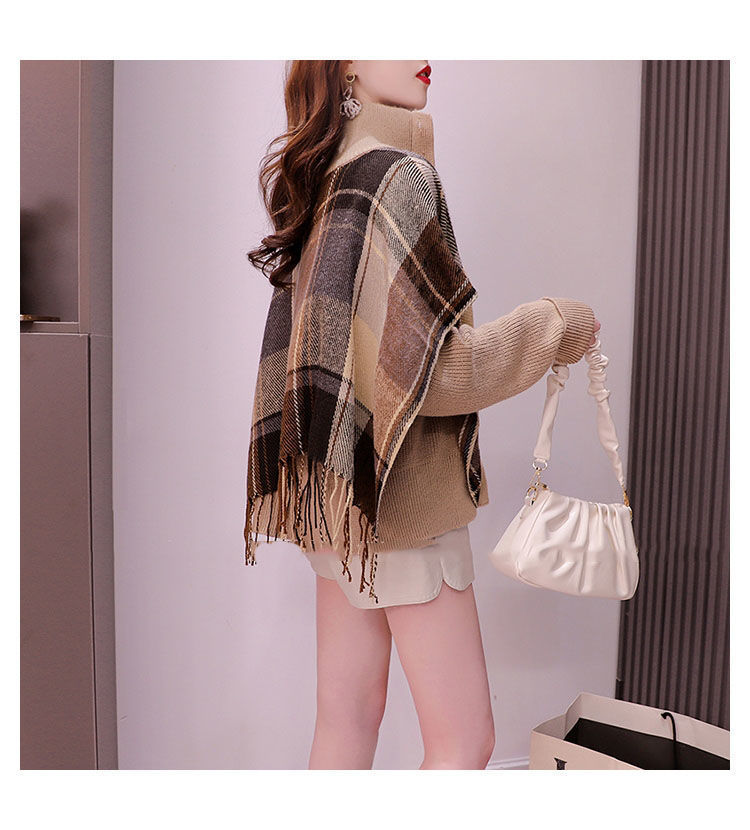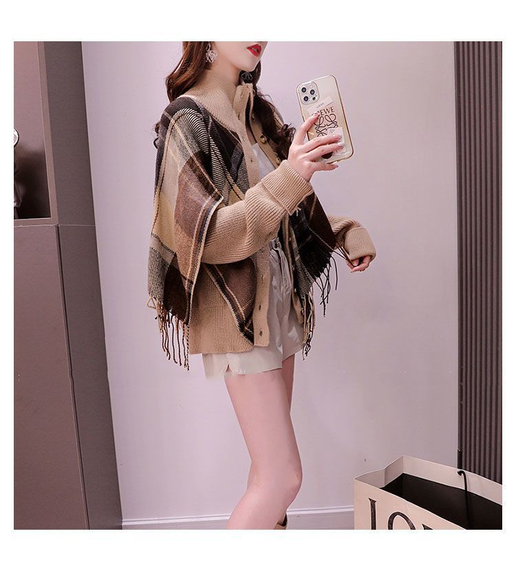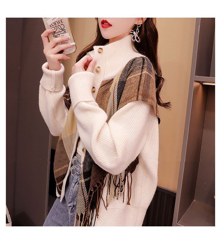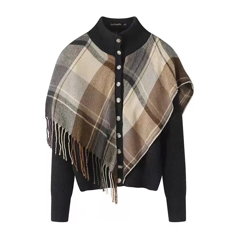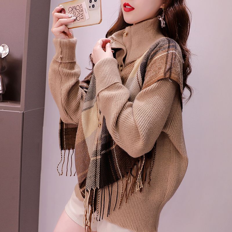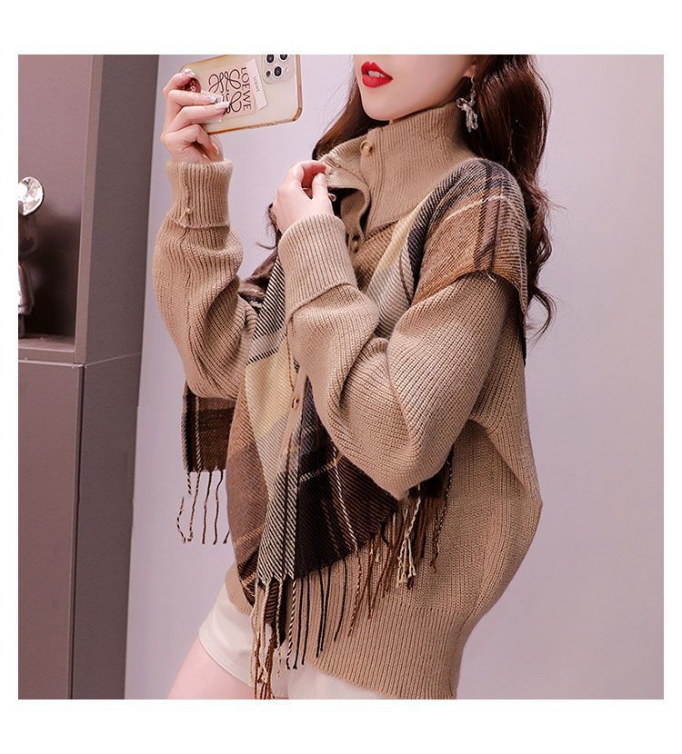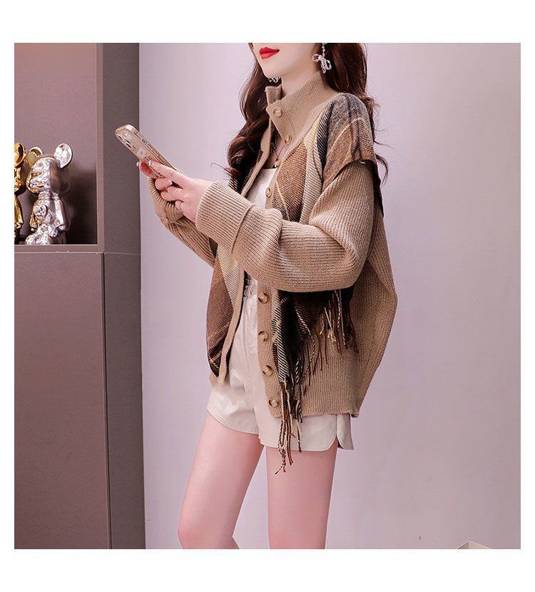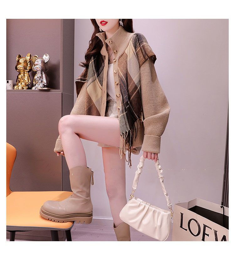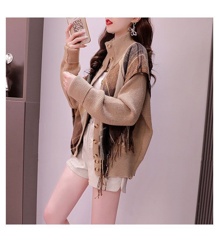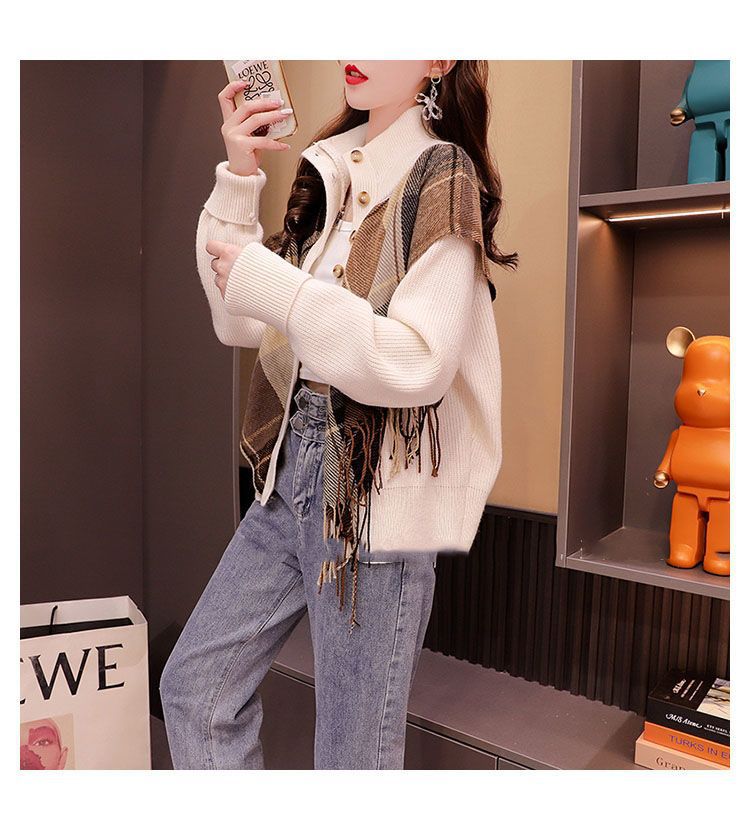 느슨한 가짜 투피스 스탠드 칼라 스웨터 카디건 여성용 2023 디자인 센스 세련된 나이 감소 새로운 가을 니트 재킷