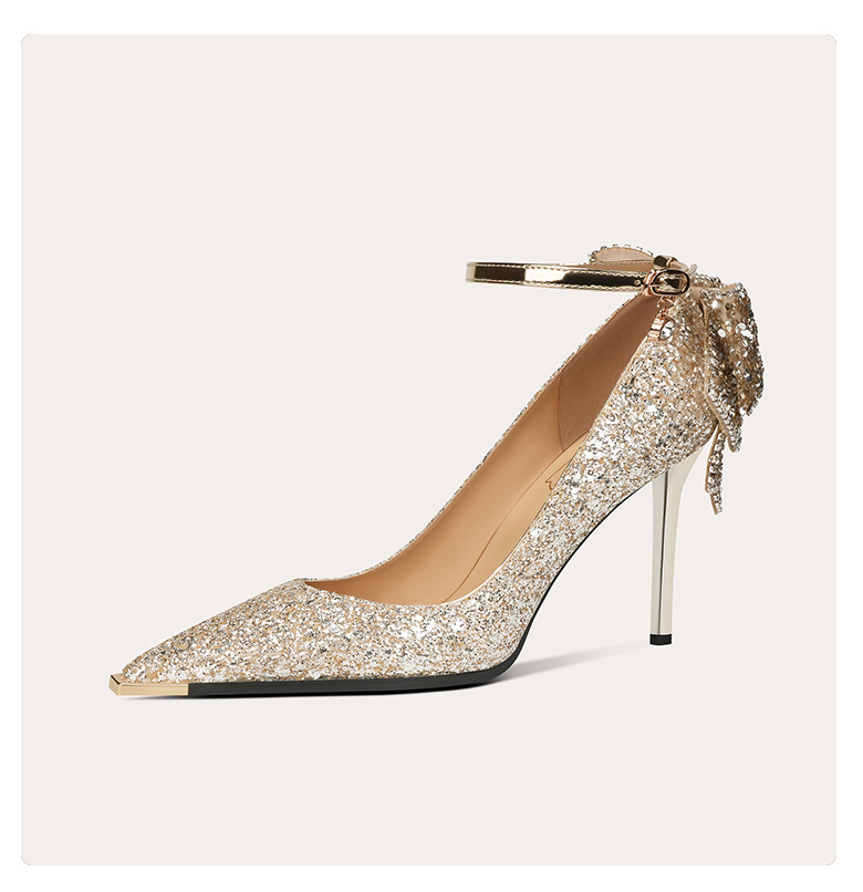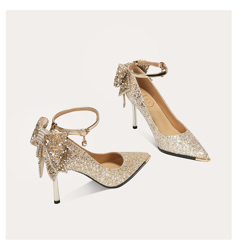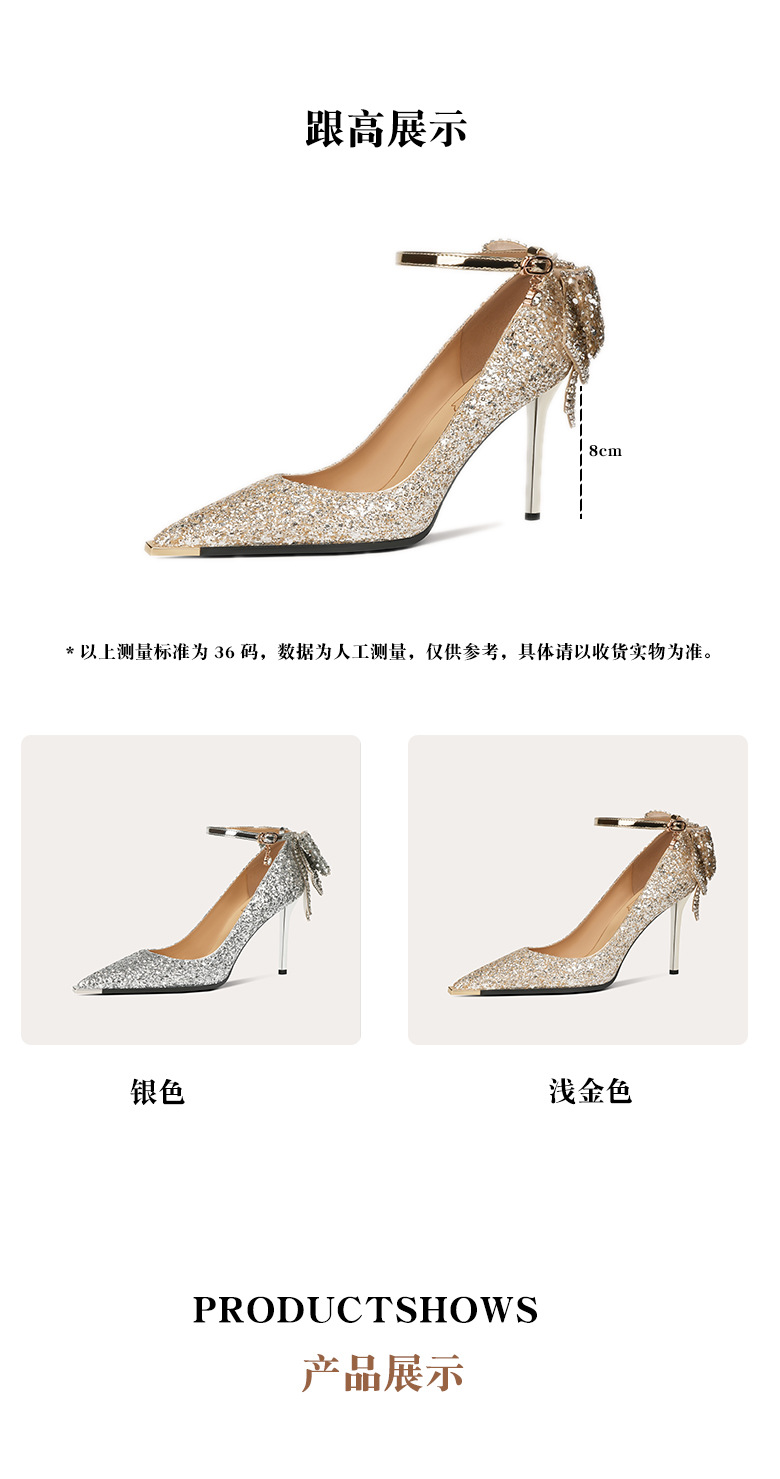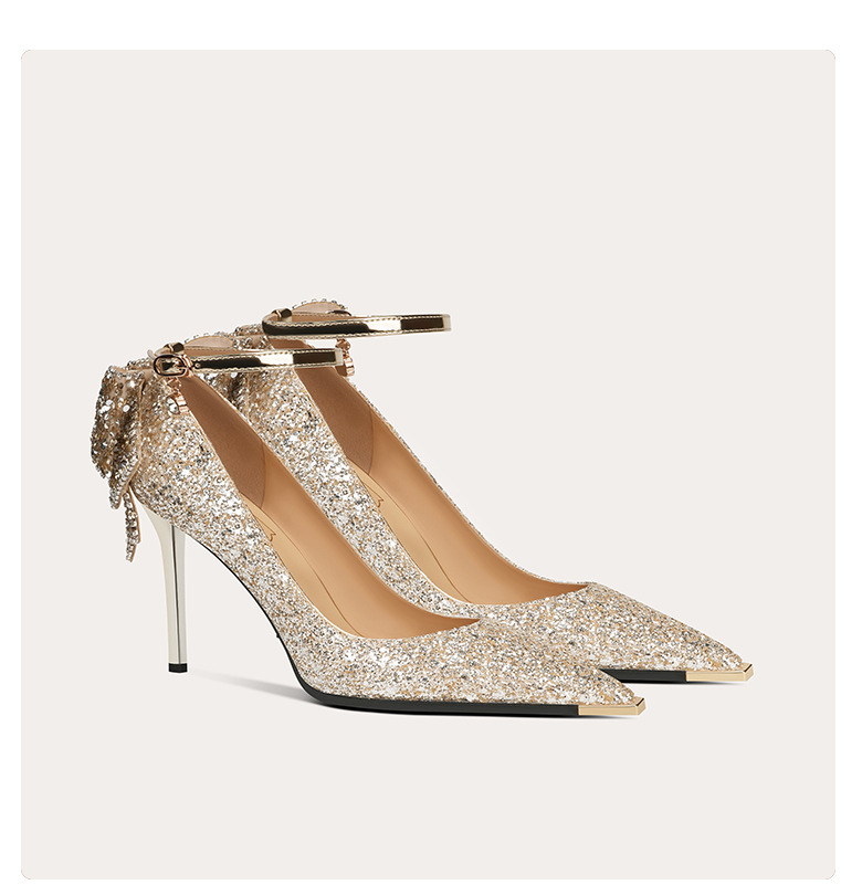 908-5 프랑스 하이힐 여성용 한 단어 버클 활 크리스탈 새로운 금속 뾰족한 웨딩 슈즈 얇은 뒤꿈치 신발